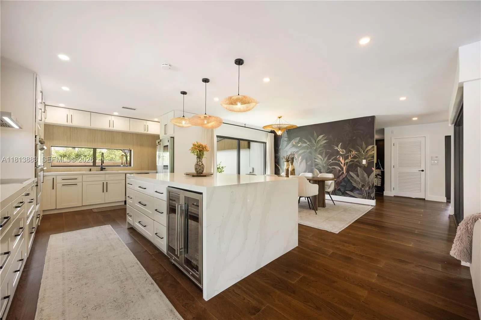 Meticulously renovated and truly turnkey, this 4-bedroom + office + TV room, 3.5-bath pool home sits on a fully fenced 25,353 SF cul-de-sac lot in the highly sought-after Baptist Hospital neighborhood. Gated for privacy and surrounded by lush landscaping, the home welcomes you with a tranquil koi pond and expansive circular driveway. Inside, a dramatic atrium courtyard fills the living spaces with natural light and tropical charm. The home features multiple living and dining areas, a custom-designed office, a fully reimagined chef’s kitchen with high end appliances, oversized eat-in island with storage, hidden walk in butler’s pantry, and a sleek laundry room. All three full bathrooms have been rebuilt with high-end finishes. Major upgrades include new hurricane-impact windows and doors (including garage), all-new plumbing and electrical, new ductwork, insulation, HVAC system, Ethernet wiring to multiple points throughout the home, smart lighting, and custom paneling. Outdoors, enjoy a resurfaced pool, landscape lighting, fruit tree grove, koi pond, and total privacy. All major systems replaced within the past 2 years. Move-in ready and built to the highest standard.