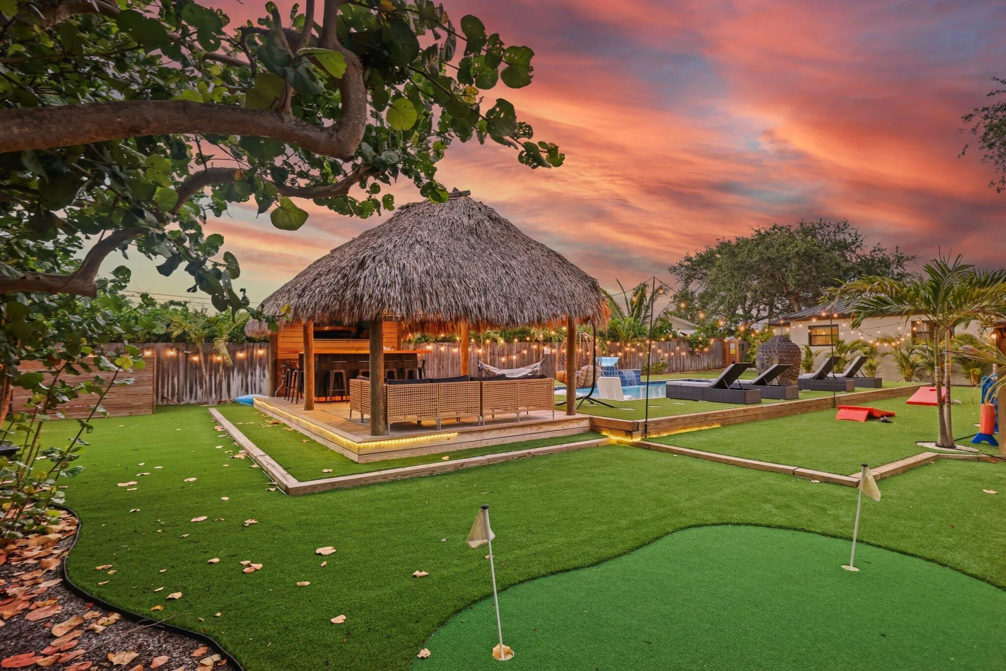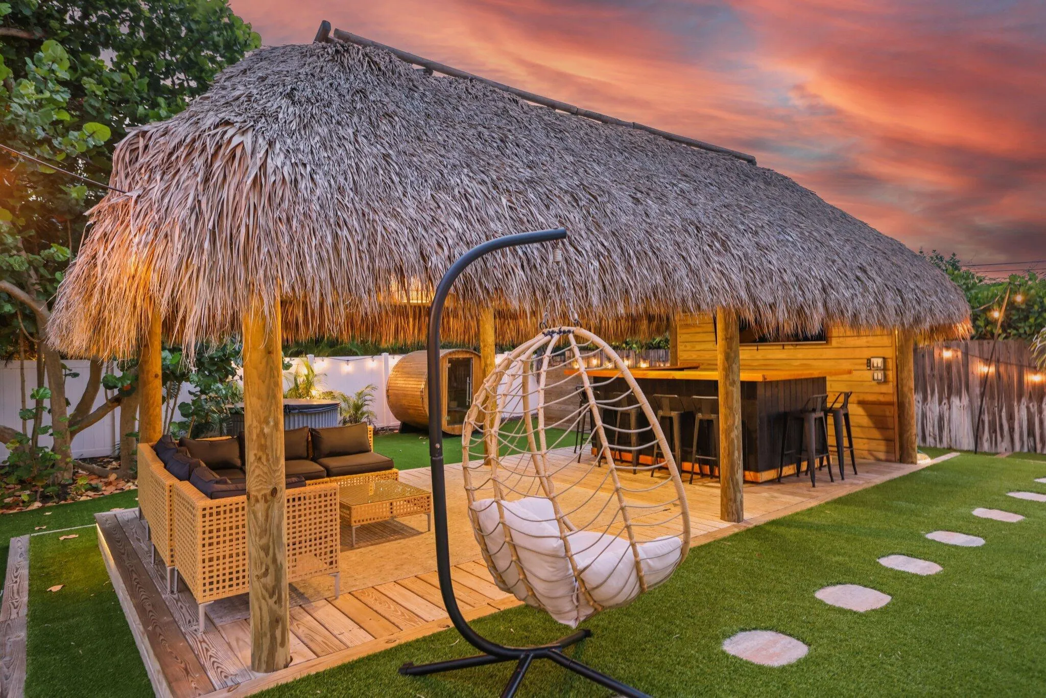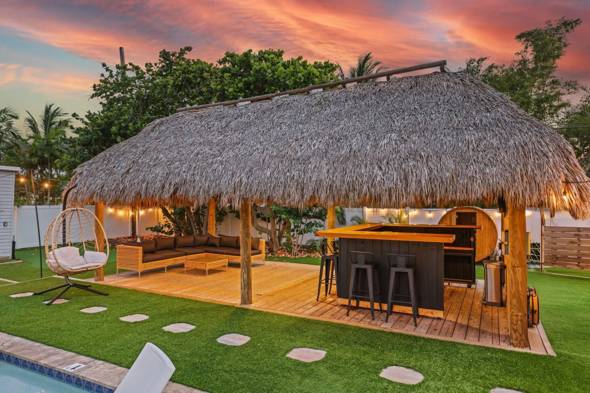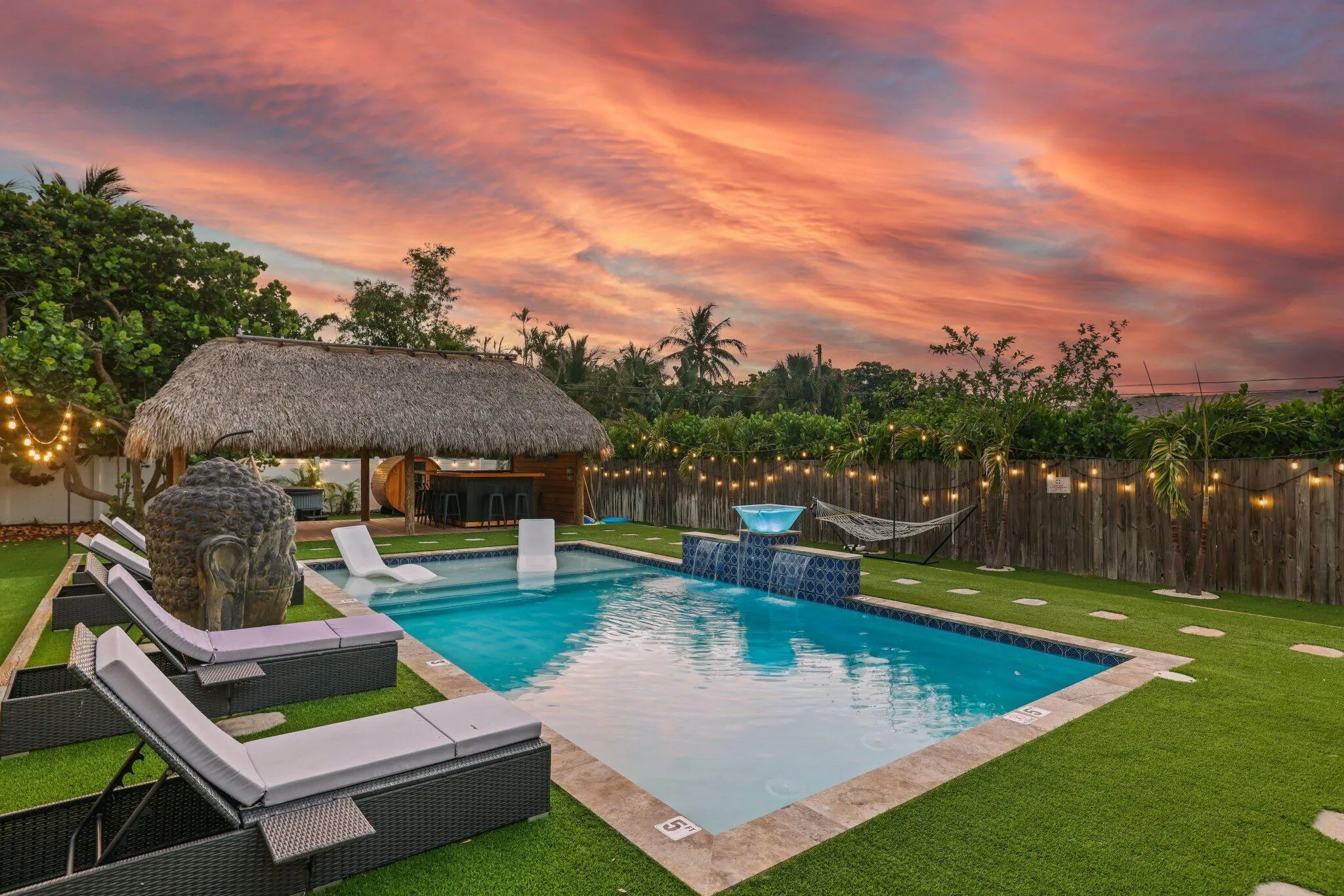 Introducing a rare opportunity to own a resort-style retreat in the heart of downtown Delray Beach. This stunning 3-bedroom home is perfectly positioned in one of South Florida’s most vibrant and desirable neighborhoods. Set on a spacious 0.26-acre lot, the property offers both luxurious living and exceptional investment potential. Step into a tropical backyard oasis designed for relaxation and entertainment. Enjoy a sparkling pool, soothing hot tub, and private sauna–creating the ultimate outdoor escape. The lushly landscaped yard features a tiki hut with a built-in BBQ grill and ample outdoor seating, ideal for hosting gatherings or enjoying a quiet evening under the stars. Inside, the home utilizes a thoughtfully designed layout with a bright, functional kitchen,