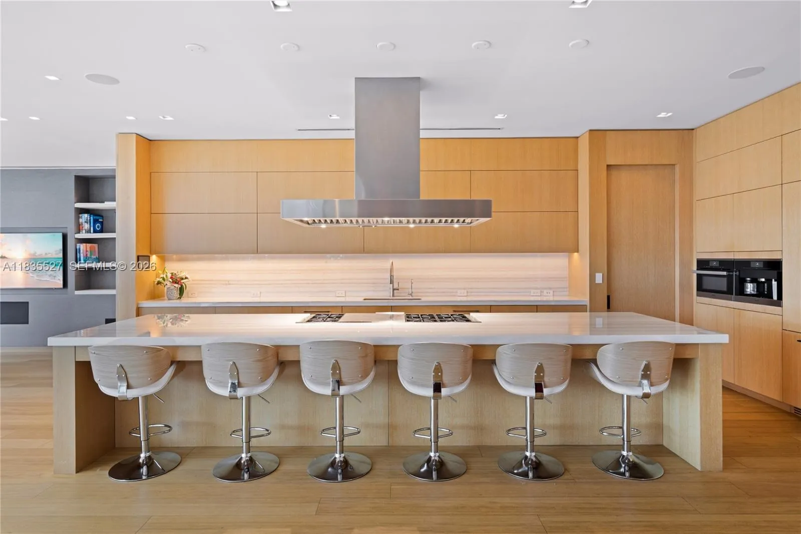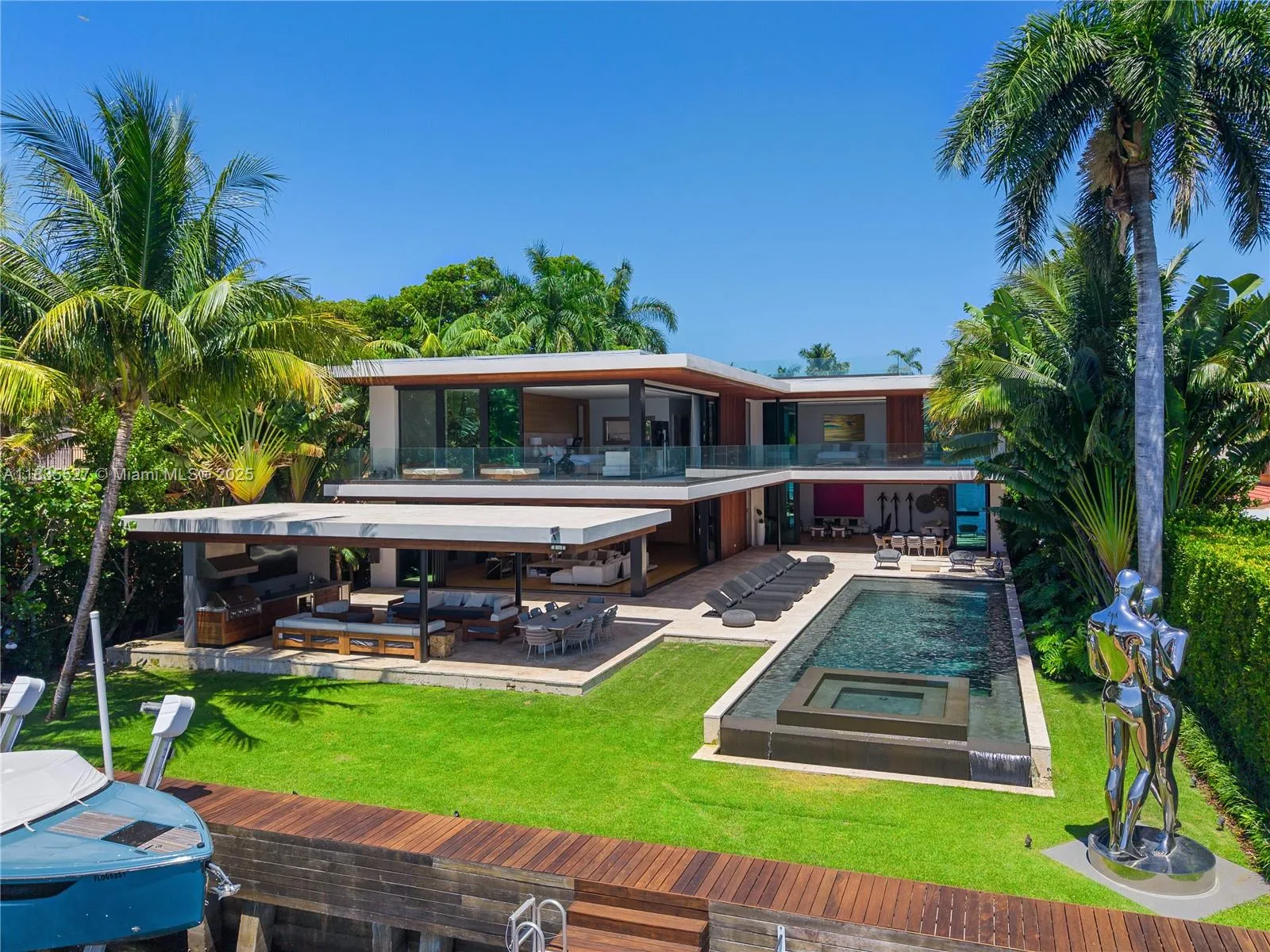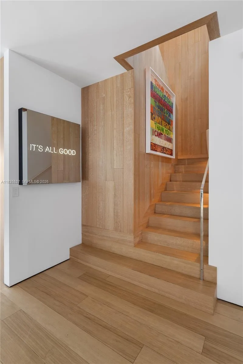 RARE VENETIAN ISLANDS TROPICAL MODERN WATERFRONT ESTATE WITH DIRECT DOWNTOWN MIAMI CITY SKYLINE VISTAS OVER THE BAY ON THE COVETED SOUTH-SIDE OF SAN MARINO ISLAND! Stunning Bayfront Residence Perched on OVERSIZED 15,750SF LOT & A HALF with 90FT of Waterfrontage. Multi-Vessel IPE Dock w/Lift & Jet Ski platforms. 5 Large Suites each with Ensuite Baths + 2 Powder Rooms + Office + Family Room. Theater w/Surround Sound & Lounging Beds. Open modern floor plan, wrapped by 10 FT Telescopic Fleetwood Glass Doors, provides Seamless Indoor/Outdoor Living. Blonde Oak Floors & Gourmet Eat-in Kitchen with Gas Range & Stainless Steel Miele Appliances sits adjacent to Catering Kitchen with Pantry & Separate Service Entrance. Comfortable Breakfast Area, Wine Room & Bar. Spacious Primary Suite draped by Panoramic Sunsets over Miami Skyline with two dressing rooms + Bookmatched Marble Bath with Rain Shower & Deep Soaking Tub. Wraparound Terraces in Keystone with Stairs lead to an Expansive Rooftop Entertaining Area—Ample Green Space with Architectural Dark Bottom Negative-edge Pool & Spa. Modern Gazebo includes a Chef’s Summer Kitchen + Cabana Bath. Privacy Gate + 2 Car Garage.