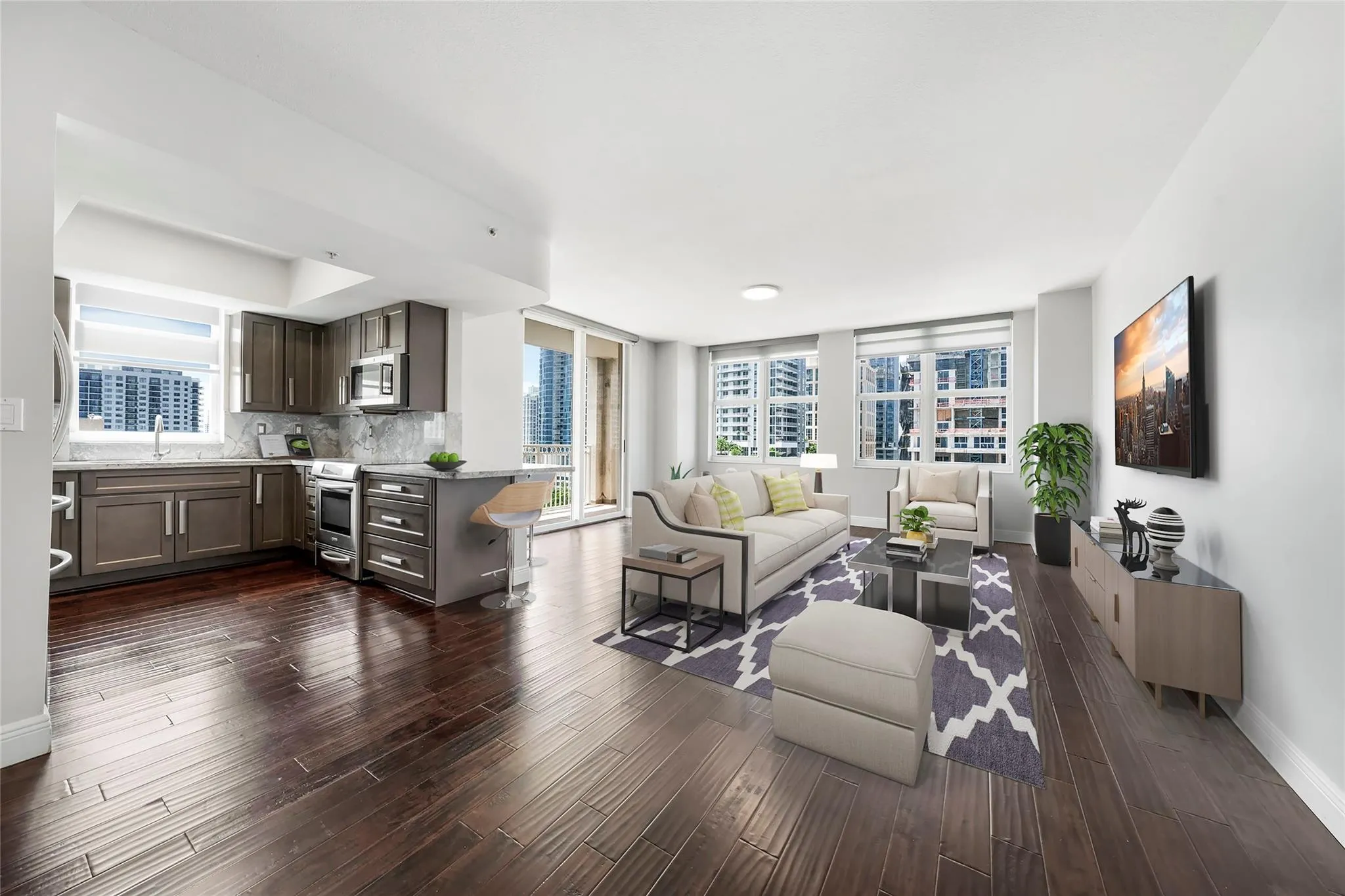 Welcome to this stunning 11th-floor CORNER UNIT in the heart of Las Olas! This rarely available 3-bed, 2-bath.rnThe bath floor plan boasts wood floors and a completely remodeled kitchen with KitchenAid Artisan appliances. Enjoy the convenience and comfort of motorized blackout shades in the bedrooms, a new water heater, a newer AC unit, and updated washer and dryer. Nu River Landing is a sought-after building with resort-style amenities, including a gym with spin and yoga studios, pool, basketball court, meditation garden, sauna, jacuzzi, business center, and more. EXCELLENT LOCATION! Situated steps away from shops, world-class dining, art galleries, nightlife, and just 10 minutes from the beach and airport. Don’t miss out on this exceptional opportunity!