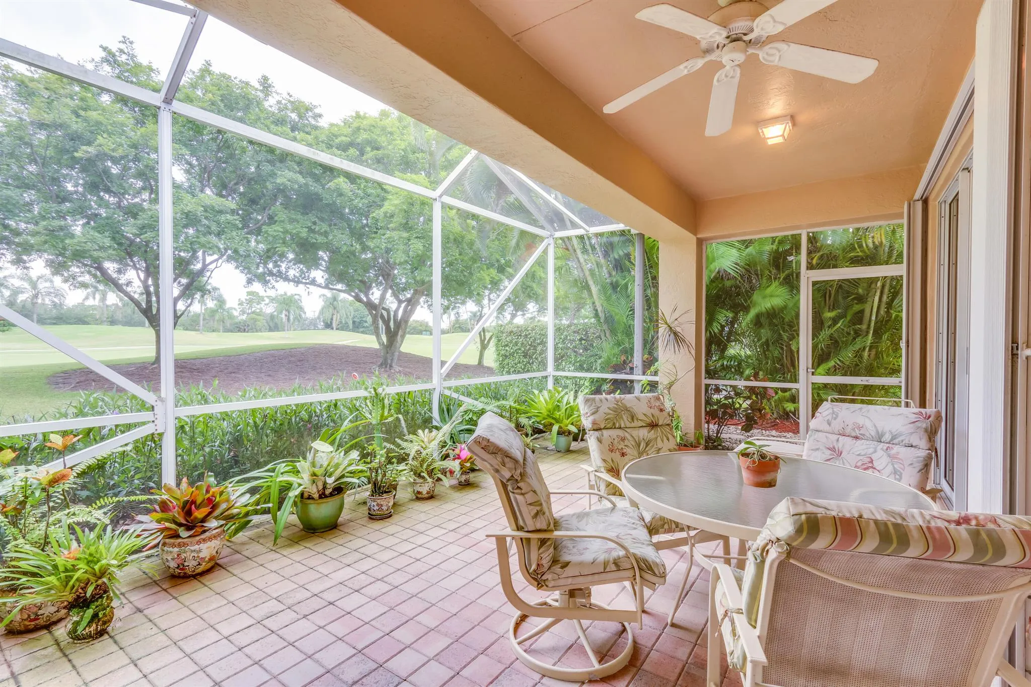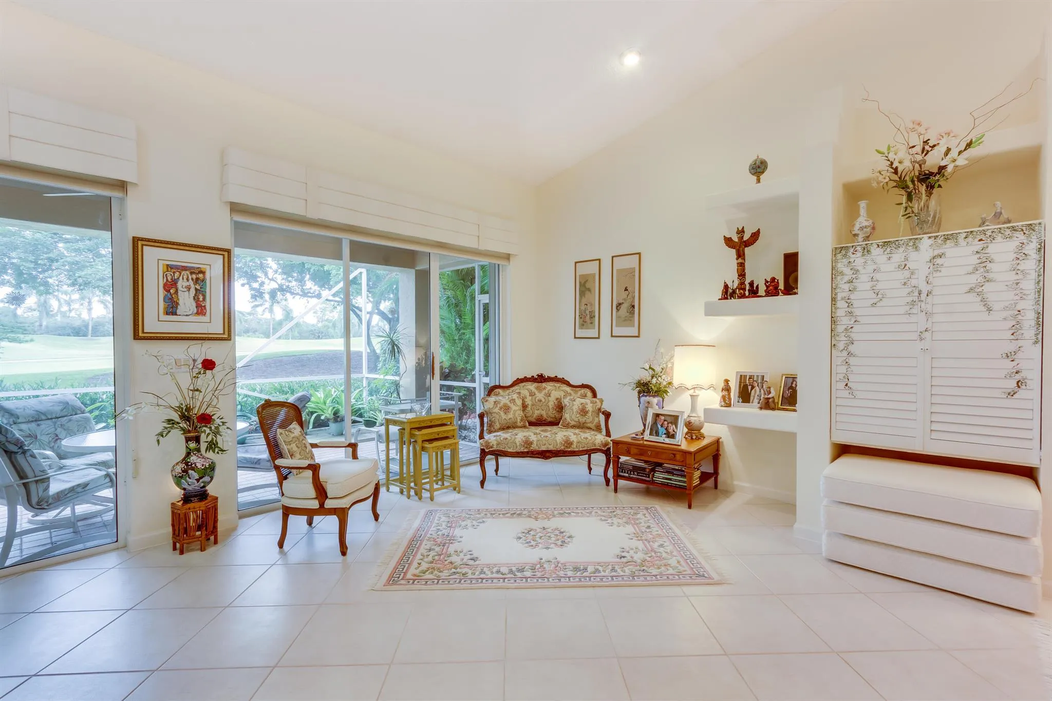 Rarely available annual rental with Gold Membership available to transfer! Property is offered Fully furnished and turnkey. Wake up to beautiful sunrises and peaceful golf course views in this spacious 3-bedroom residencel. The Bentley floor plan offers a bright, open layout with six sliding glass doors leading to a covered, screened patio–perfect for relaxing with your morning coffee or evening wine. The kitchen opens to the family room and breakfast area, all overlooking the fairway. The primary suite features a wall of windows, a luxurious Roman tub, and skylights for natural light in both bathrooms. The third bedroom is currently set up as an office/den. Enjoy light-filled living and serene scenery every day. Telephine, Internet, Cable TV and Security are included.