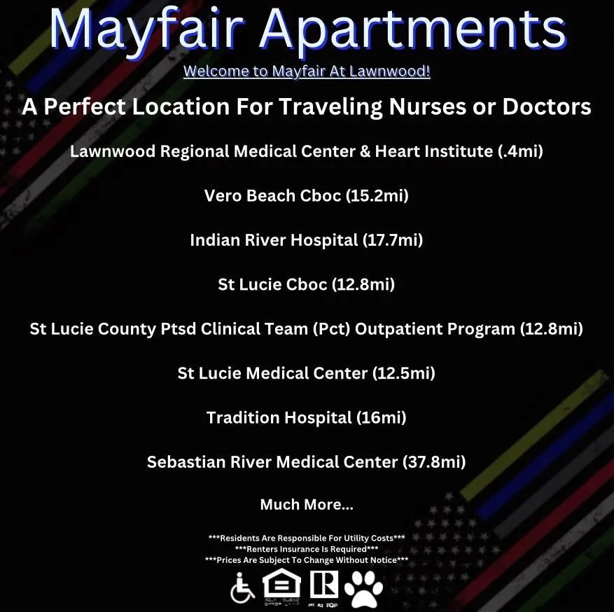 The Mayfair at Lawnwood Apartments, A Luxury Rental Community, is in a prime location these apartments provide easy access to the Lawnwood Medical Center, Indian River State College and FAU’s Harbor Branch Oceanographic Institute as well as cultural and recreational amenities. Just minutes away from the beach & downtown Fort Pierce. The apartments feature high-end finishes, sleek kitchens with modern appliances, and spacious bedrooms, large walk-in closets, and large bathrooms creating a sophisticated and comfortable environment for residents.Tours Available Now By Appointment Only.