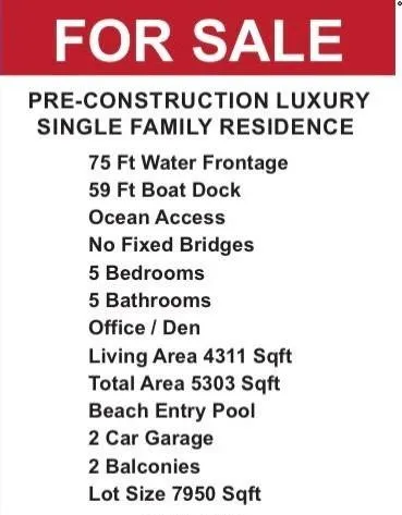 Welcome to your future dream home that will be completed in December 2025. This spectacular pre-construction waterfront home is designed for elegant coastal living. This five bedroom residence, plus a dedicated office/den will offer over the top comfort and modern sophistication. Prime waterfront lot built per the new elevation requirements with direct ocean access and no fixed bridges, this property is a boater’s paradise. Inside the open concept living spaces it will flow seamlessly into a the kitchen outfitted with top-tier appliances. Each of the five spacious bathrooms will be crafted with detail. The expansive sliding glass doors invite indoor and outdoor living to an opening to a resort style backyard with a pool, summer kitchen and water views. The private dock up to a 75 ft boat.