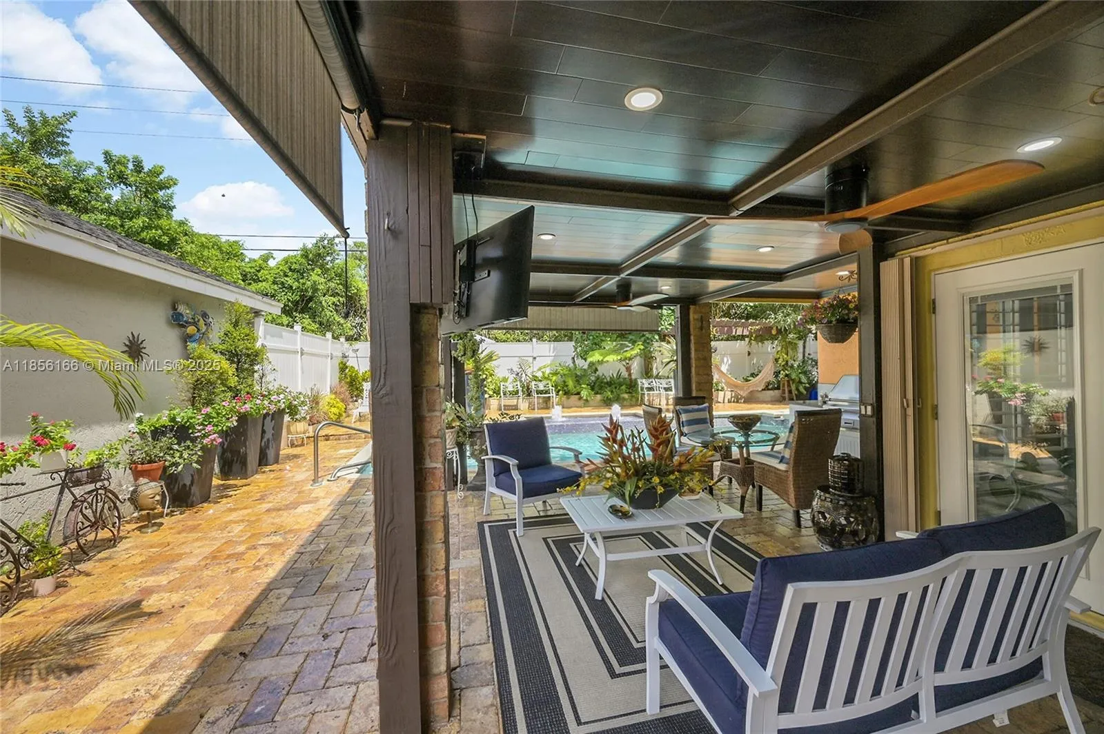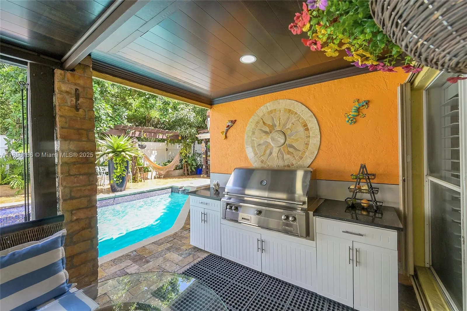 Beautifully upgraded 4-bedroom (2 suites), 3.5-bath home with vaulted ceilings, crown moldings, plantation shutters, and hardwood floors throughout. Spa-style bathrooms with rain showers and jets; master bath with Italian marble floors and walls. Chef’s kitchen with newer appliances,Sub-zero refrigerator, waterfall quartz island, hot tower, tankless water Heater. Outdoor summer kitchen with Alfresco BBQ grill/with Rotisserie, pizza oven, under wood-paneled patio ceiling. Oversized pool with spa blower, spa bench with jets, marble pool deck, and tropical fruit trees.Also featuring are hurricane shutters, brick driveway, oversized garage with custom closet, upgraded half bath, mud room, and hi-hat lighting throughout. HOA offers tennis courts, pickleball courts, and kids playground.