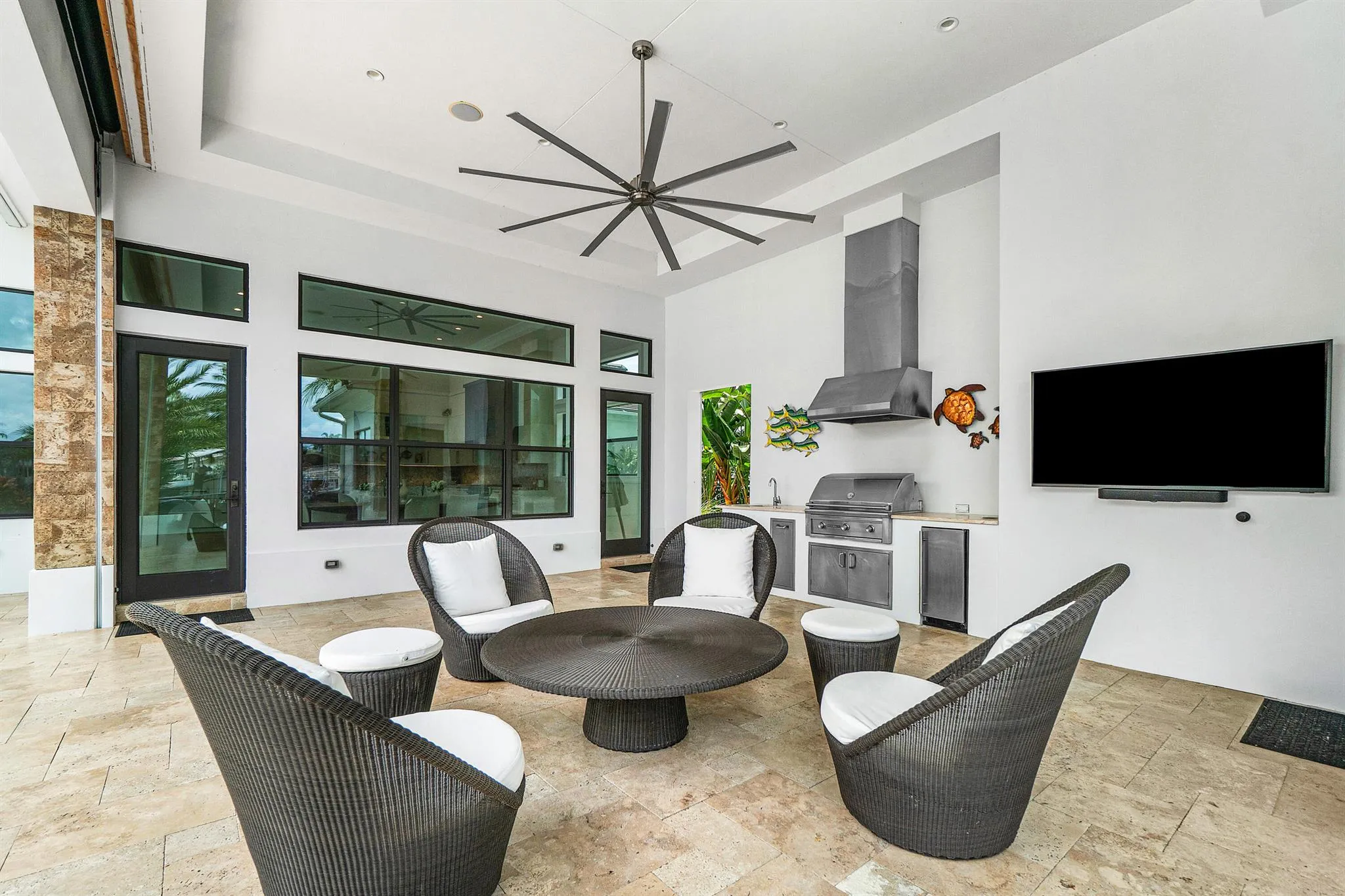 Waterfront Luxury Living in Prime Boater’s Location!Welcome to this exceptional waterfront residence offering over 130 feet of deep water frontage just one canal from the Intracoastal. Built in 2017, this custom-designed residence features 4 bedrooms and 4 baths, including a private guest house, all situated on a premium 1/3-acre lot at the widest point of the canal for optimal water views and turning radius.The grand great room welcomes you with soaring 16′ ceilings and breathtaking waterfront vistas. Ideal for boating enthusiasts, the property includes 4 slips (36 ft. -30,000 lb. lift , 34 ft. 14000 lb. lift , 55 ft., and a 28′ water slip) just a one-minute ride to the Intracoastal.