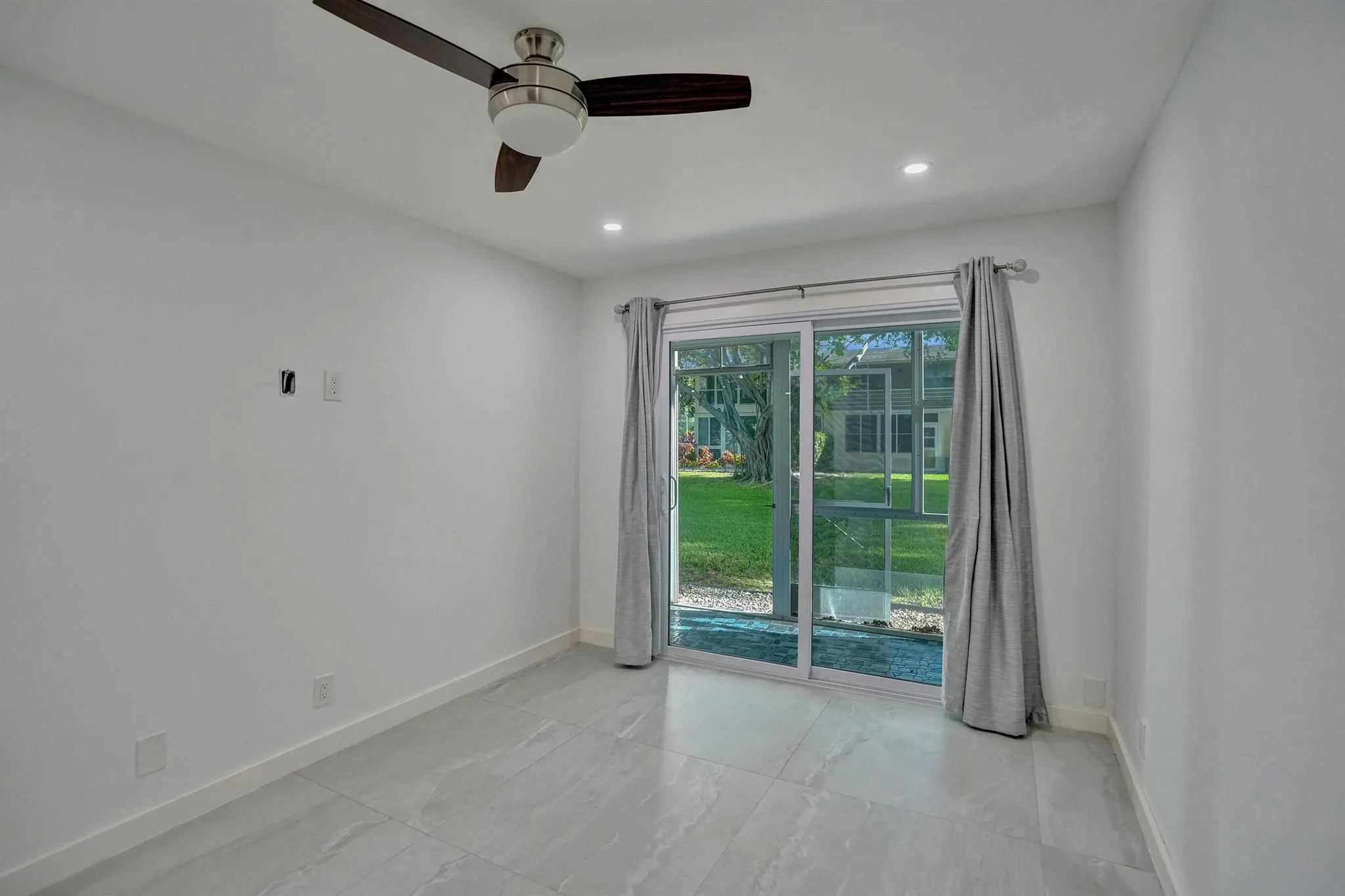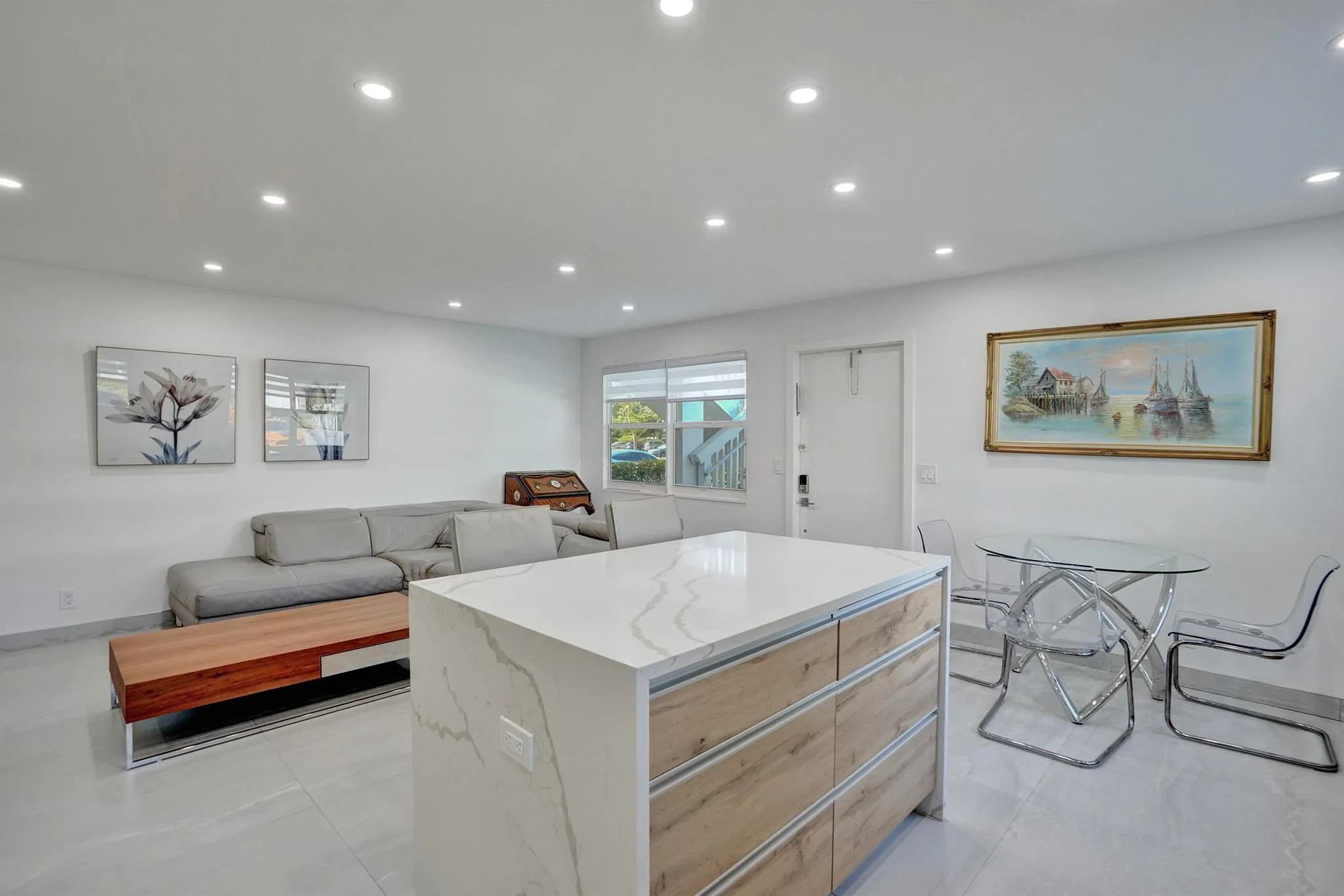 Beautifully renovated and filled with natural light, this first-floor corner unit showcases high-end finishes and thoughtful upgrades throughout. The custom kitchen features quartz countertops, a full backsplash, under-cabinet lighting, and all-new appliances. Additional highlights include all impact windows, a new electric water heater, updated electrical panel, recessed lighting in every room, and 36×36 porcelain tile flooring throughout. Both bathrooms have been completely redone, and the unit is enhanced by custom built-in closets and a sleek built-in TV unit.Located in one of the few two-story condo buildings, this corner unit benefits from wraparound windows and a spacious, airy feel. The assigned parking space is just steps from the front door, offering exceptional convenience.