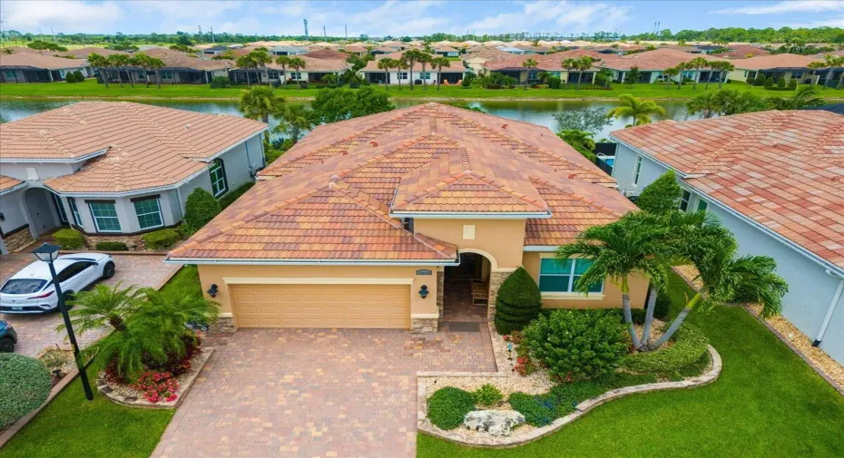 Beautiful Lago Model at Verano (PGA Village) with mature landscaping & lake View. Features CBS Construction, Barrel tile roof, paver driveway & walkway. Boasts open floor plan, volume ceilings, tile that looks like wood planking throughout, crown molding, Plantation Shutters & Impact Hurricane windows & doors. Hosts 2 BR’s, Den, 2 BA’s & 2 Car Garage. Fabulous open kitchen with quartz counter tops, glass back splash, large Island, light soft close 42” cabinets, walk in pantry w/ wood shelves, wall oven, microwave, cook top, Stainless steel appliances & hood. Spacious Master Suite with natural lighting, tray ceiling, lovely Master Bath includes large shower & dual sinks. Walk in closet with wood shelves. Screen enclosed lanai with covered area & tranquil lake setting.