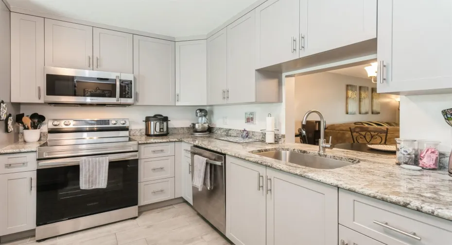Completely Renovated! This stunning 2-bedroom, 2-bathroom corner unit features an updated kitchen with granite countertops, custom cabinetry, and brand-new stainless steel appliances. Enjoy custom lighting, ceiling fans, and wood plank-tile flooring throughout. Impact-resistant windows are installed throughout, and a three-track sliding glass door opens to a spacious Florida room. New LG stackable washer & dryer inside unit.Both bathrooms have been updated with sleek vanities and contemporary tile finishes. The primary bathroom features a floor-to-ceiling tiled walk-in shower. Located in Covered Bridge, a 55+ community, pet friendly that allows rentals after 12 months of ownership. A short distance away from Okeeheelee Park, shopping, and access to both I-95 & Turnpike.