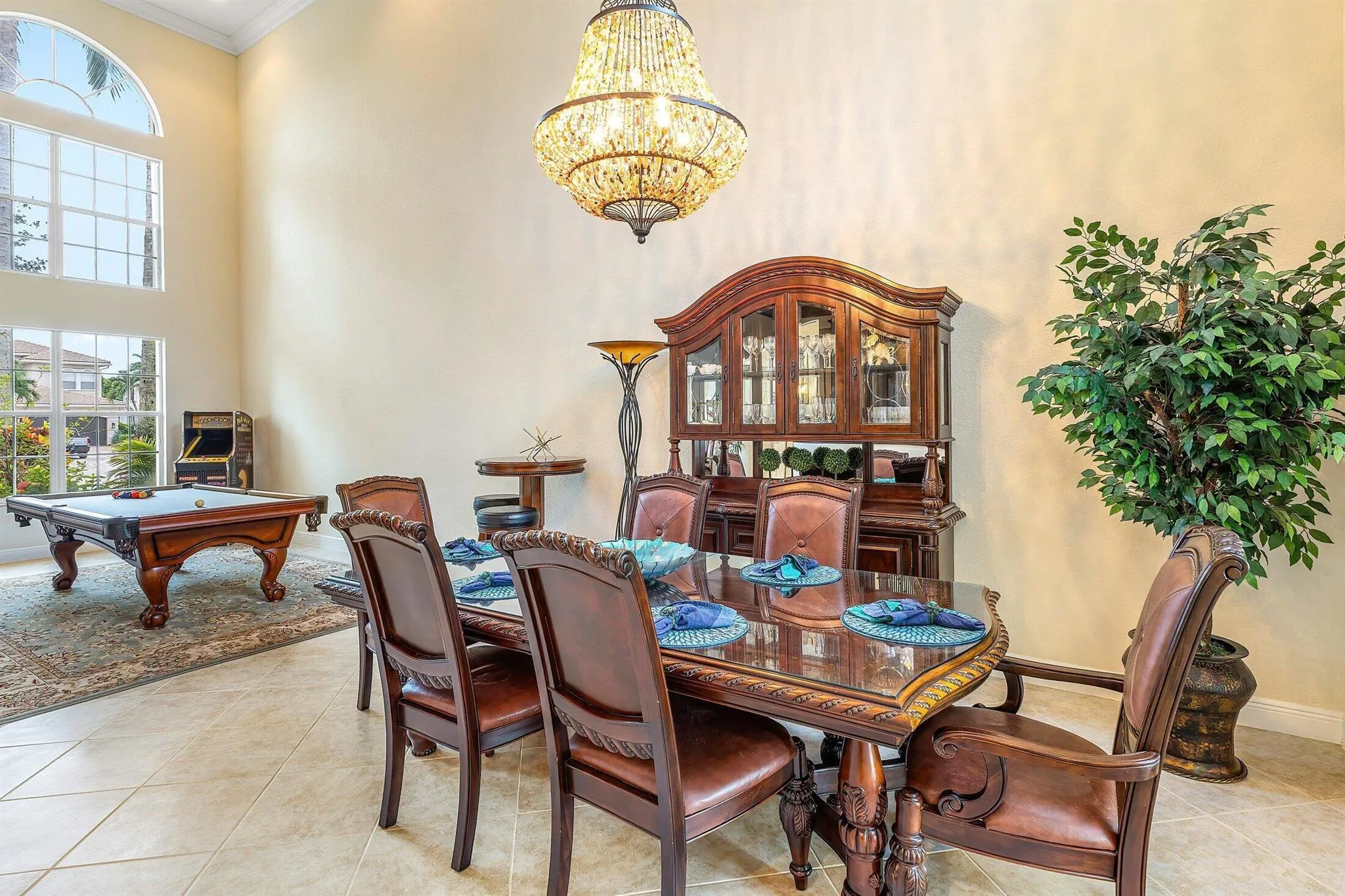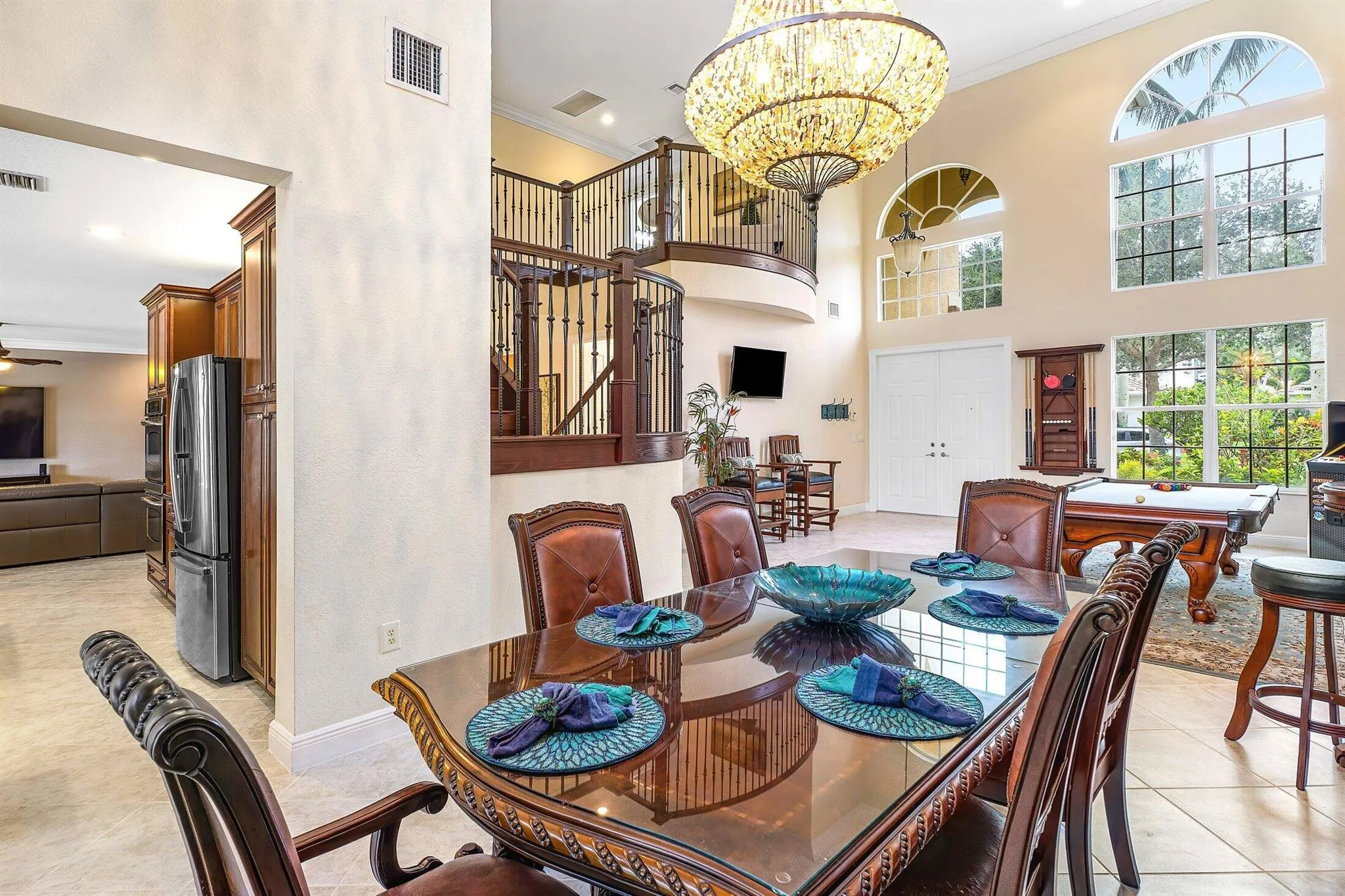 This Spectacular 5 Bedroom Home with Resort Style Backyard in Canyon Isles is Nestled on a Quiet Culdesac. Pulling Up to the Impressive Home Notice the Lush Landscaping that Surrounds You. Entering You will be Greeted by Incredible Two Story Volume Ceilings that Bring In Tons of Natural Light. The Chef’s Kitchen Boasts 42” Wood Cabinets, S.S. Appliances and a Walk-In Pantry. The 1st Floor Guest Room has a Hand Painted Mural that Creates a Perfect Playroom. French Doors from the Family Room Lead to Your Private Backyard Resort. The Covered Patio with Tongue & Groove Wood Ceiling and Stone Accents Overlooks a Custom Summer Kitchen with Pergola and a Massive Freeform Pool. There are Hand Scraped Wood Floors Throughout the Second Floor. .The Huge Primary Bedroom has a Large Sitting Area.