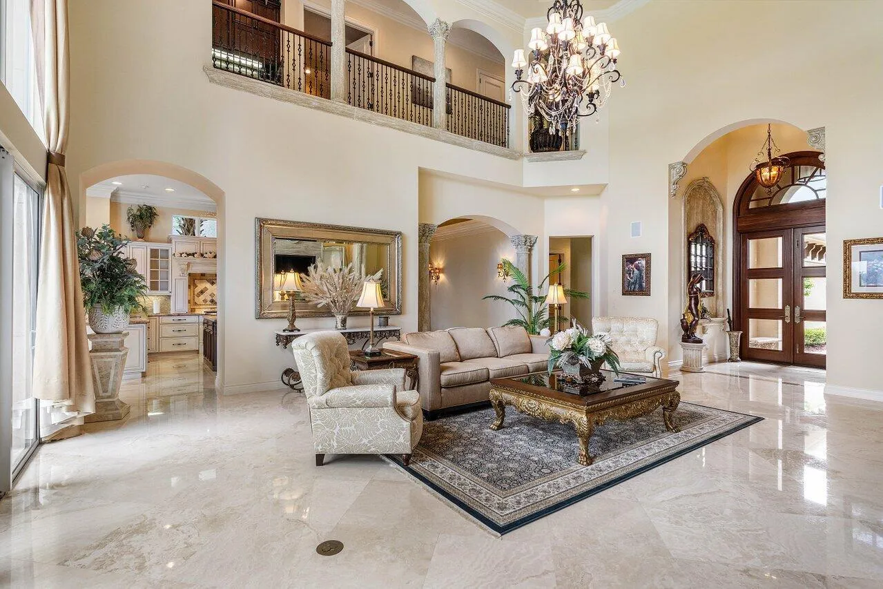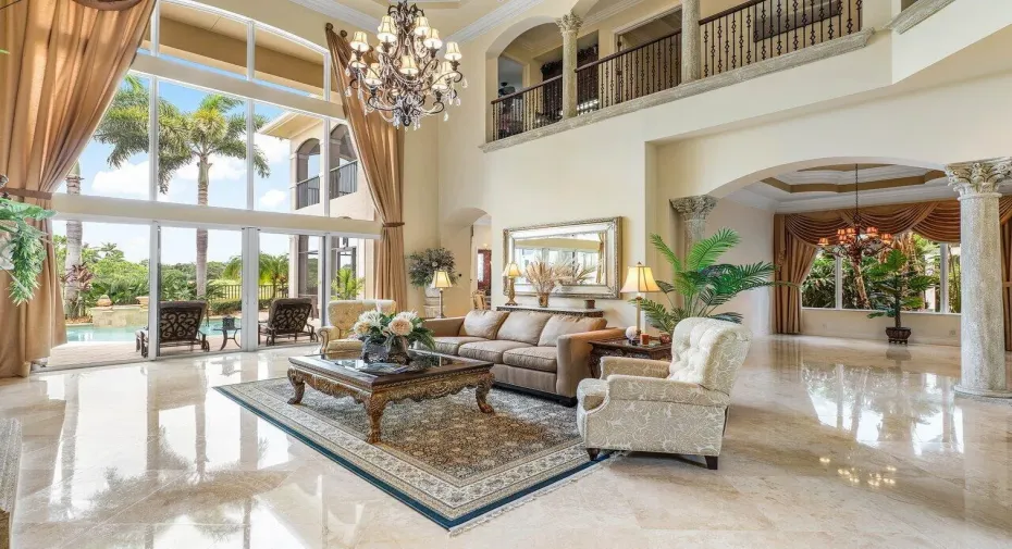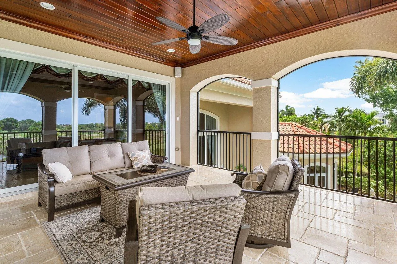 Overlooking the Tesoro River Preserve, this 2-story Custom Creation with 4 bedrooms, 4 en-suite baths, and 2 half-baths features distinctive scenic views of Water, Wildlife, Golf, and a park with moss-draped oak trees. This Spanish Revival home is a breathtaking sight, featuring soaring arched windows and entry foyer, carved wood and stone accents, 24-inch marble floors, natural stone, and abundant molding. Other distinctive details include all luxury brand appliances, a decorative Gas Fireplace, a 2nd-floor media room/Den, upstairs and downstairs laundry, a 3-zone AC system, a Whole-Home Audio System, Instant-on Hot Water, an AC Garage, a 1st-floor wet bar, and a 2nd-level breakfast bar. Enjoy the Beauty of the mature landscaping from the 2 screened-in loggias & a Heated Pool with Spa.