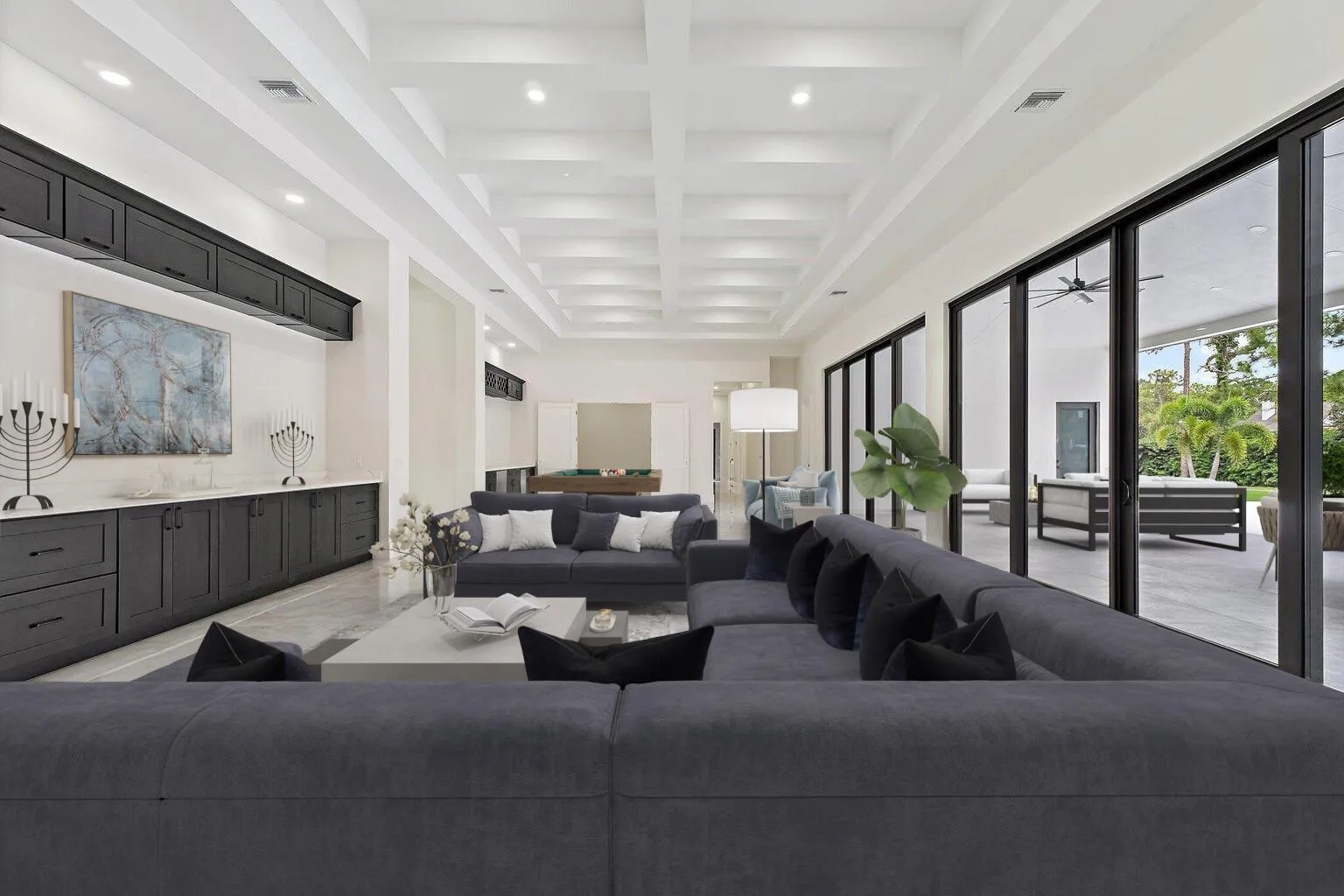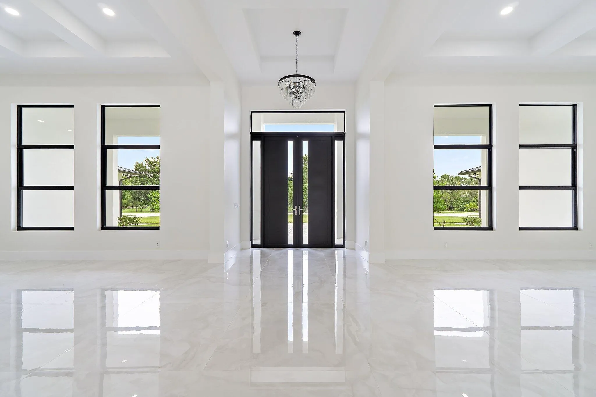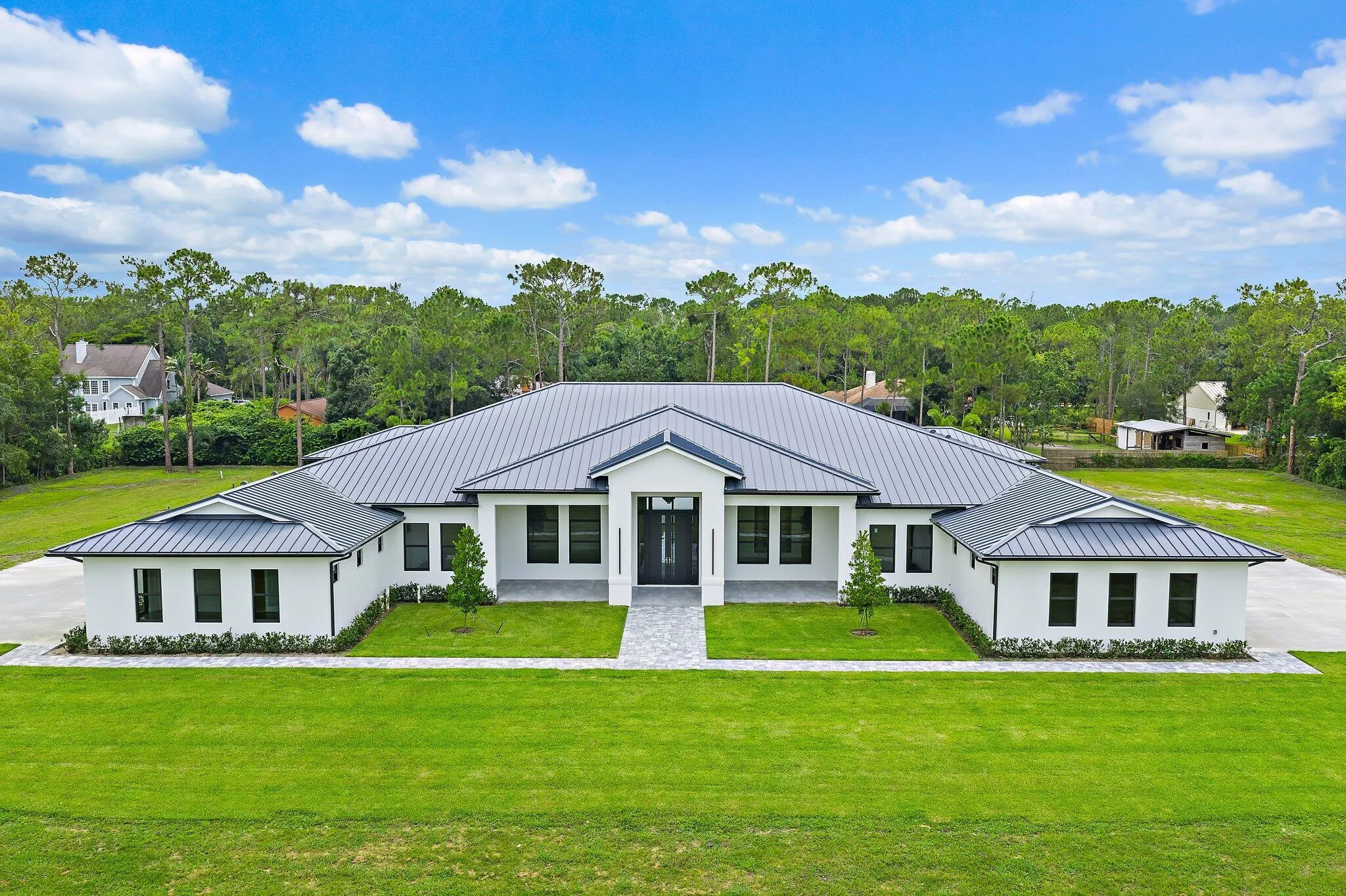 Brand-new 2025 luxury estate on 2.5 acres in Jupiter Farms. Offering 8,230 sq ft of living space + guest house, 6 bedrooms, 8 full & 2 half baths, and over 10,900 total sq ft under roof. Built with uncompromising quality: steel-reinforced CBS construction, impact glass, charcoal metal roof, and foam insulation. Interiors feature 48×48 marble-look tile, soaring 10-16 ft ceilings, custom closets, and level 5 finishes. Gourmet kitchen with dual refrigerators, double ovens, pot filler, wet bar, and 10′ cabinetry. Resort-style pool with 6,250 sq ft marble deck, summer kitchen, sauna, gym, billiards, media room, and wine cellar. Guest house with full kitchen & living. Horses permitted, no HOA. A rare opportunity for modern luxury on acreage in Jupiter.