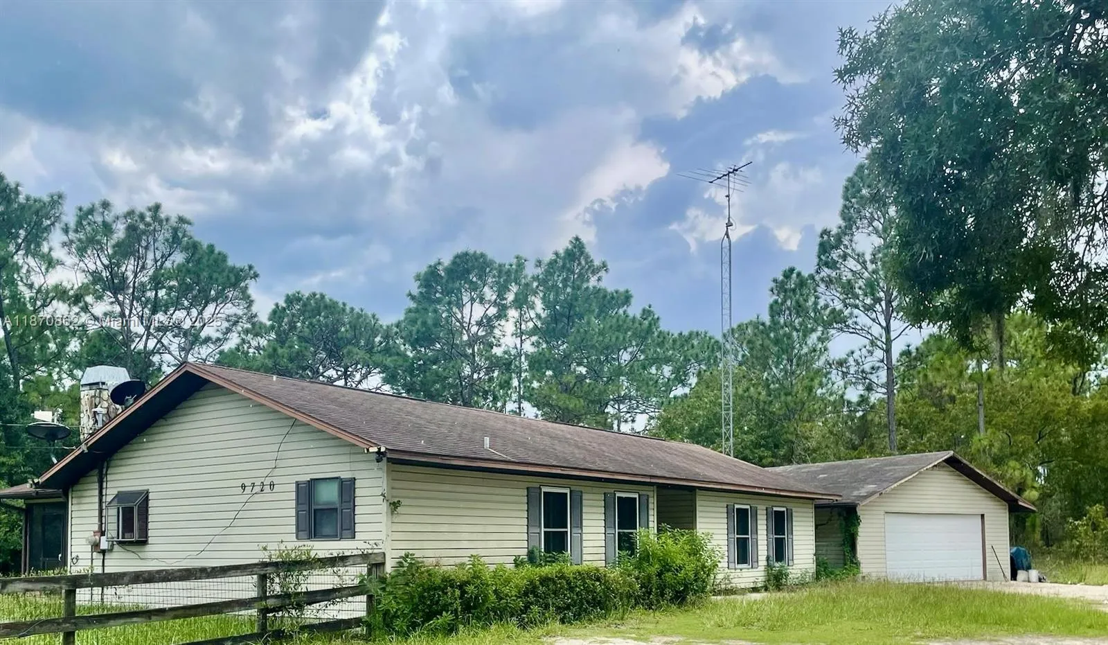 Single-family home with lots of potential! It is situated on a 4.38 acre corner lot in Dunnellon, FL in Marion county zoned residential and agriculture. It features paved roads and detached 2-car garage, hurricane impact windows, alarm system, fireplace, screened patio, cooking island in kitchen, 1 bath with accessible shower and 1 bath with tub/shower combination, laundry room, rec room, ceiling fans, vinyl laminate flooring and central air/heat. There are plenty of closets and a fenced area in the backyard. Can be purchased with adjoining 4.38 acre lot for a total lot size of 8.76 acres that could have a house, barn & pasture on it. Don’t miss this opportunity!