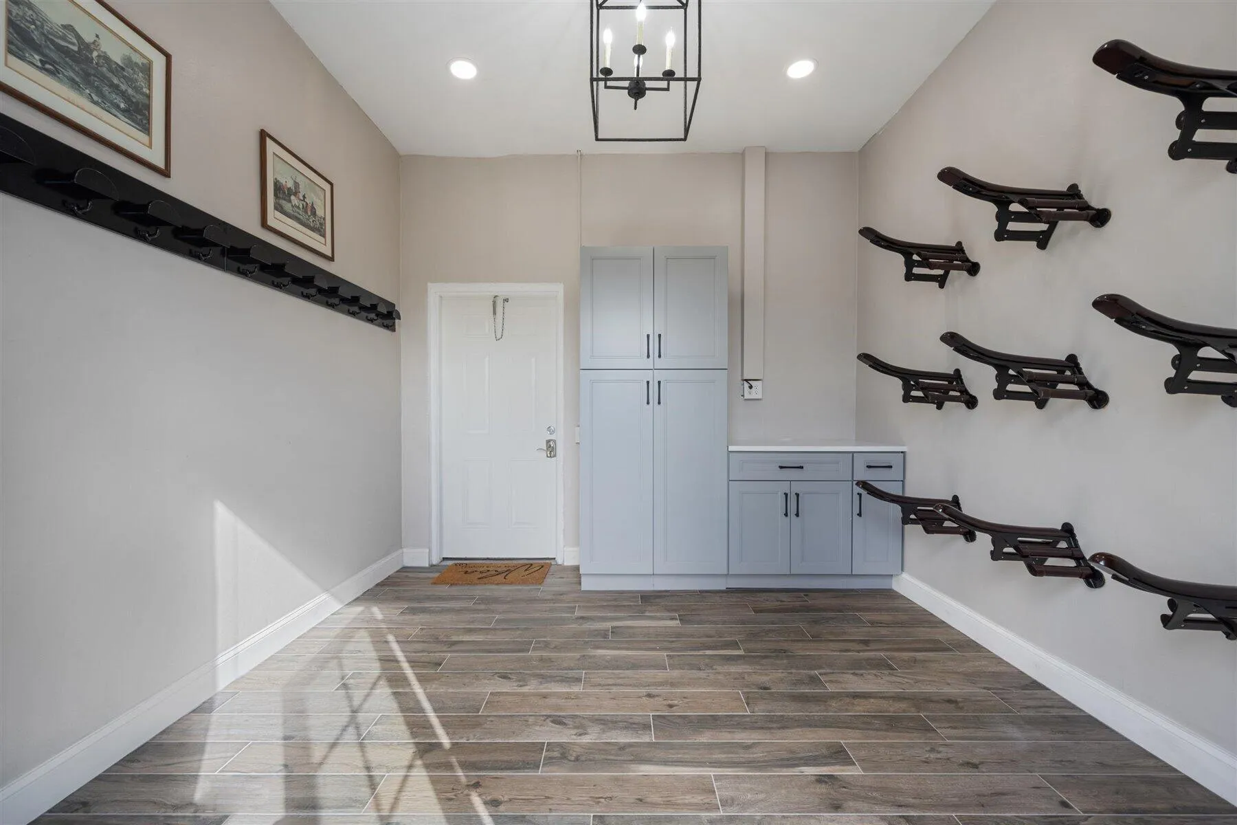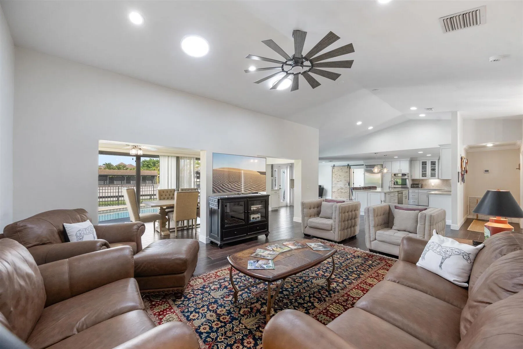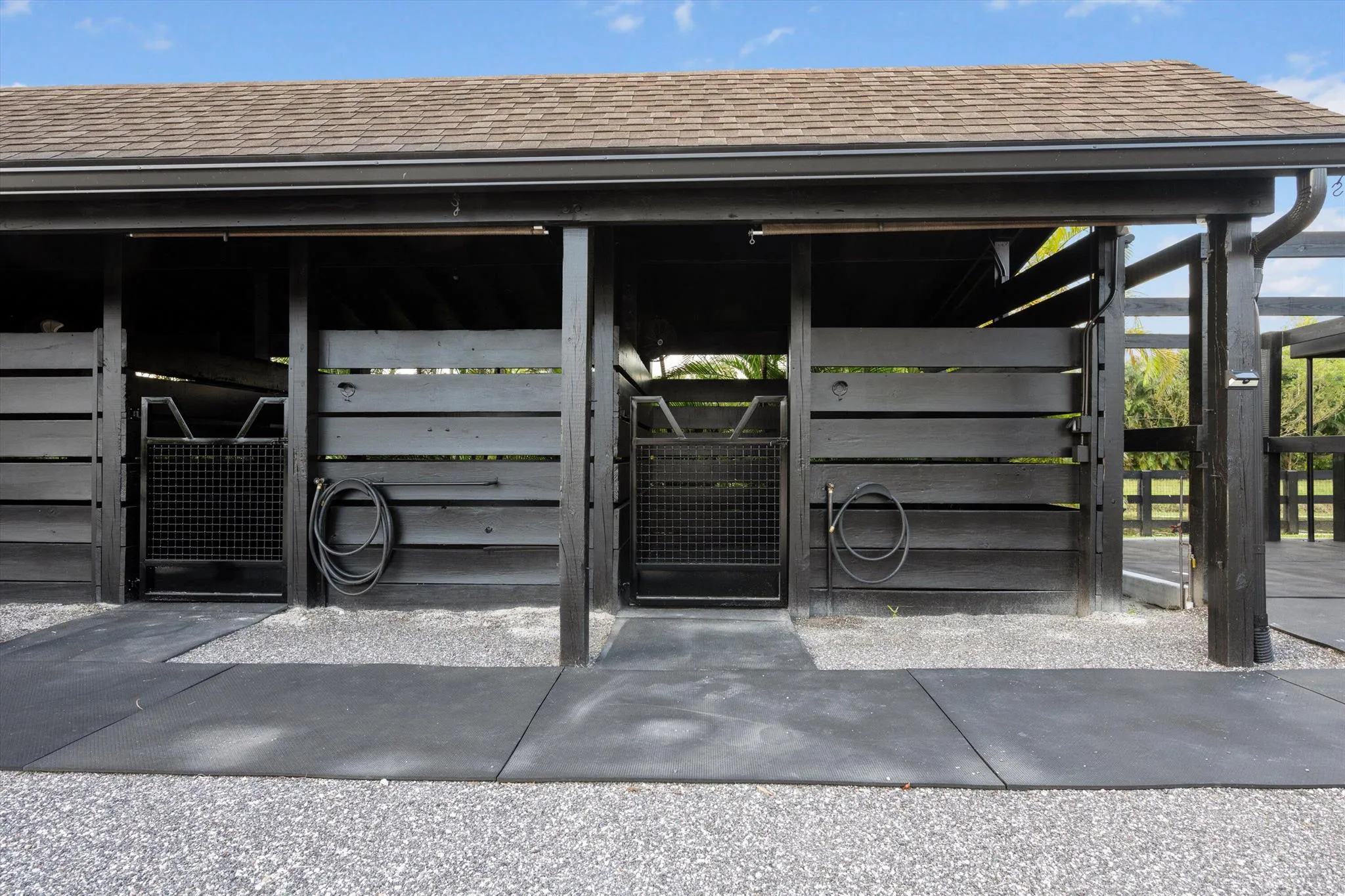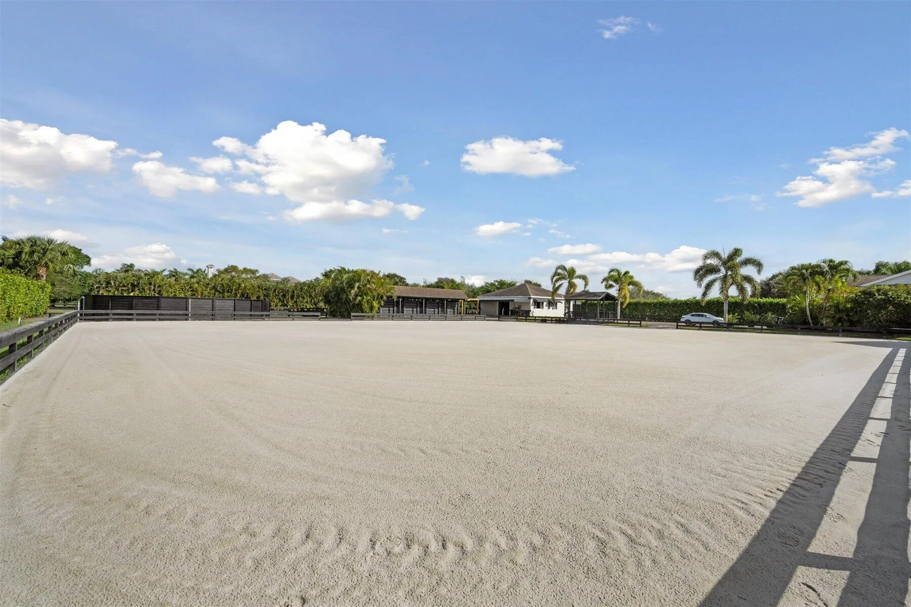 Exceptional Farm Property for sale, offered turn-key! Discover this remarkable 2.1-acre farm, now available for purchase in the prestigious Saddle Trail Park neighborhood. This property offers 8 updated stalls with new stall fronts, 5 high and dry grassy paddocks recently filled and new fencing. The newly installed arena and round pen features a premium fiber footing mix and a new irrigation system. The barn is fully equipped with modern amenities, including new stall mats, an A/C tack room, feed room, separate laundry facilities, and bathroom. There is a spacious, temperature-controlled, two-bay garage for additional storage, large enough for RV storage. The main house has been updated with high-end finishes and new furniture. It features elegant wood-plank tile flooring throughout,