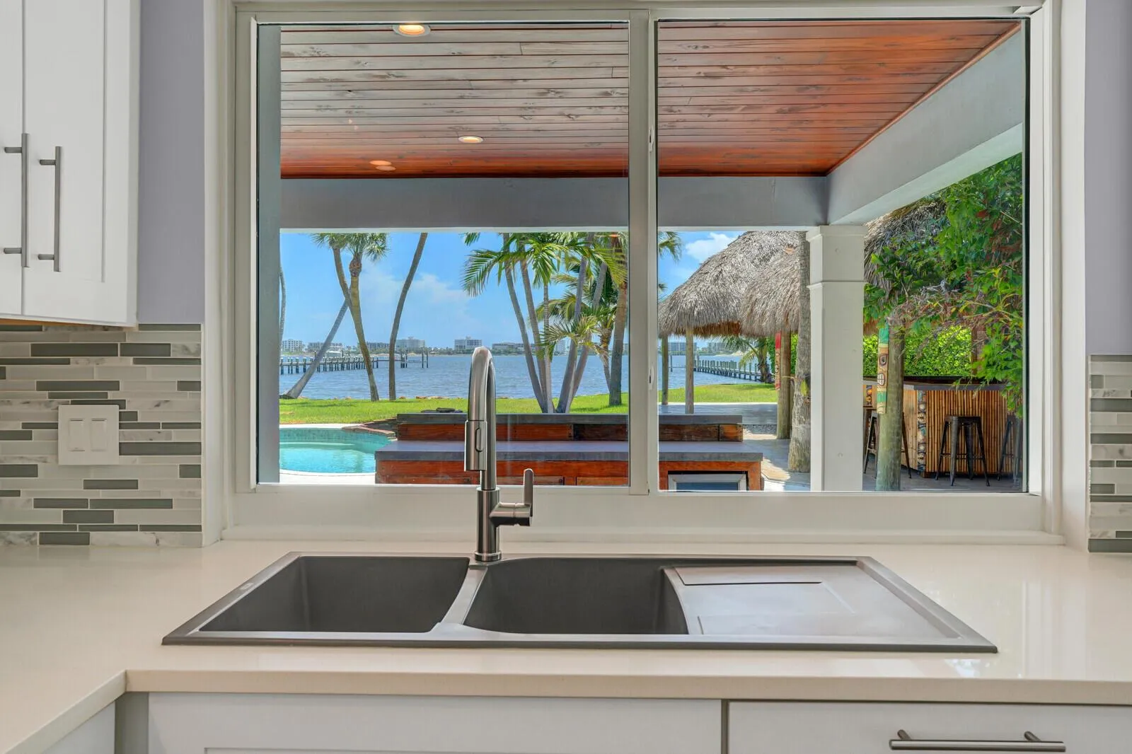 Discover waterfront living on the Intracoastal! This 2-bed / 2-bath home, nestled on over half an acre, offers approx. 97 feet of direct waterfront. Inside, the home has been tastefully remodeled–featuring an updated kitchen with modern finishes, renovated bathrooms, and full hurricane-impact windows and doors for peace of mind. Step outside to your private retreat: a pool and hot tub, a tiki-style bar hut for entertaining, and expansive lawn space. The 2-car garage, plus additional storage for a boat, RV, or toys, offers active living flexibility. Walk to the eclectic, artsy vibes of downtown Lake Worth, and enjoy a short 15-minute drive to downtown West Palm Beach, Atlantic Ave in Delray Beach, and PBI Airport. A charming waterfront home in a private paradise.