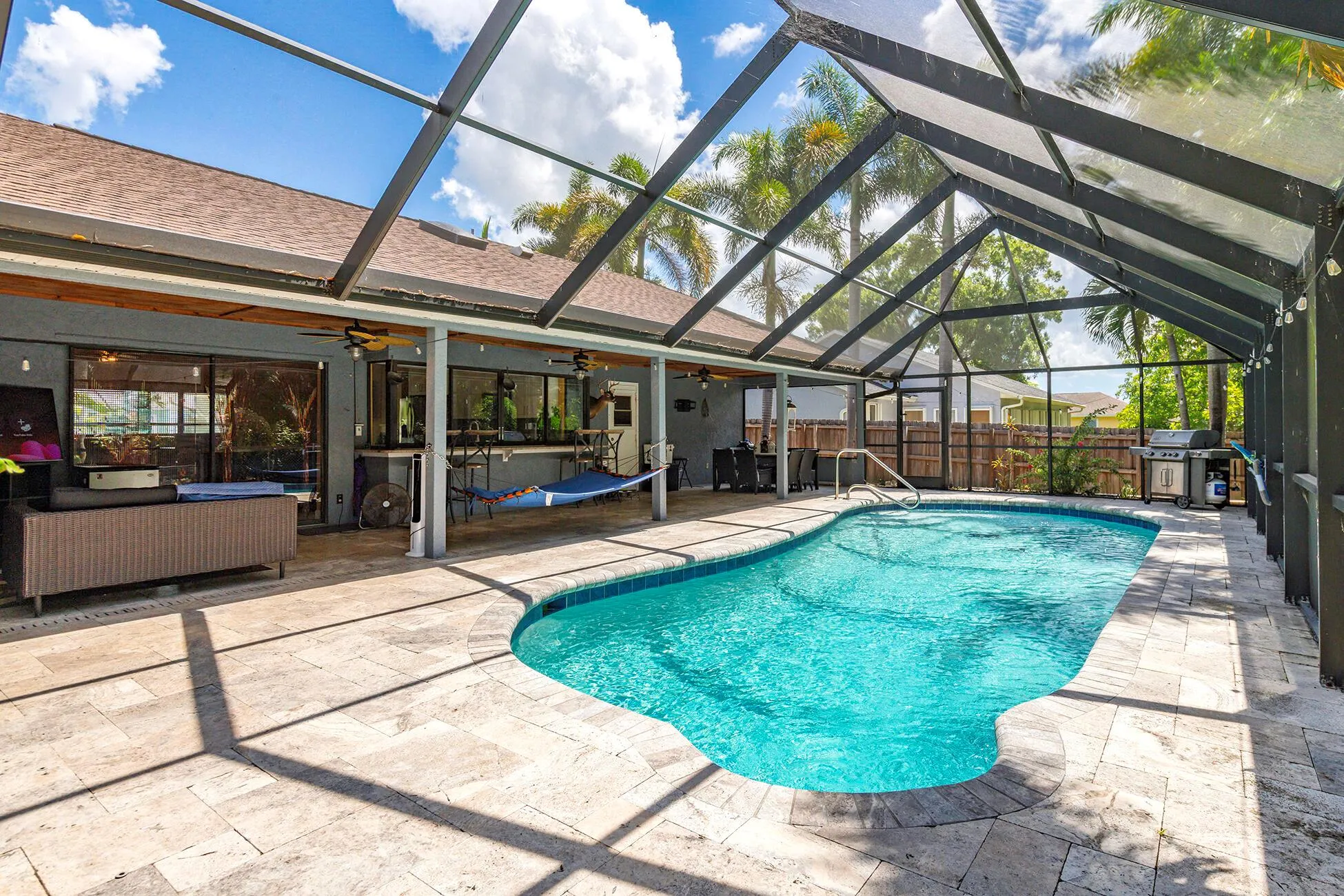 NO HOA! TWO LOTS! DETACHED GARAGE! POOL! IN-LAW SUITE! Experience Florida living at its finest in this private, fully fenced pool home with stunning curb appeal. The highlight: a huge open-concept kitchen featuring a 6×10 island made for entertaining. Step outside to your own oasis: a screened heated saltwater pool w/ a huge travertine patio & deck. The detached garage is a true bonus, half being climate-controlled and ready to serve as a home office, gym, or anything else. Inside, enjoy the flexibility of a private-entry in-law suite, and split floor plan. Additional features are a pavilion with power, 20×10 powered shed, city water&sewer, a private well for sprinklers, updated appliances, and pre-inspected w/ transferable Home Shield warranty. Near Crosstown Parkway, 95 and Tradition