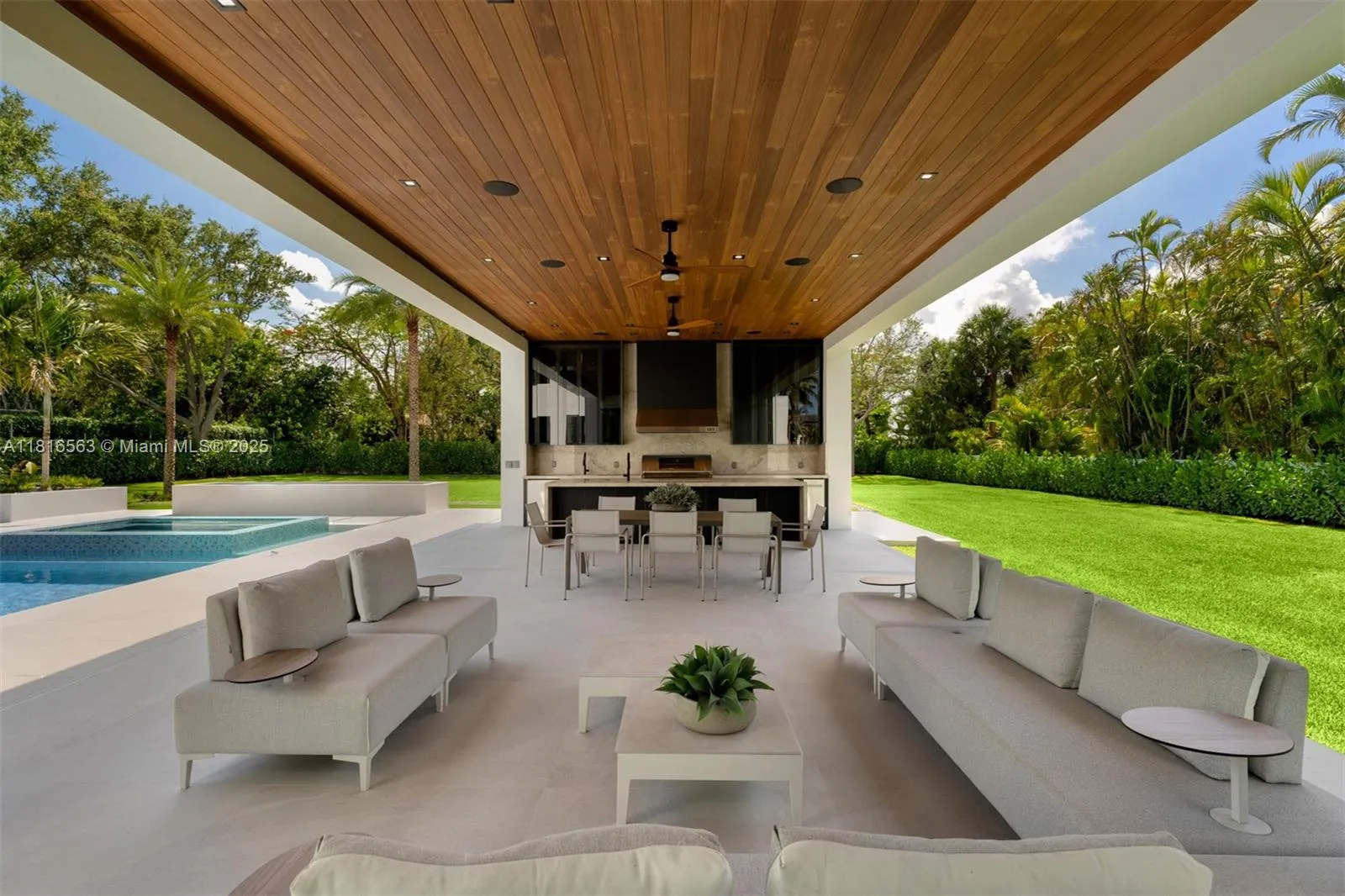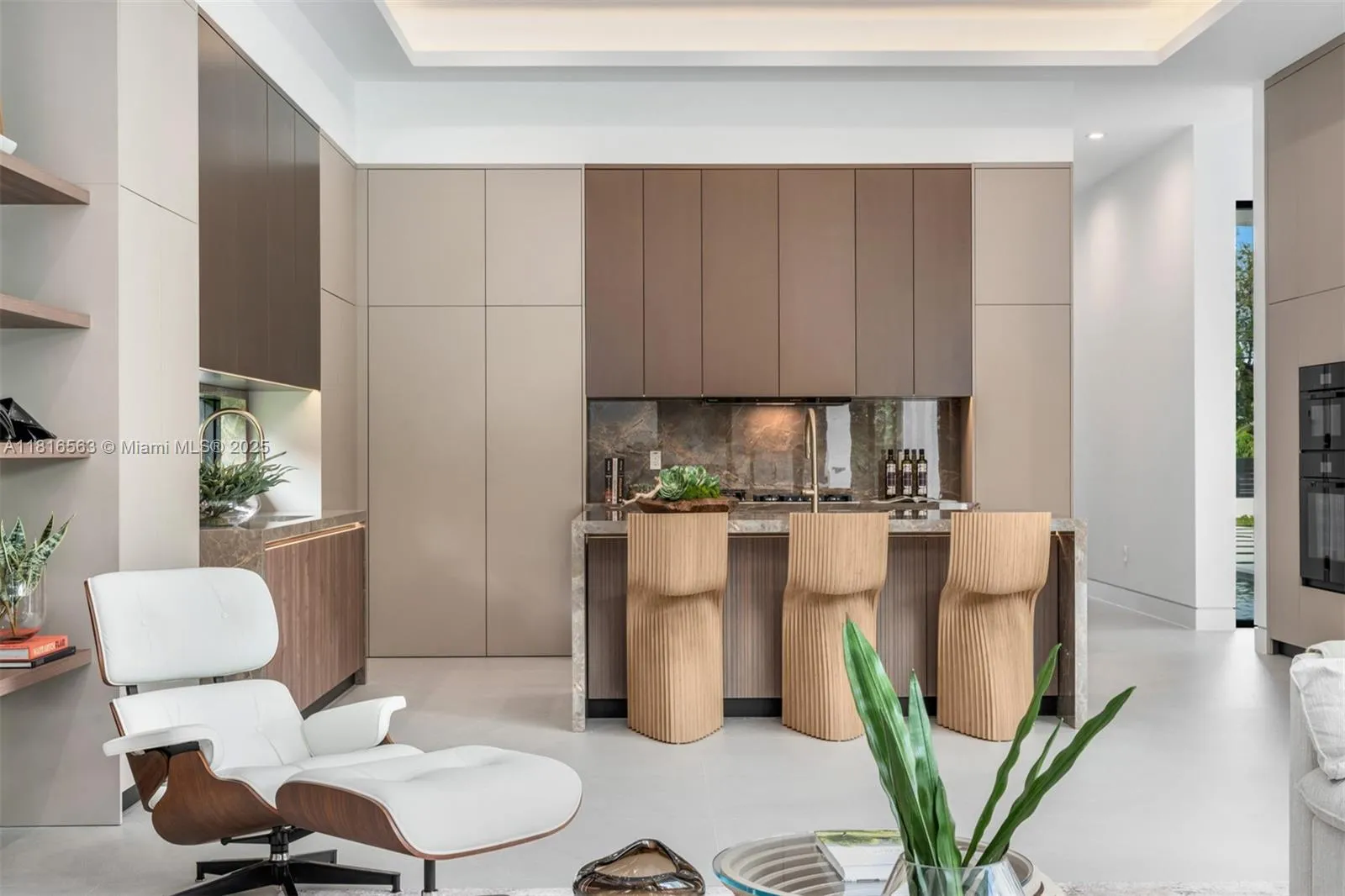 Experience refined modern luxury in this 6-bedroom, 7.5-bath masterpiece spanning 9,616 SF. The home features a state-of-the-art home/theater, a private office, and a sauna. The chef’s kitchen boasts Miele appliances, slab porcelain countertops with Italian style cabinetry. Enjoy the integrated sound system, a striking Italian oak wood staircase, and a wine gallery. Outdoors, a 53×17 heated pool and Jacuzzi, massive fire pit, and expansive covered areas create an entertainer’s paradise with a full summer kitchen. Equipped with an elevator, epoxy 3-car garage plus 3-car carport, and full smart home automation with 28 security cameras and space for a Tennis or sports court, close to major schools and highways.