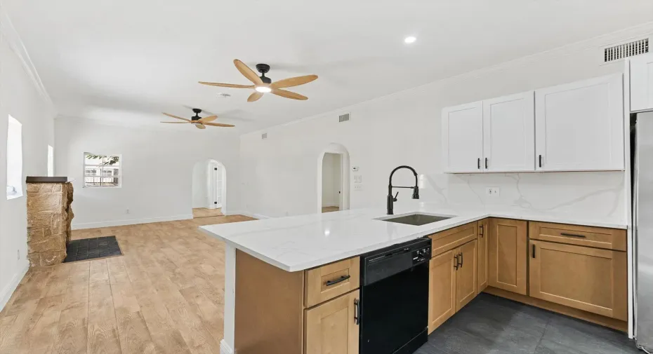 This beautifully renovated Spanish-style home in Lake Worth Beach features three bedrooms and one bathroom. The residence seamlessly blends original charm with modern upgrades, including an arched solid wood front door and a French door leading to the versatile third bedroom or office. The kitchen is equipped with elegant white upper cabinets, wood lower cabinetry, and stunning quartz countertops. A fireplace enhances the living room, while the spacious bedrooms offer ample comfort; the third bedroom is ideal for use as an office. Additional highlights include a large backyard and a detached garage with original barn doors. the Property has Been updated with a new roof and air conditioning system.