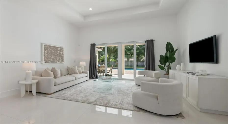 Built in 2019 by a contractor. This beautiful 4,500+ SQFT, 4-BD, 5-BA home sits on a sizable 18k+ SF lot. The residence showcases beautiful curb appeal on quiet block. Walk into 13 foot ceilings with custom oversize 8 ft doors. An eat-in kitchen offering marble & granite countertops, stainless-steel appliances, built-in island/table doubles as seating, & walk-in pantry for extra storage. The open layout seamlessly connects the kitchen, & family rooms with sliding doors to the patio, merging indoor and outdoor entertainment areas. Enjoy your backyard all year round, covered patio, & plenty of room to entertain guests. Additional features include an irrigation with well water, Generator, impact, 2-car garage, pre-wired for security cameras & surround sound.
