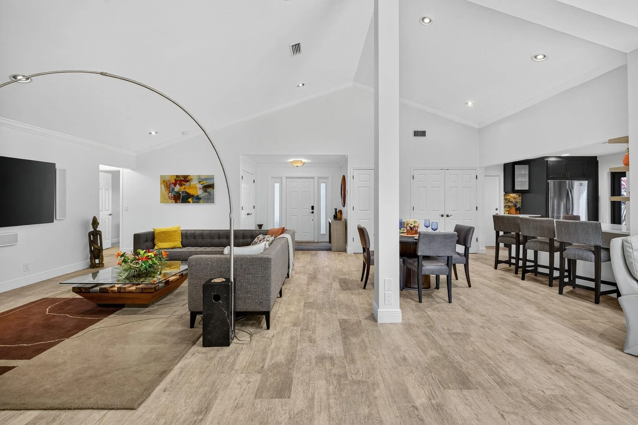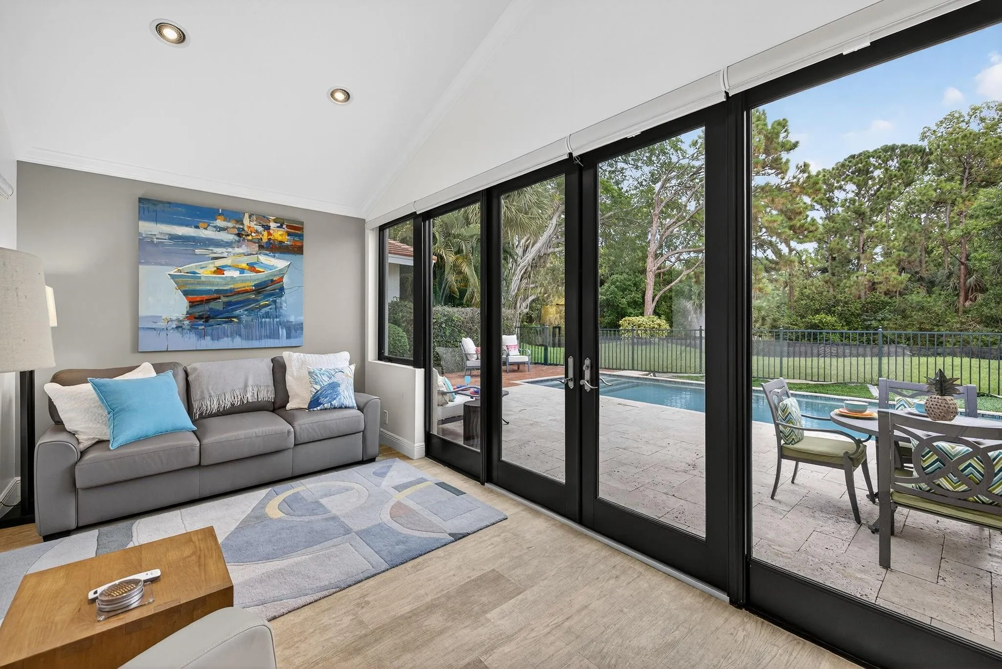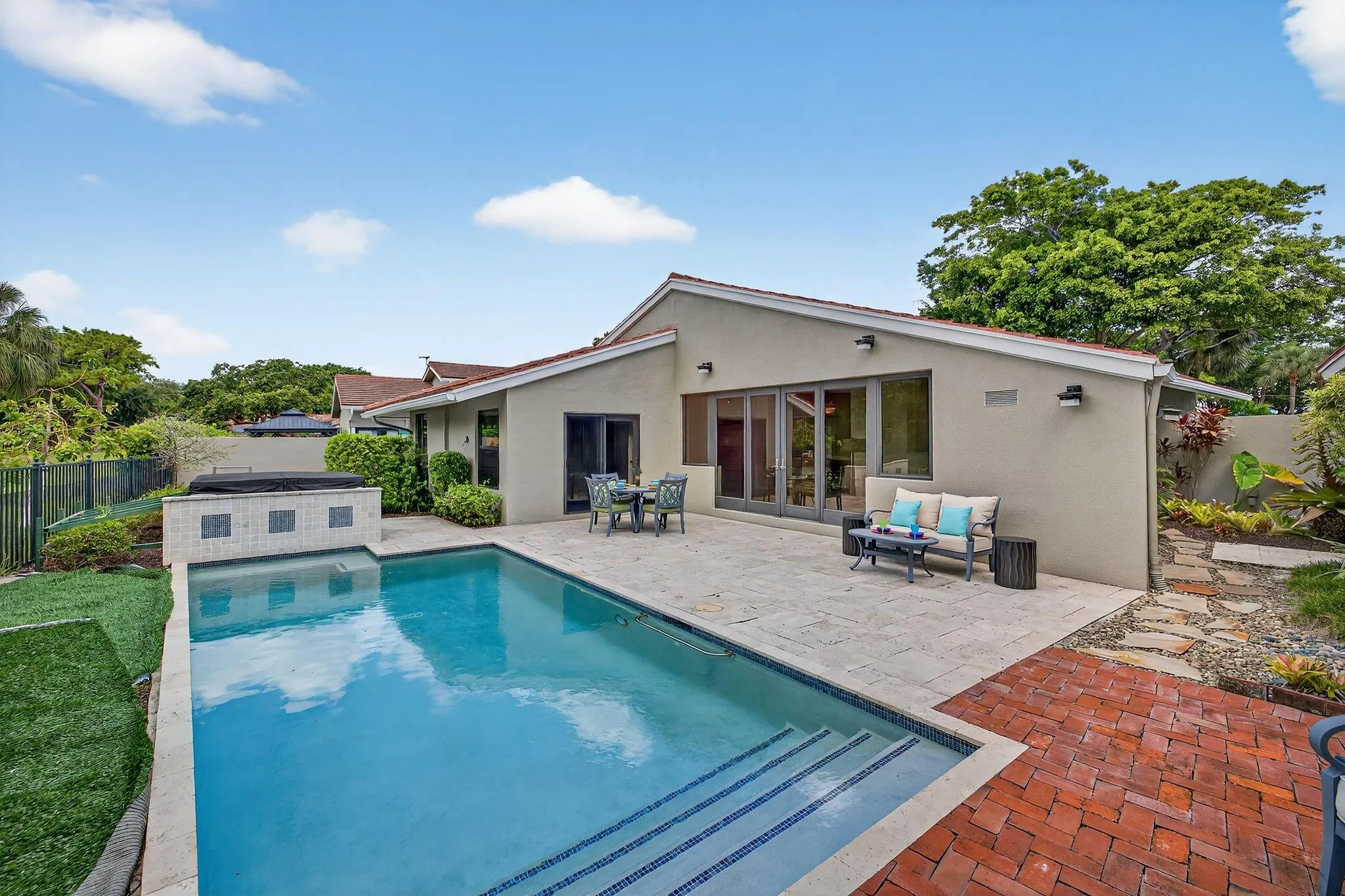 Waterfront POOL HOME W/ 2 CG IS FULLY FURNISHED! Step inside through a welcoming foyer into a wide-open floorplan featuring contemporary ceramic tile flooring, elegant 4″ baseboards, & soaring 14-foot ceilings w/ knockdown finish. The great room layout flows effortlessly into a stylish chef’s kitchen complete w/ Samsung S/S appliances, granite countertops, 36” coffee colored shaker cabinetry w/ crown molding & Farmhouse sink. Convenient pass-through to the enclosed Florida room. The primary suite is generously sized w/ a king-sized bed & a sitting area. It includes a large walk-in closet & beautifully updated ensuite bathroom featuring counter-height vanity w/ undermount sink, frameless glass shower & ceramic tile. Tumbled marble flooring for a spa-like feel. Big guest room. SPA to relax.