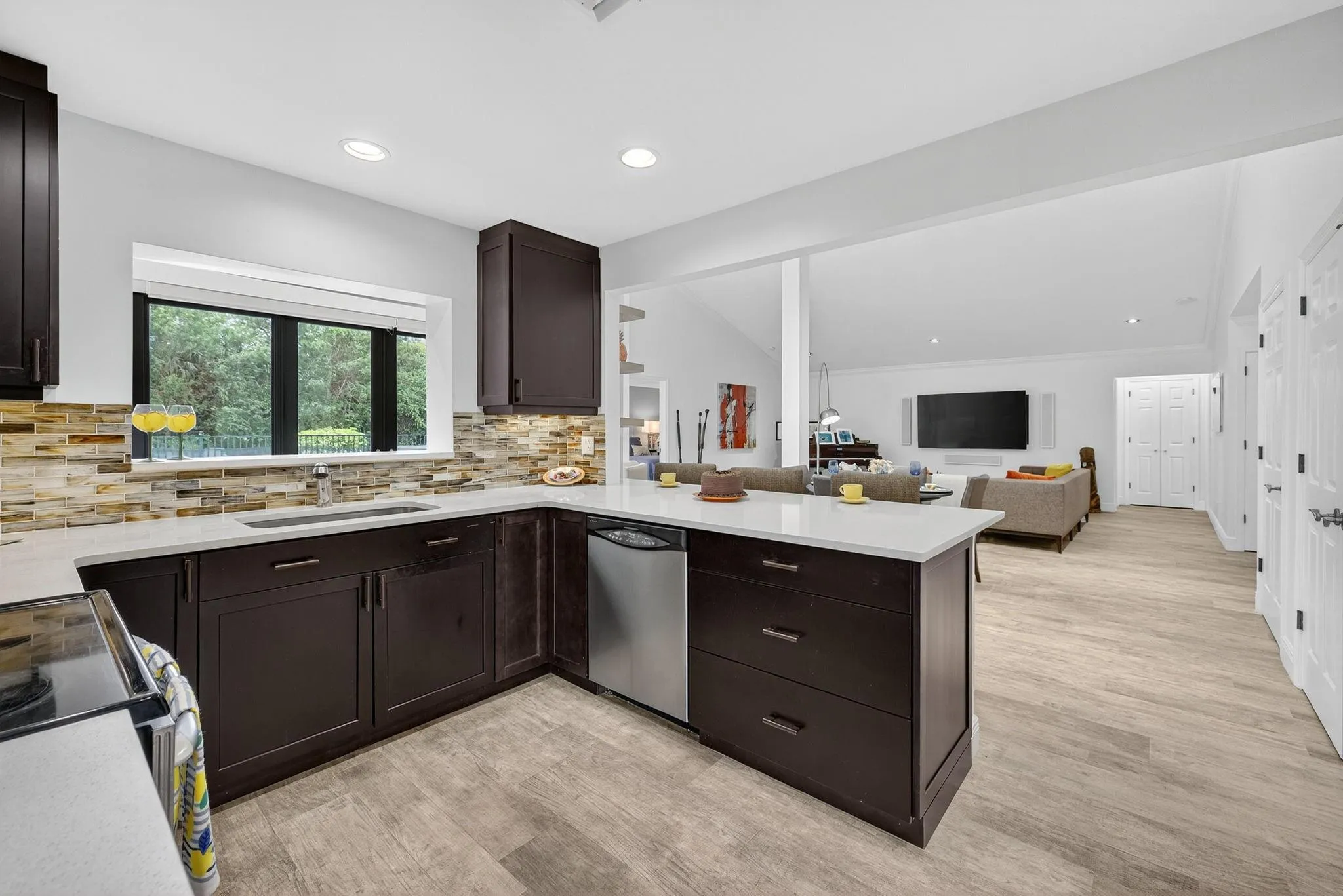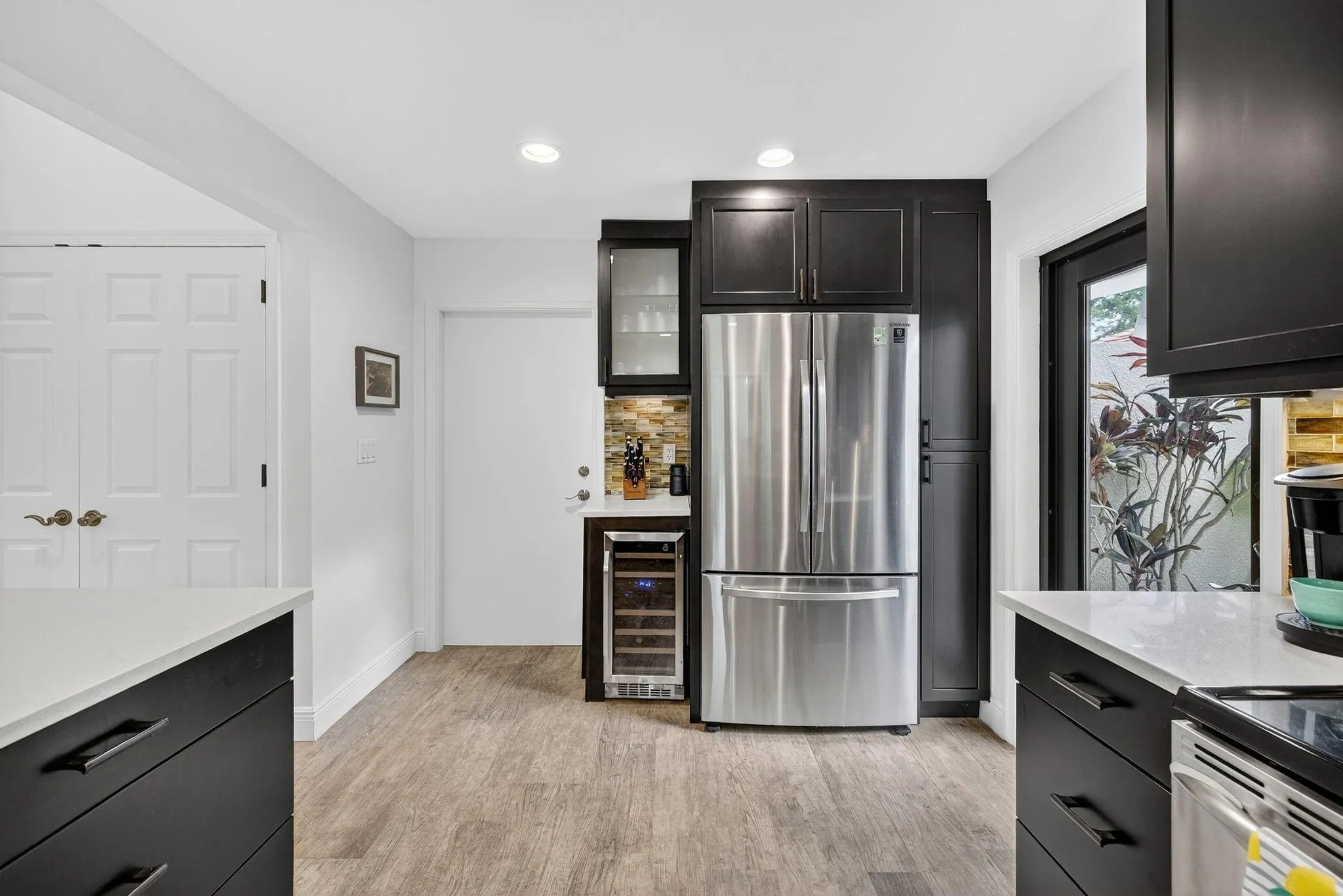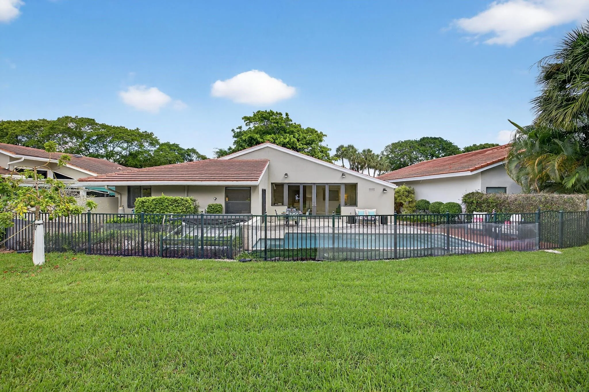 Waterfront POOL HOME W/ 2 CG IS FULLY FURNISHED! Step inside through a welcoming foyer into a wide-open floorplan featuring contemporary ceramic tile flooring, elegant 4″ baseboards, & soaring 14-foot ceilings w/ knockdown finish. The great room layout flows effortlessly into a stylish chef’s kitchen complete w/ Samsung S/S appliances, granite countertops, 36” coffee colored shaker cabinetry w/ crown molding & Farmhouse sink. Convenient pass-through to the enclosed Florida room. The primary suite is generously sized w/ a king-sized bed & a sitting area. It includes a large walk-in closet & beautifully updated ensuite bathroom featuring counter-height vanity w/ undermount sink, frameless glass shower & ceramic tile. Tumbled marble flooring for a spa-like feel. Big guest room. SPA to relax.