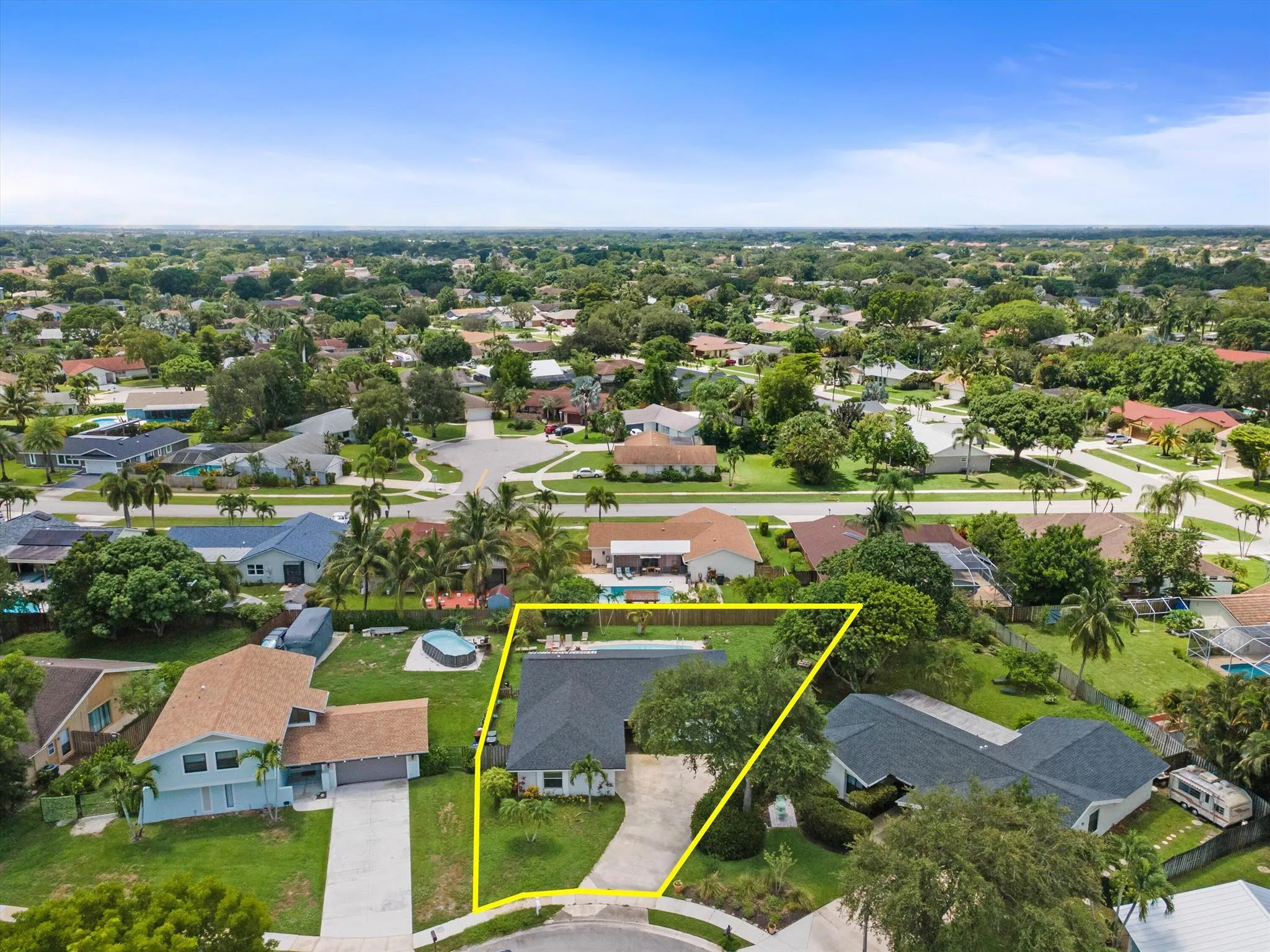 A lovely three-bedroom, two-bath single-story home on a quiet cul-de-sac. It has its own private swimming pool. New roof and new appliances. No HOA. It is centrally located in Wellington.