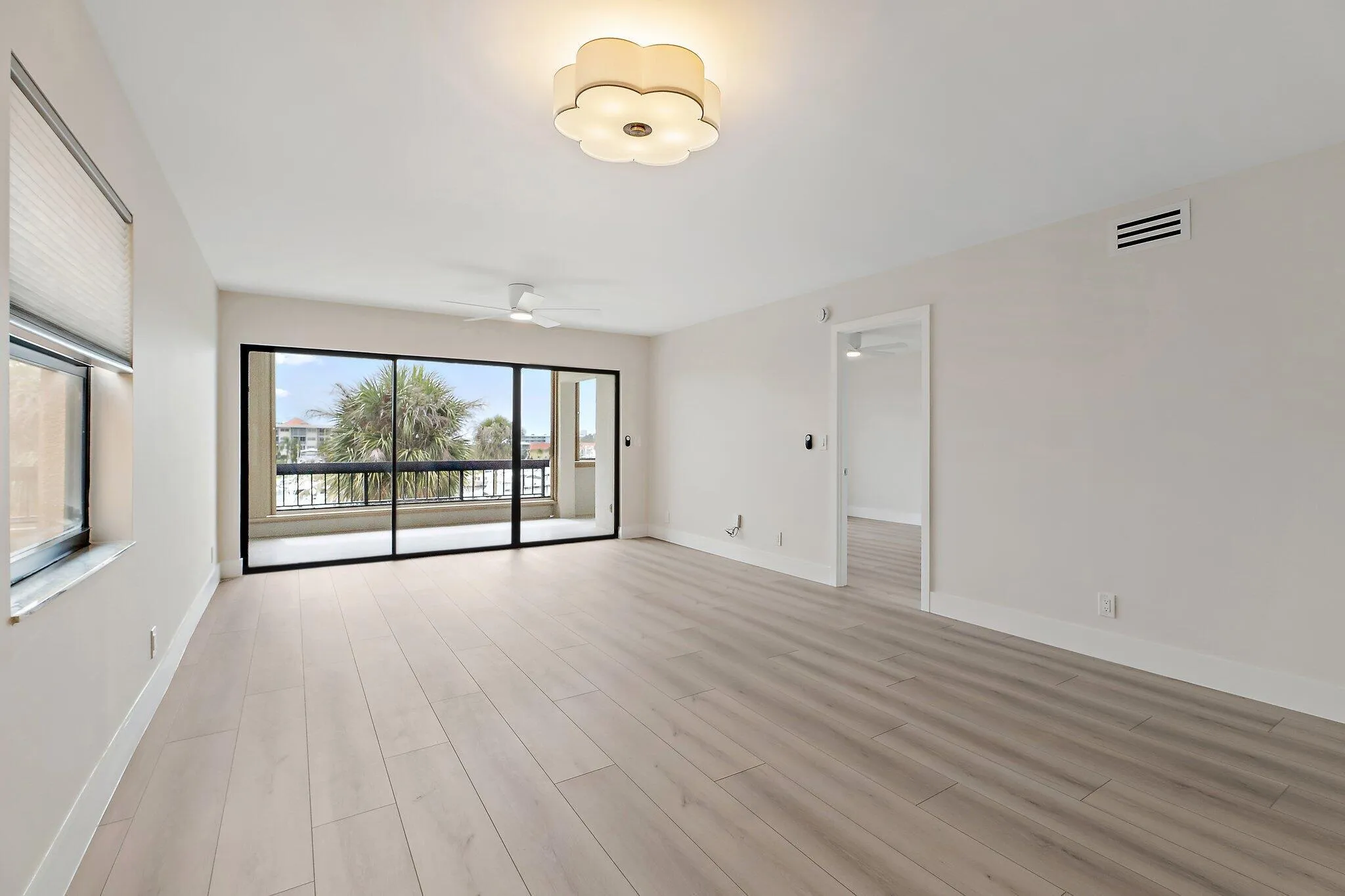 Reconstructed, turn-key opportunity awaits by thoughtful design in this layout improved upon from the original floor plan, overlooking the North Palm Beach Marina and across the street from the North Palm Beach Country Club! Upon entry, a newly created private laundry room features a full-size washer and dryer. Newly expanded and reconfigured kitchen features white shaker cabinetry with crown molding, undermount lighting, Quartz counters, tile backslash, power drawer in-cabinet microwave, stainless-steel appliances, pantry, wine cooler, sink with cutting board, and bar seating. Entertain in the dining or living room areas, with extra corner-unit windows, overlooking the marina and leading to the expansive screened-in patio with new large-format tile and private storage closet. Retreat
