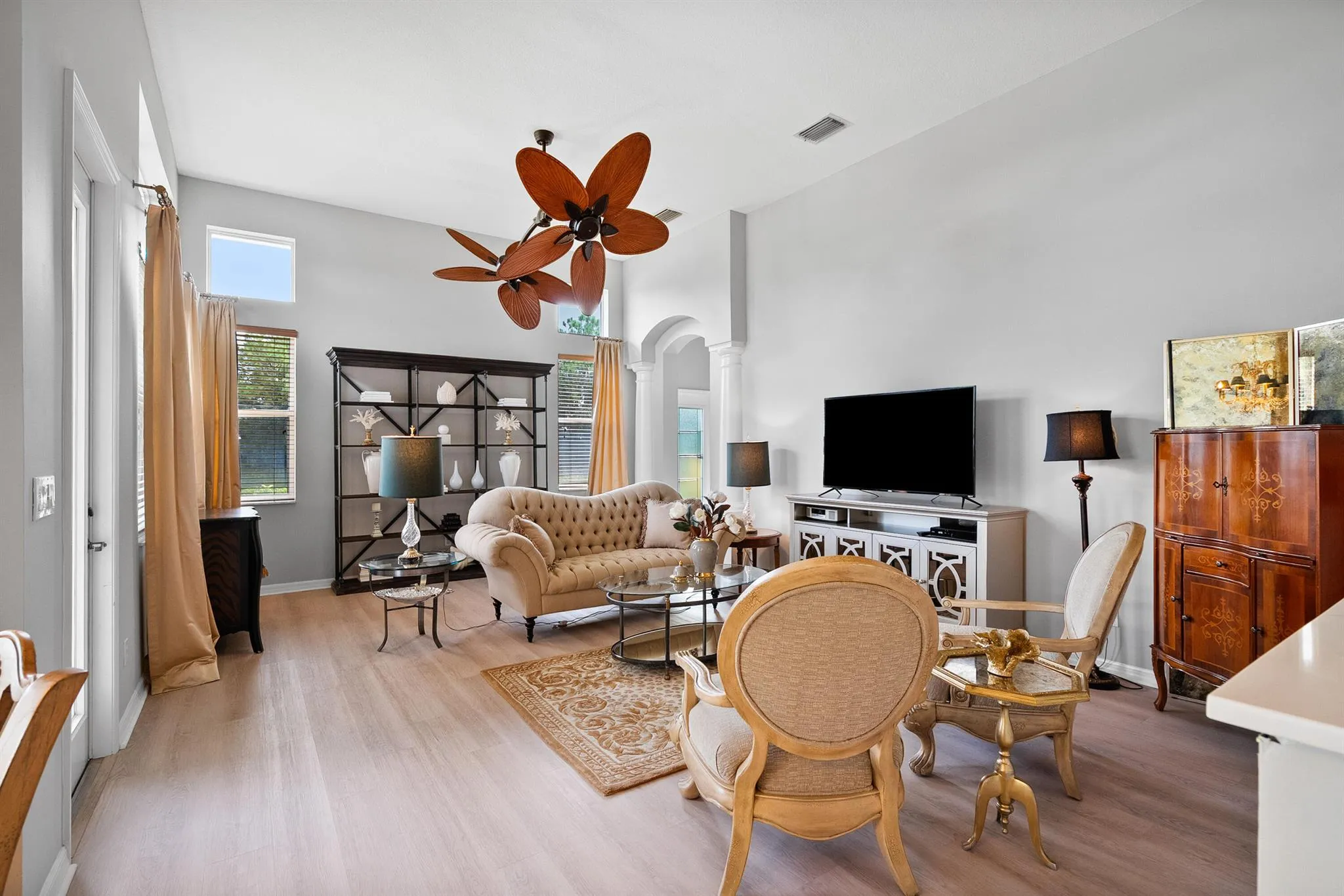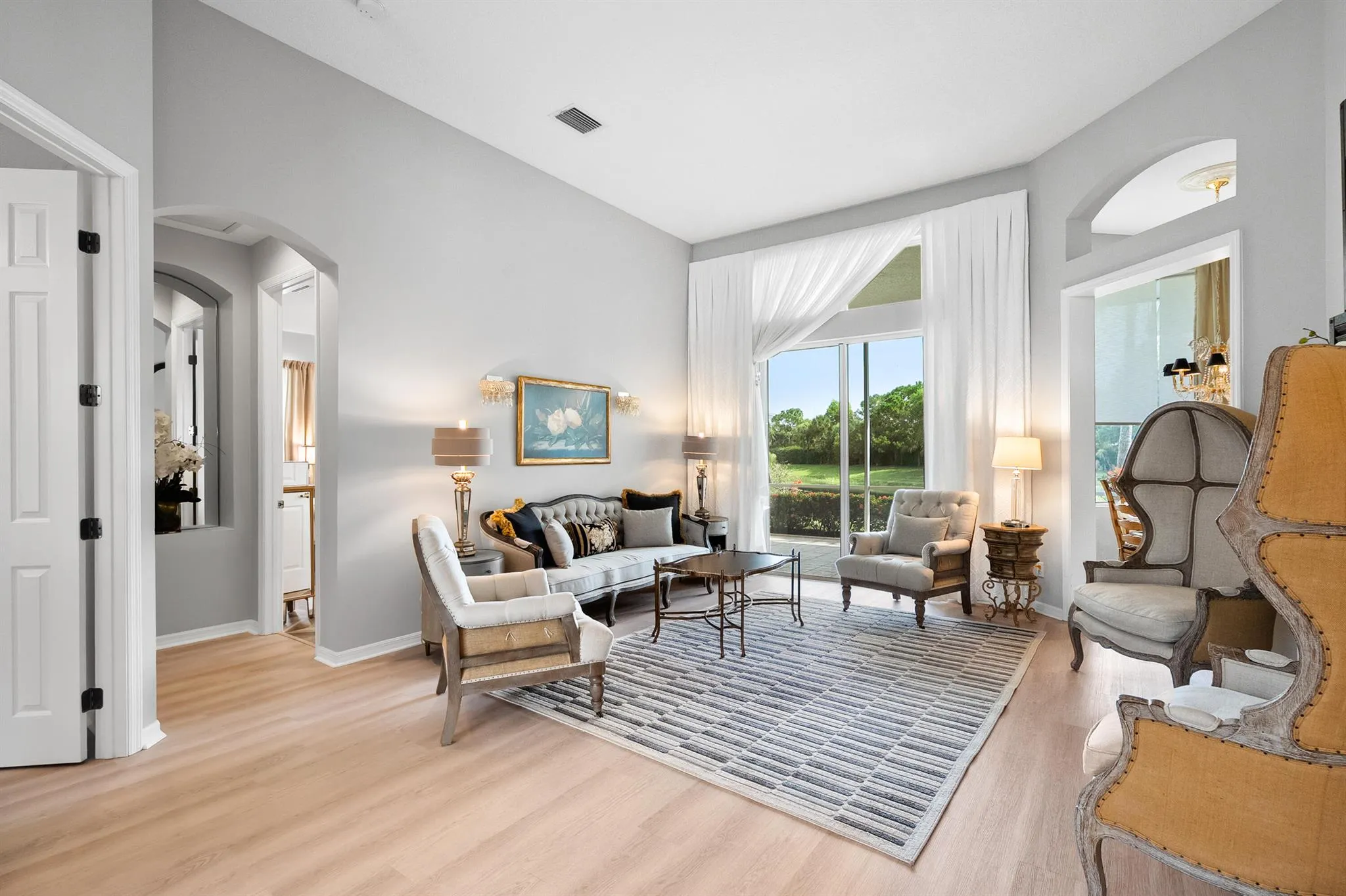 Elegance with modern renovations in this captivating floor Plan. Featuring light, neutral vinyl floors, soaring 12′ ceilings in the main living areas, and 10′ ceilings throughout the rest of the home, this residence is filled with natural light from abundant windows. Updated kitchen showcases white quartz countertops and stainless steel appliances. Floor plan includes a formal dining room, living room, and family room, plus 4 bedrooms and 3.5 baths. One bedroom is an en suite ideal for a nanny or in-law quarters, while another bath serves as a cabana. Enjoy tranquil lakefront views, beautiful mature landscaping, a 2021 roof, and complete hurricane panels. Community amenities include a clubhouse, pool, tennis, fitness center, and optional golf club with cafe and dining. Membership Optional