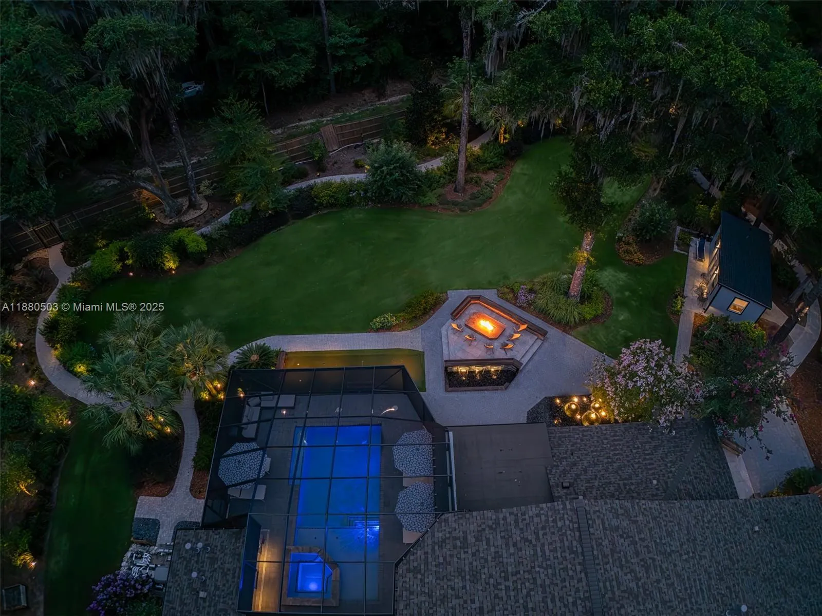 Elegant Retreat on Over an Acre Near the University of Florida Privately set in the sought-after Hermitage neighborhood, this home rests on 1.1 landscaped acres. Updated with design-forward style, the interior features travertine floors, soaring ceilings, walls of glass, and a dramatic fireplace. Living and entertaining zones include a custom backlit quartzite bar, chef’s kitchen with dual prep stations, waterfall island, induction cooktop, steam/convection ovens, and sleek cabinetry—overlooking resort-style pool. The primary suite offers a soaking tub and oversized shower A secondary wing hosts two bedrooms, shared bath, gym, and media room. With smart home integration, studio cottage, and outdoor oasis, this retreat blends modern luxury with timeless appeal.