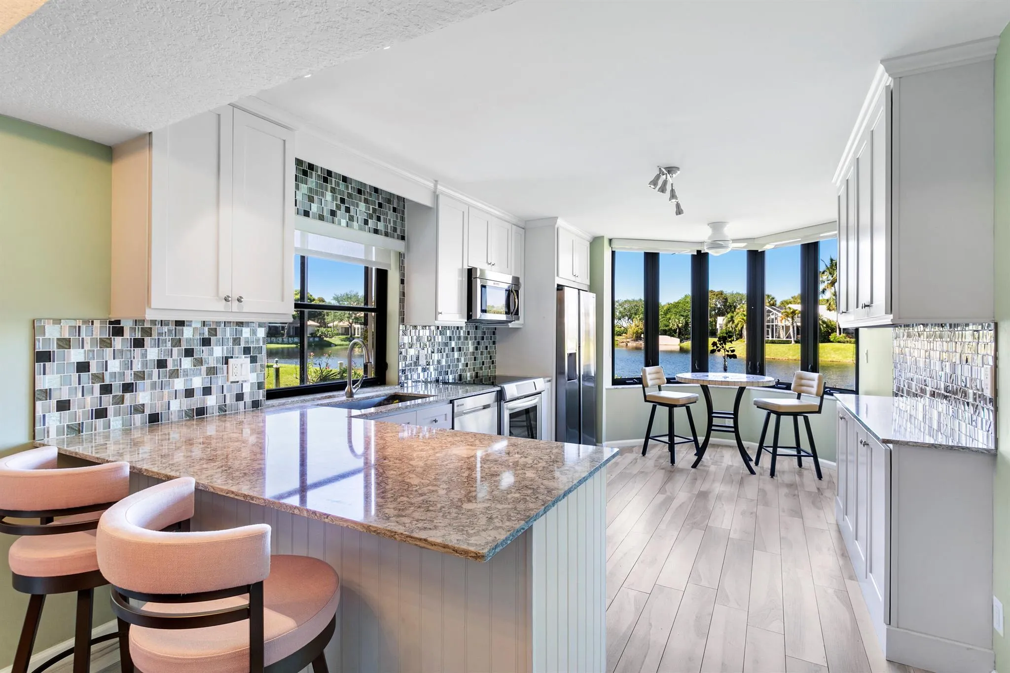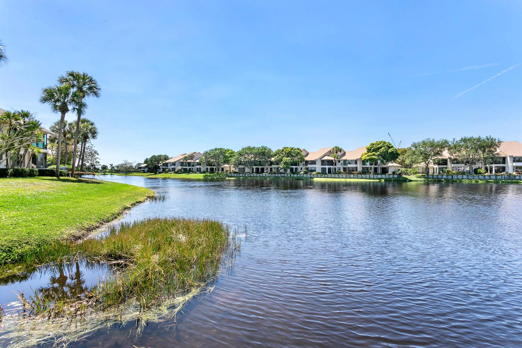 6+ month rental! Move-in-Ready 2 beds, 2 baths- 1st Floor Condo w/Stunning water views. Well designed open floor plan w/breathtaking lake views from most rooms. Enjoy your morning coffee in the cozy breakfast nook overlooking the lake. Attractive flooring throughout, updated lighting, ceiling fans & clean updated bathrooms. Kitchen has upgraded appliances w/side cabinet for storage. The master boosts serene lake views & large redone closet. Relax on the screen-in porch w/lake views. Additional highlights include an epoxy-coated garage floor, newer A/C, ample closets, golf cart barn & 24 hour security. Close to Jupiter Medical Hospital, stores & restaurants. For the commuter easy access to PBI airport.