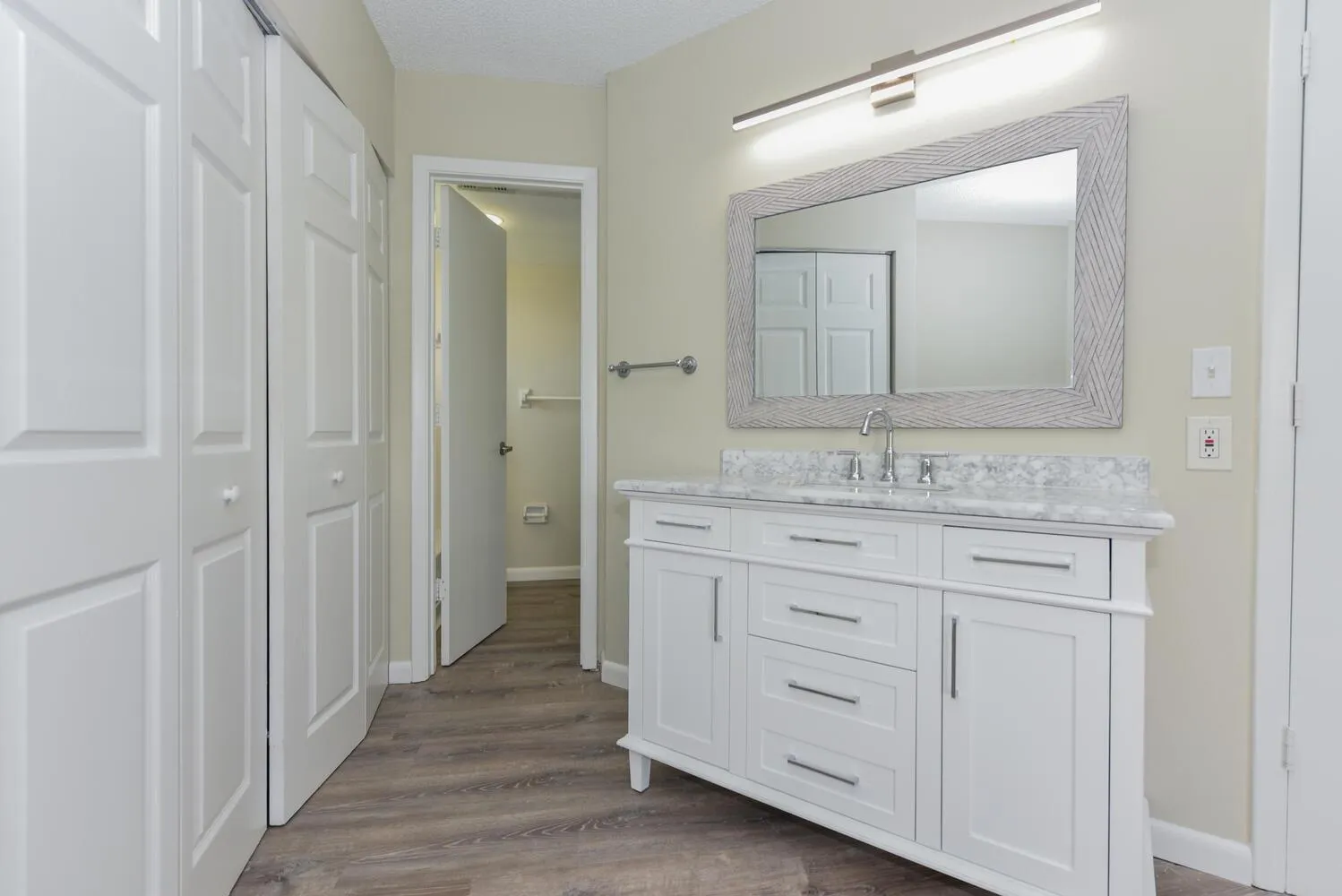 Welcome to your beautifully remodeled 2-bedroom, 2-bathroom condo with tranquil lake views! This second-floor home features an open-concept layout with a fully renovated kitchen boasting quartz countertops, shaker soft-close cabinets, and modern finishes. Luxury vinyl flooring flows throughout, complemented by fresh paint and updated fixtures. Both bathrooms have been tastefully remodeled with new vanities and stylish details. Enjoy extra living space with the enclosed balcony, the perfect spot to relax while overlooking the serene lake. Additional upgrades include a brand-new A/C, brand-new washer and dryer, and updated lighting throughout. This community offers a sparkling pool and low HOA fees that include water, exterior maintenance, roof, lawn care, and common areas. Conveniently