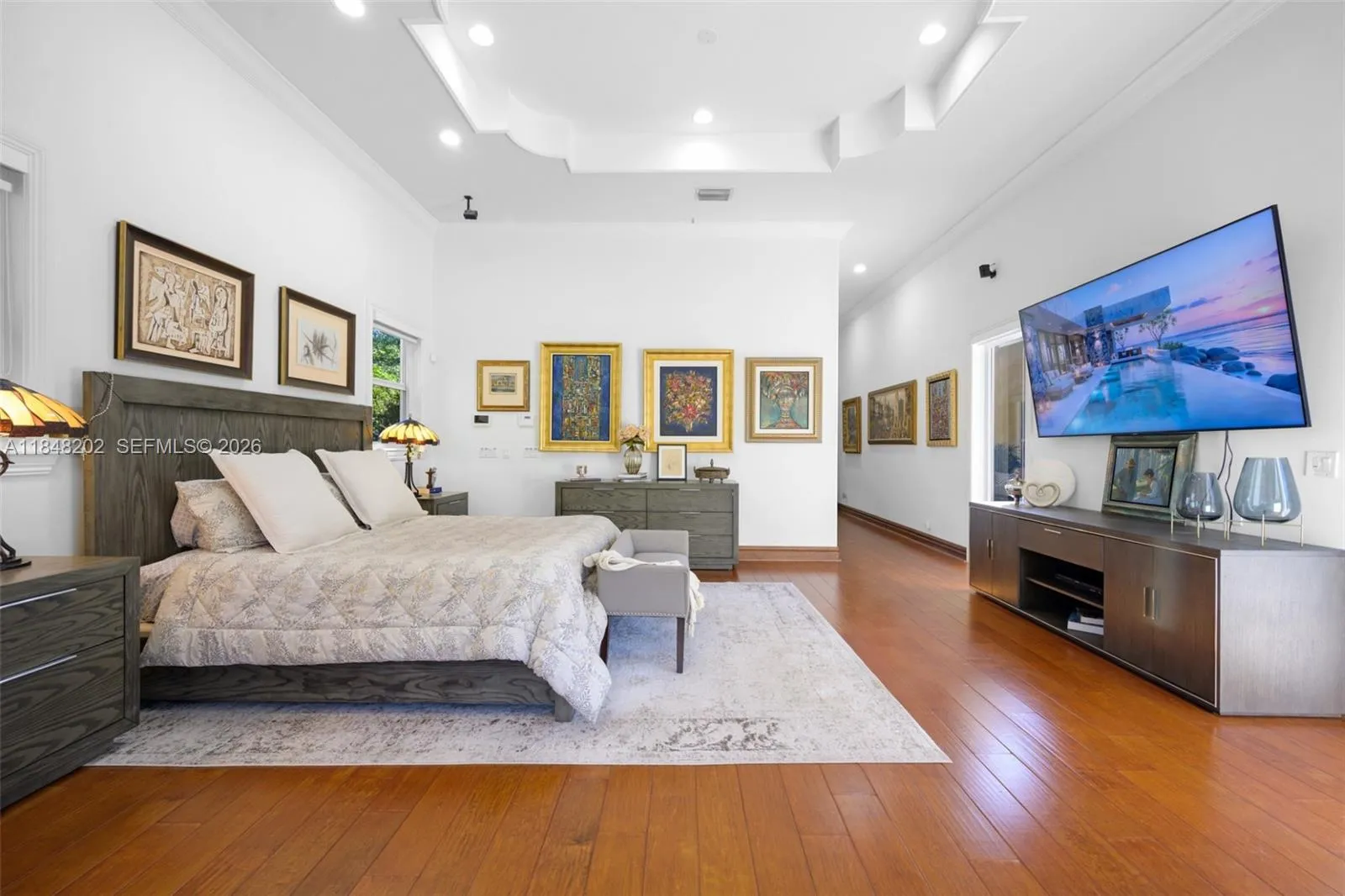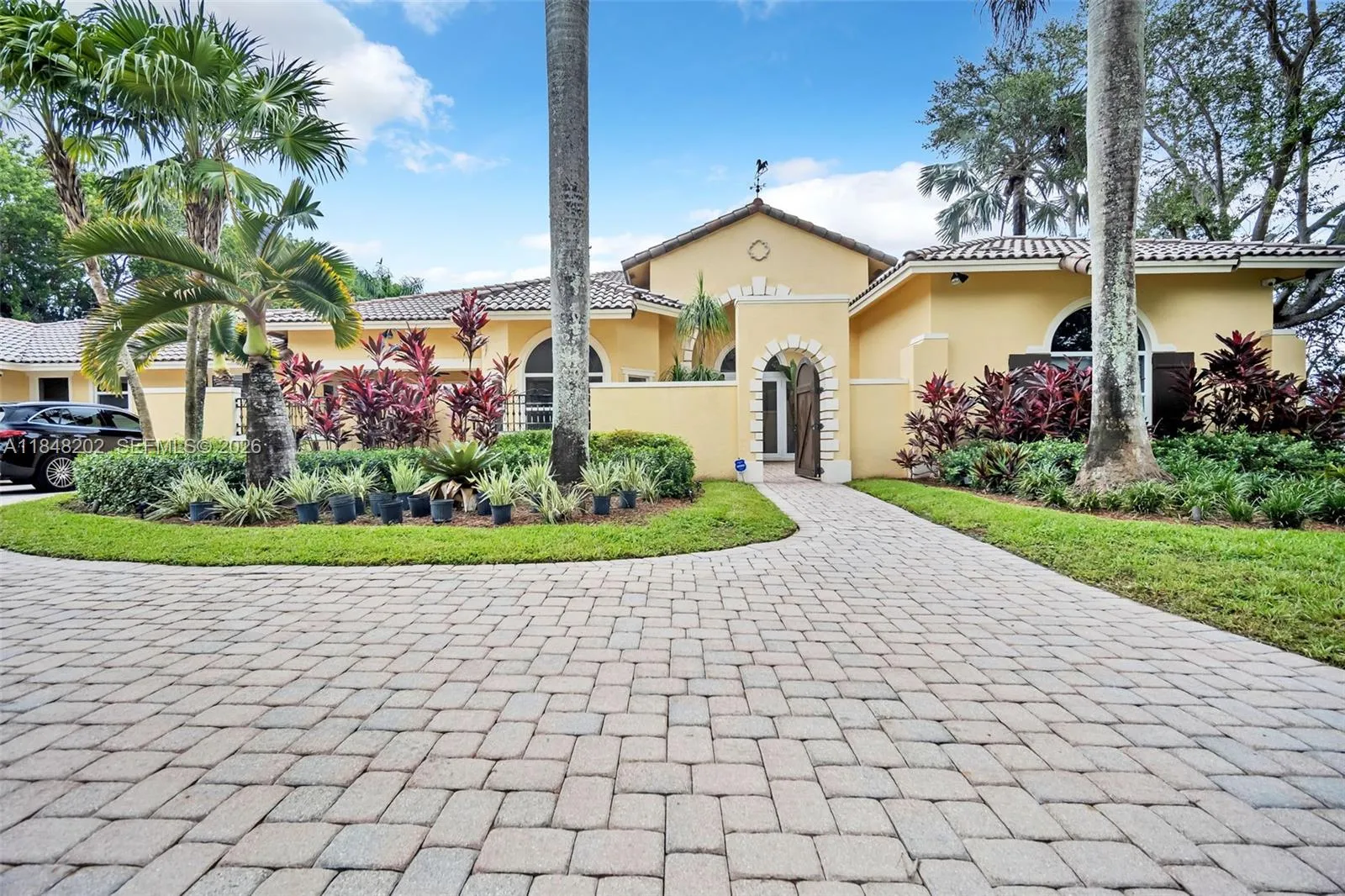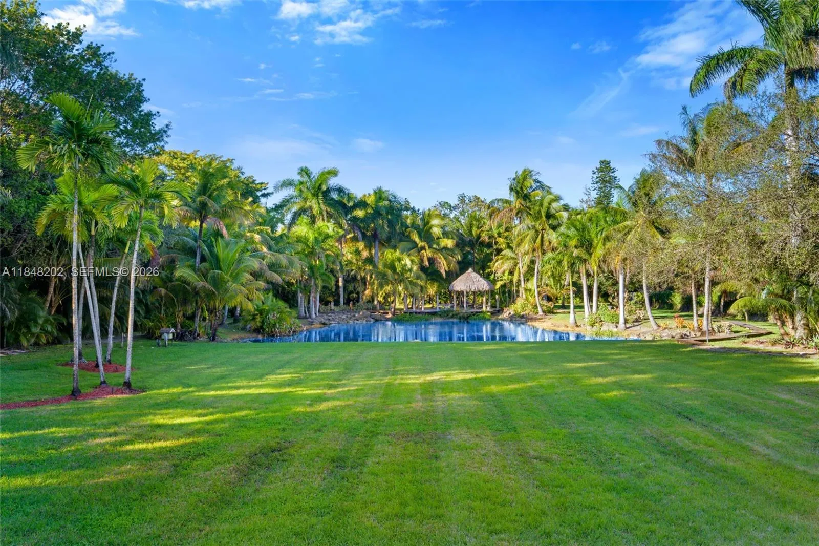Gated 2.24 acre estate in exclusive Sunshine Ranches offering unmatched privacy, space, and tropical luxury. This 7 bedroom, 6.5 bath hacienda style residence (including a den) also features a separate office, wood and tile flooring, crown molding, and generous living areas filled with natural light. The fully fenced grounds are a true tropical paradise professionally landscaped with over $300K in mature palms and exotic plants, plus over $20K in custom outdoor lighting. Outdoor highlights include an expansive travertine deck, scenic walking trails, and a tiki hut overlooking a serene private lagoon. Additional features include a 4 car garage, whole house generator, 500 gallon underground propane tank, and security cameras. A rare find in prestigious Southwest Ranches.