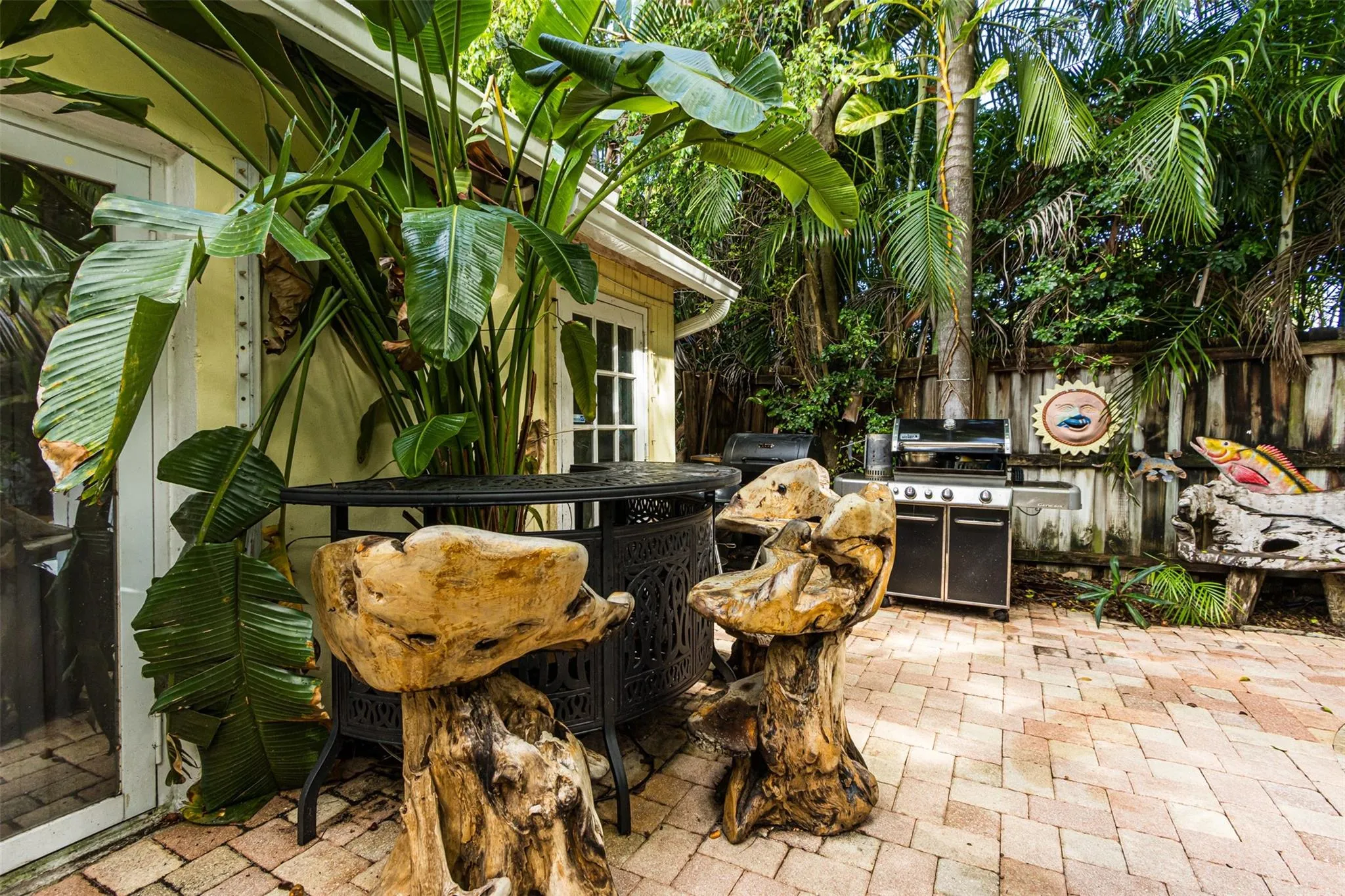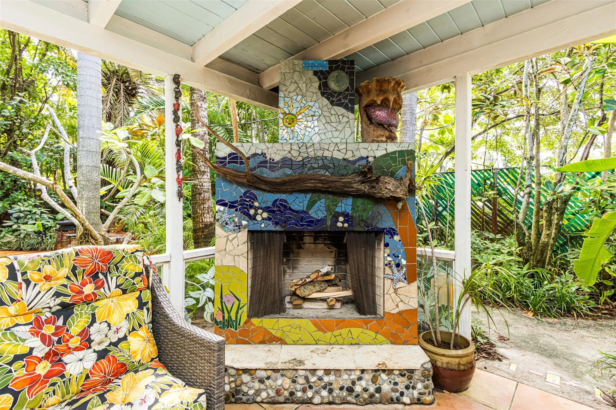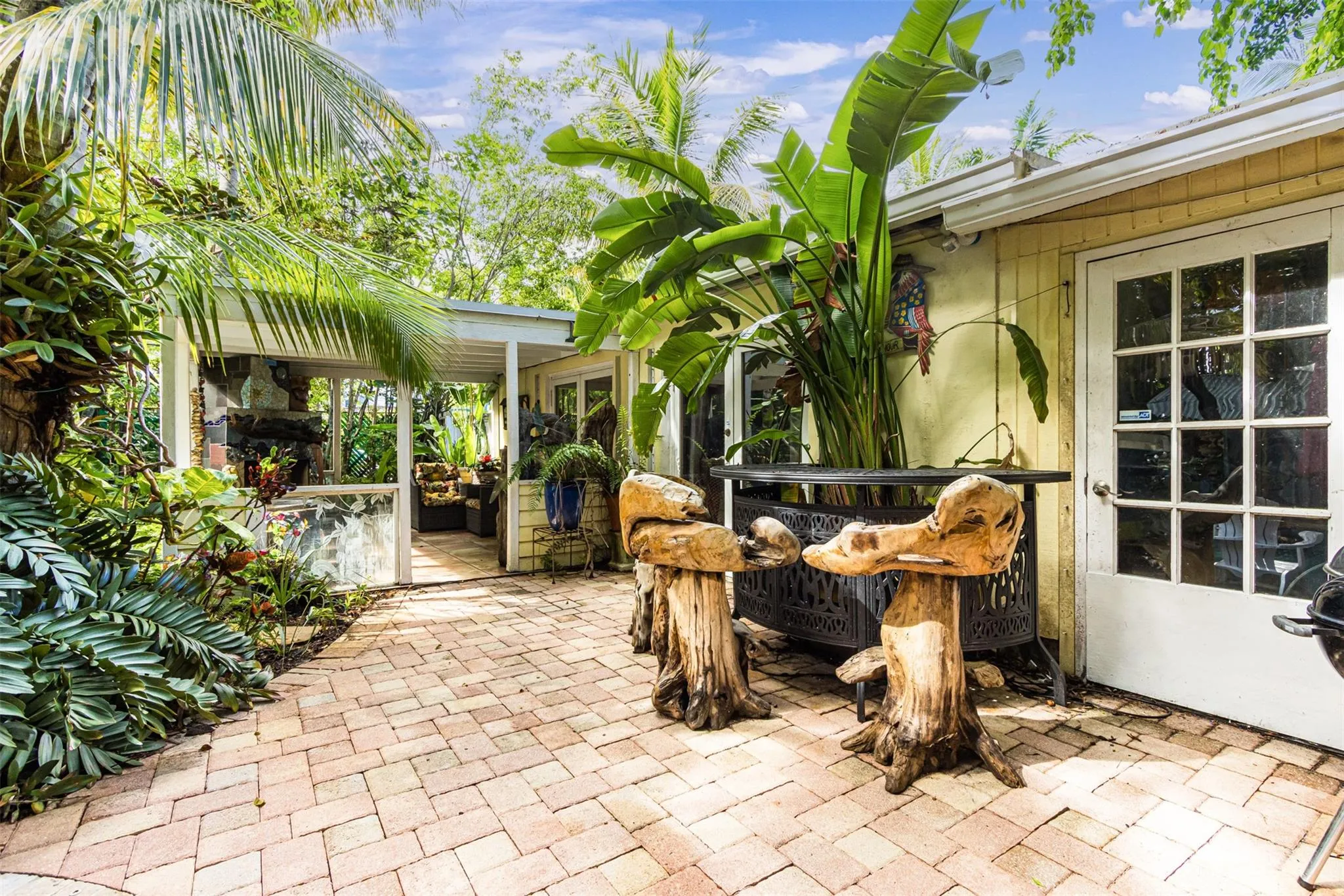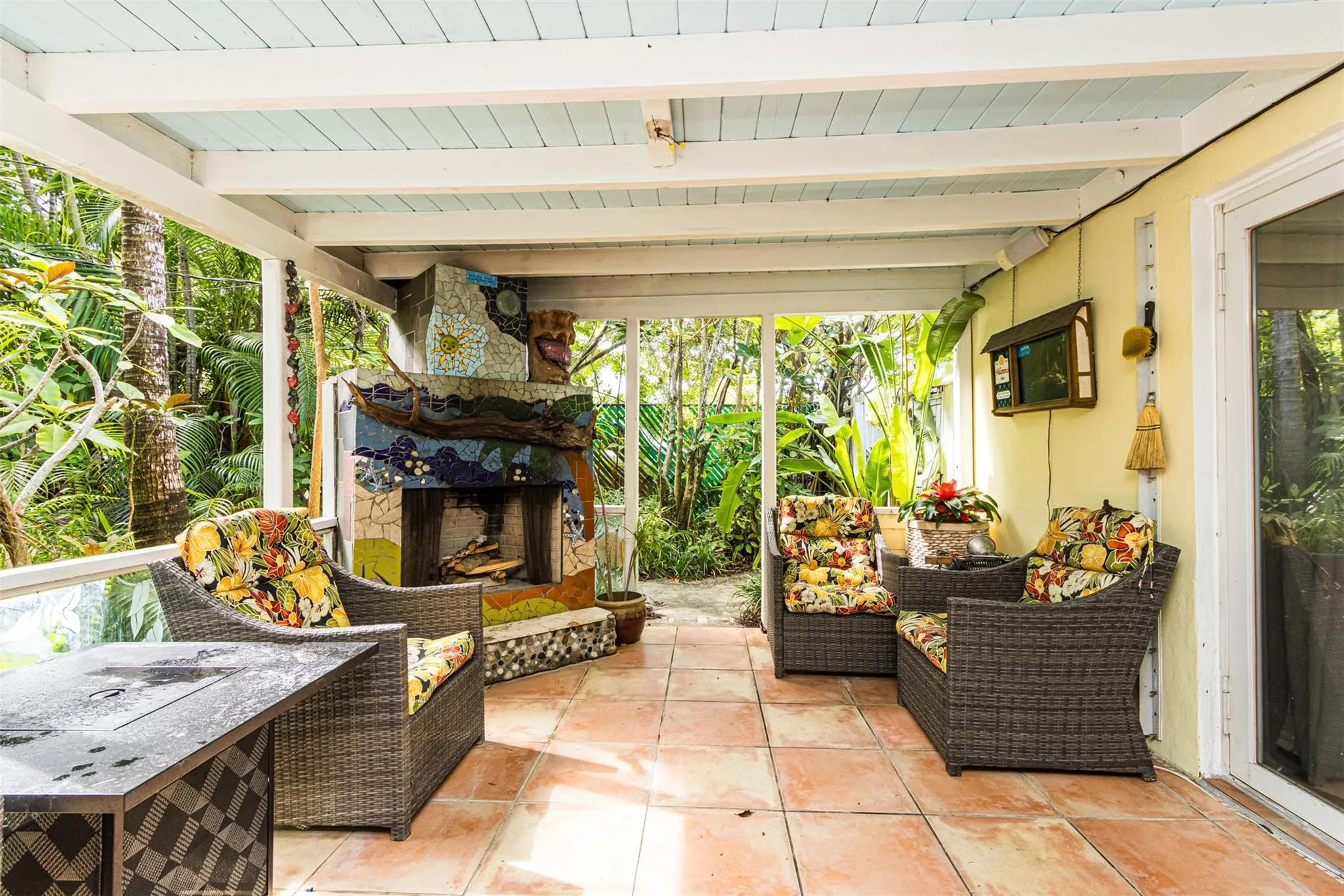 As you enter this unique home you will be captivated by its character & cool vibe and at that moment you will know that you have found that special place. Some upgrades include New Roof in 2020, New Oven, New Pool Pump & New A/C motor in 2025. Enjoy vintage woodwork on the doors & floors & Dade County Pine flooring in dining area, hallway & kitchen. Decorative fireplace features 1924 bricks on hearth. The living room floor is acid-stained concrete. This area offers a Dry Bar, Wine Cooler, a separate tool room, pantry and laundry room. The cozy outdoor Lanai features a working fireplace. The enchanting grounds & patio area gives total privacy & seclusion. The saltwater pool offers seating areas and umbrellas. Imagine being surrounded in your own tropical paradise! Come see and fall in love.