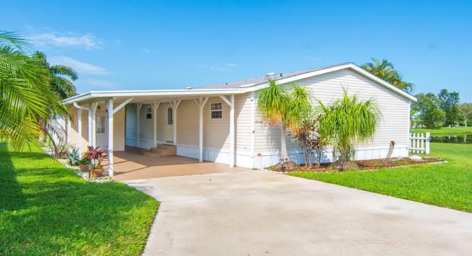 Charming waterfront retreat in Spanish Lakes Riverfront, a 55+ community nestled on a quiet cul-de-sac. This beautifully maintained 2-bedroom, 2-bathroom home offers 1,240 sq ft of spacious living with panoramic lake views that will take your breath away. Open kitchen comes with new appliances. Wake up to tranquil lake views and unwind with stunning sunsets from your living room. Vaulted ceilings and a flowing layout make entertaining effortless. The long driveway has an epoxy coating and accommodates up to four vehicles, plus a 2-car carport for covered parking and a storage shed. Enjoy golf, tennis, pool, clubhouse, and more in the vibrant Spanish Lakes Riverfront community. Whether you’re downsizing, or retiring, this home is ready to welcome you.