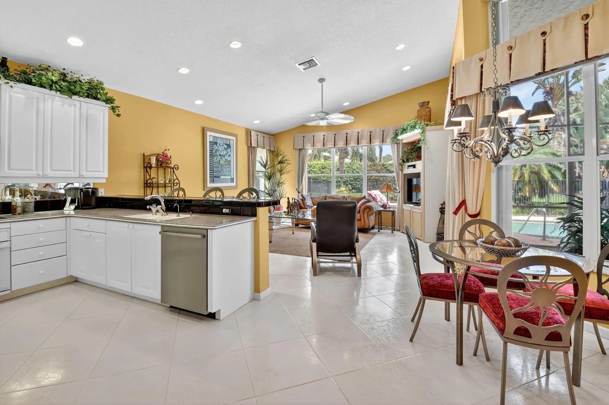 Immaculate 4BR/2.5BA Madrid on oversized lot with stunning pool. Elegant double-door entry opens to soaring ceilings and abundant natural light throughout. Gourmet kitchen features custom 42″ cabinets, granite counters with backsplash, connecting seamlessly to spacious family room. Sliders from both living areas lead to screen-enclosed patio with private pool – perfect for entertaining. Master suite includes his & hers walk-in closets, luxurious bath with dual vanities, separate shower and Roman tub. Beautiful tile flows throughout all living areas. 4th bedroom currently serves as den with custom built-ins. Community boasts fabulous newly refurbished multi-million dollar clubhouse offering tennis, pickleball, state-of-the-art fitness center, lakeside café and more activities.