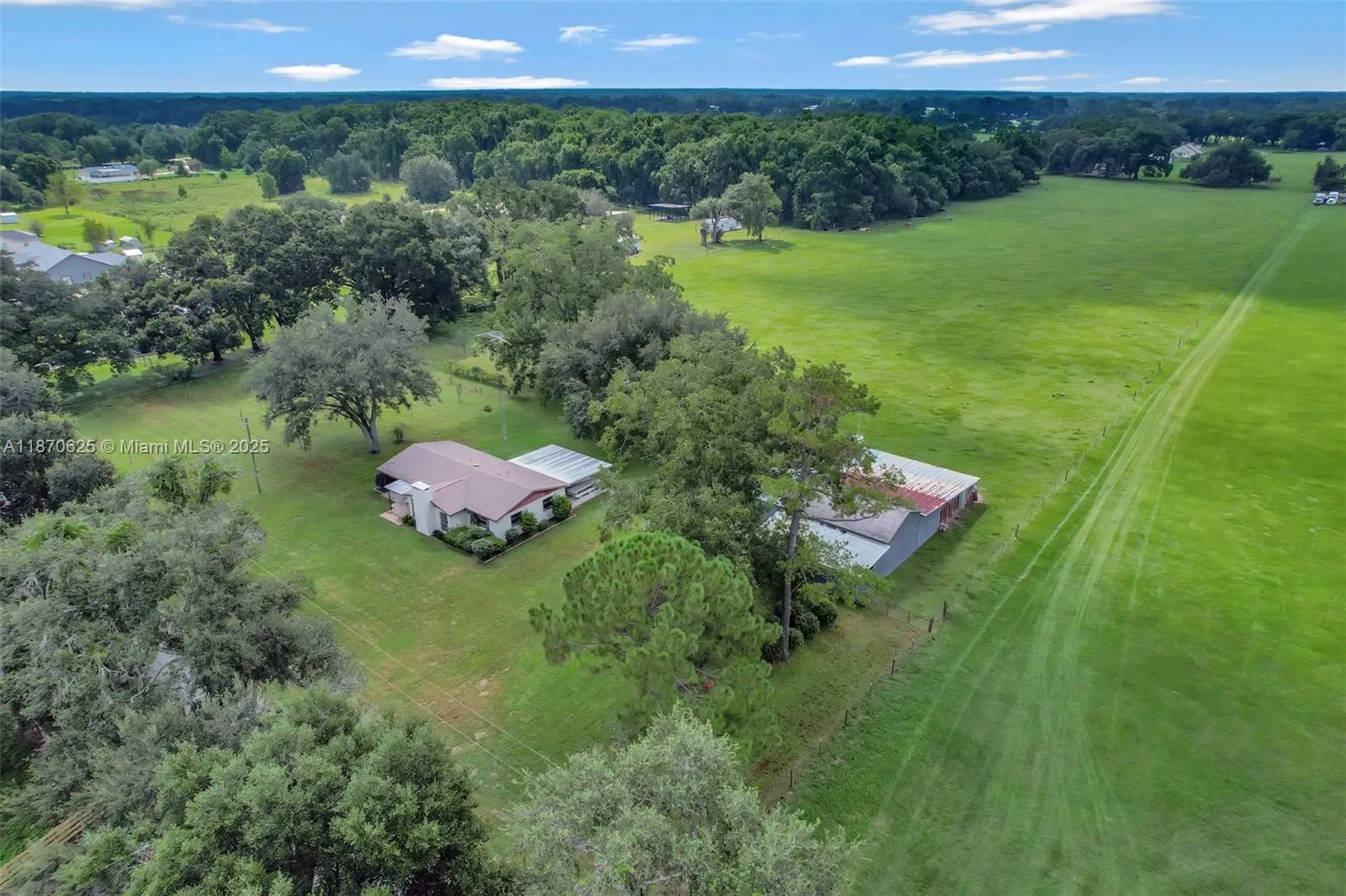 Private & peaceful this 10-acre Ocala homestead sits in the desirable Hwy 475 corridor offering a quiet country setting just minutes to city conveniences. Eight acres of lush, high and dry pastures are ready for horses, cows, goats, while the remaining acreage provides a charming backdrop for the 3BR/2BA home. Property features include a 30’x15’ enclosed garage, 40’x40’ pole barn, 40’x21’ shed row/lean-to, and multiple fruit trees. Inside, enjoy terrazzo floors, a stone fireplace, spacious dining area, galley kitchen, and a large covered patio overlooking the land. Just 27 minutes to the World Equestrian Center, near The Villages, Greenway Trails, and the Florida Horse Park this is the perfect retreat for equestrians, hobbyists, or anyone seeking space, privacy, and endless possibilities.