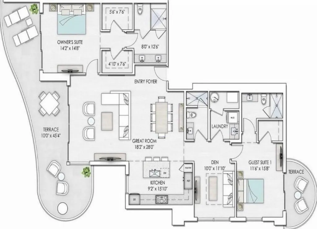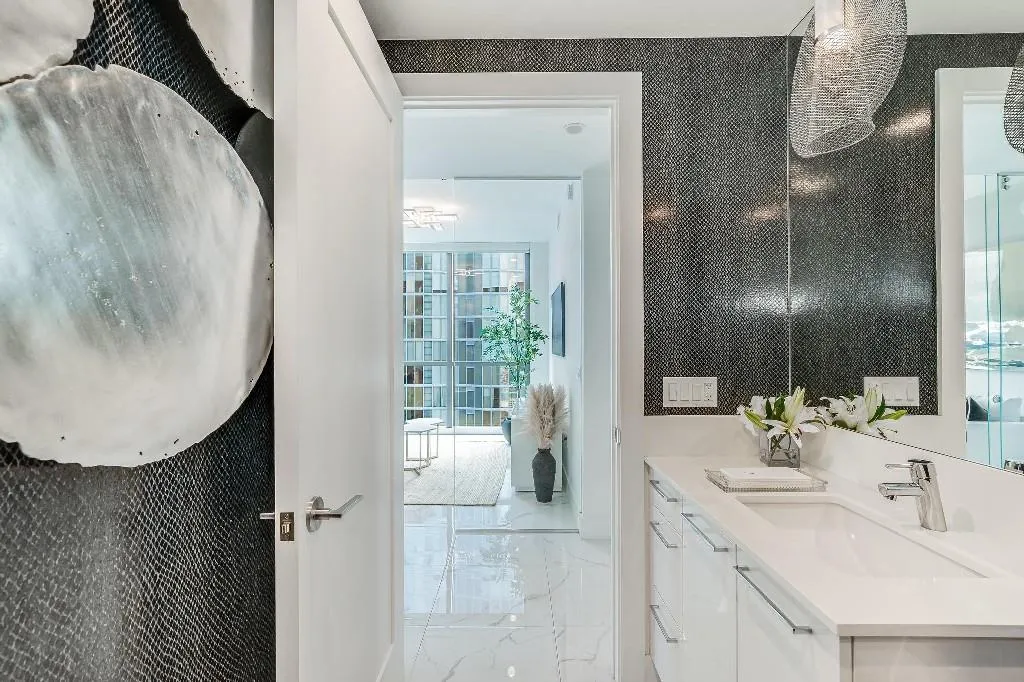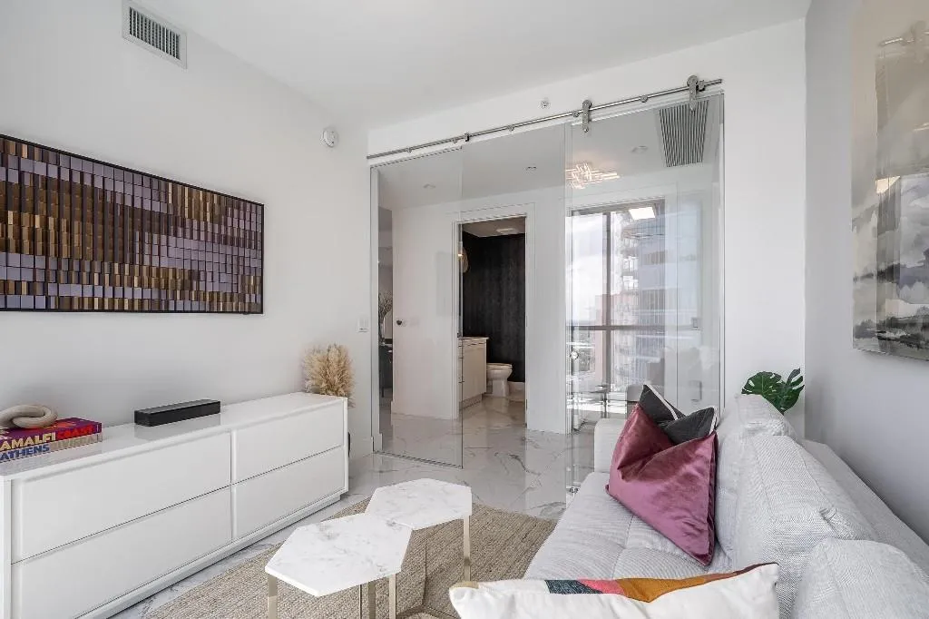 Sophisticated 30th floor residence in the premier 100 Las Olas tower, offering exceptional river, city, and skyline views from every room. This 2-bedroom + den, 3-bath layout is one of the building’s most desirable floor plans, featuring 9’ floor-to-ceiling windows and an expansive 550 sq ft wraparound terrace. Interior upgrades include porcelain tile flooring, quartz countertops, motorized blinds, custom closets, designer lighting, and built-ins. The flexible den functions as an office or optional 3rd bedroom. Two premium side-by-side EV-ready parking spaces included. Enjoy full-service luxury living with high-end amenities and immediate access to the dining, shopping, and energy of Las Olas.