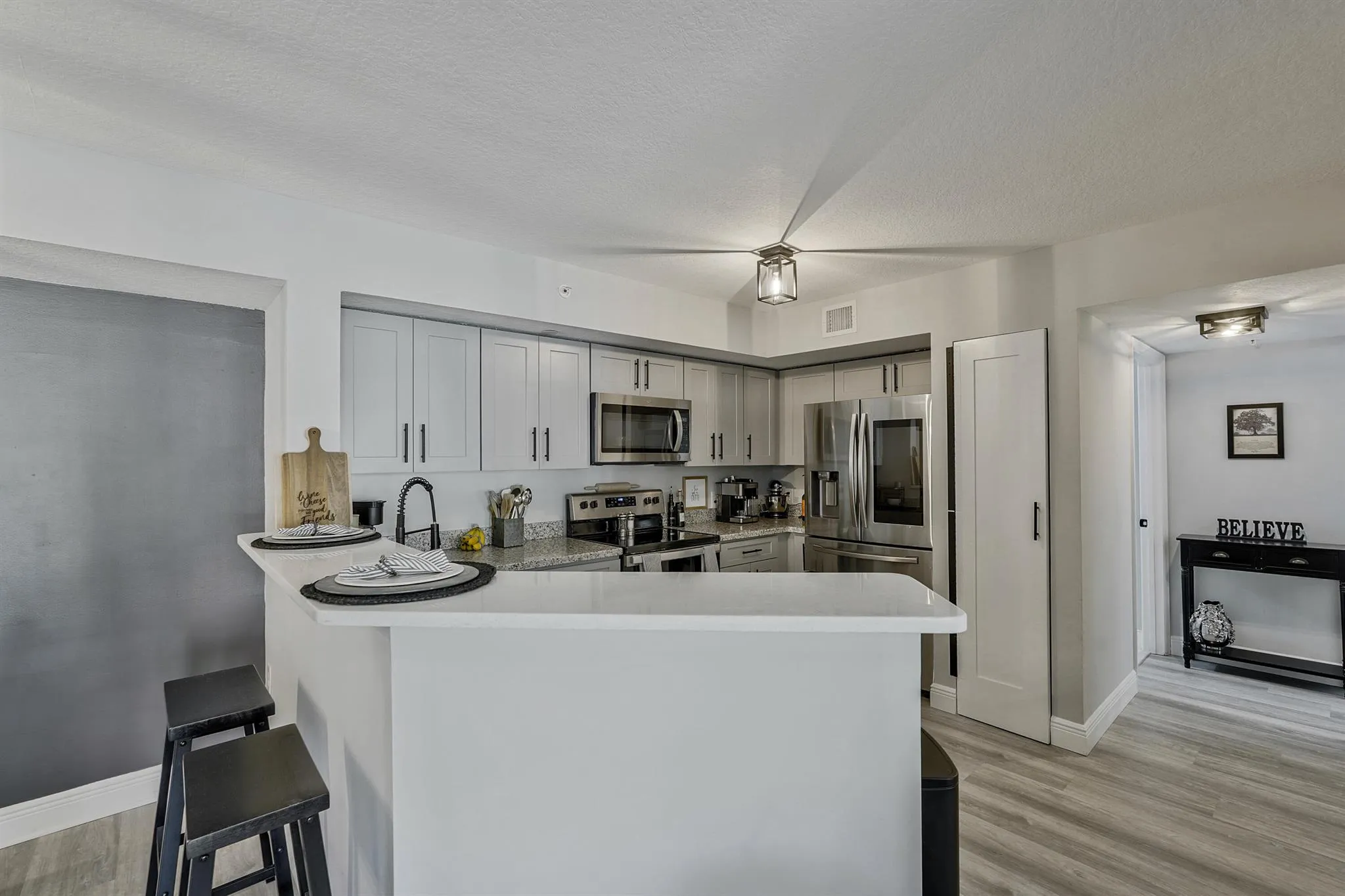 Motivated seller! This rare gated 3-bedroom corner condo is flooded with natural light and fully renovated in 2025. The home features new flooring, soft-close shaker cabinetry, matte black hardware, custom barn doors, Alexa smart fridge, refreshed baths, updated lighting, new ceiling fans, and a stunning stone breakfast bar. A/C (2023), W/D (2023), roof (2022). Some furniture negotiable.Set within Emerald Isle’s resort-style community, residents enjoy a relaxed, amenity-rich lifestyle: sparkling pool, hot tub, gym, racquetball, tennis/pickleball, playground, and gated security. HOA includes cable, internet, water, trash, and exterior maintenance, making this a truly turnkey, low-maintenance home perfect for full-time living or a lock-and-leave escape. Fully updated and move-in ready!
