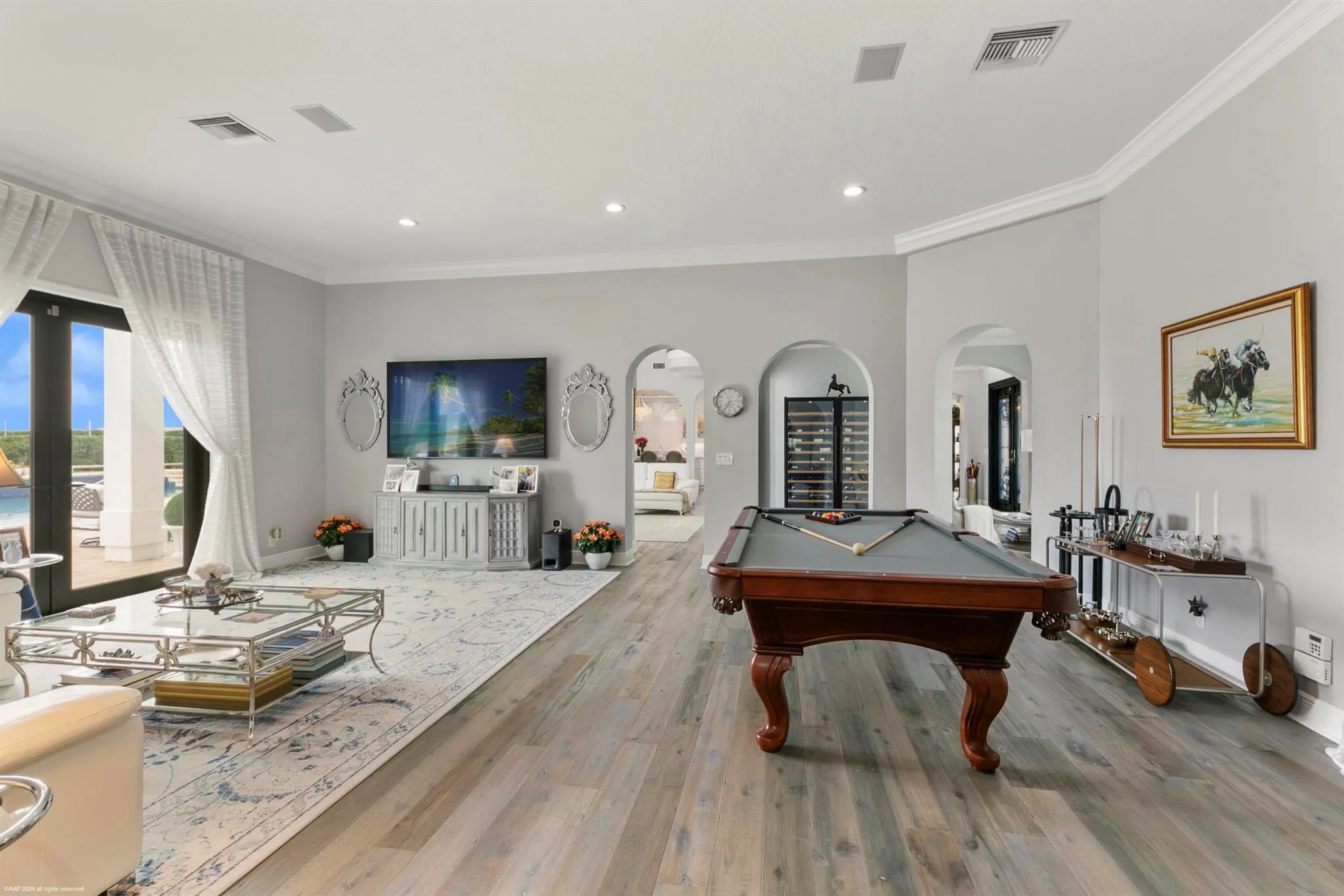 With no expenses spared, this completely renovated Southfield’s of Palm Beach Polo Club Estate is situated on 5 private polo fields. One of best locations in town! Appraised at $5.73M (June 2025), this turn-key 5 bed, 4.5 bath, 4,619 sq. ft. home is just a short golf cart ride from all equestrian show grounds. Enjoy this 5 Star resort style estate with gated entry, heated 88ft long salt-water pool, pickleball court, and full outdoor kitchen. Stunning interiors with soaring ceilings, picture windows, spiral staircase, and chef’s kitchen with 120” marble waterfall island. Upgrades include new hurricane-proof windows/doors, 5 new remodeled baths, new ACs, Sonos audio, security cameras, water-leak detection, and whole-house generator.