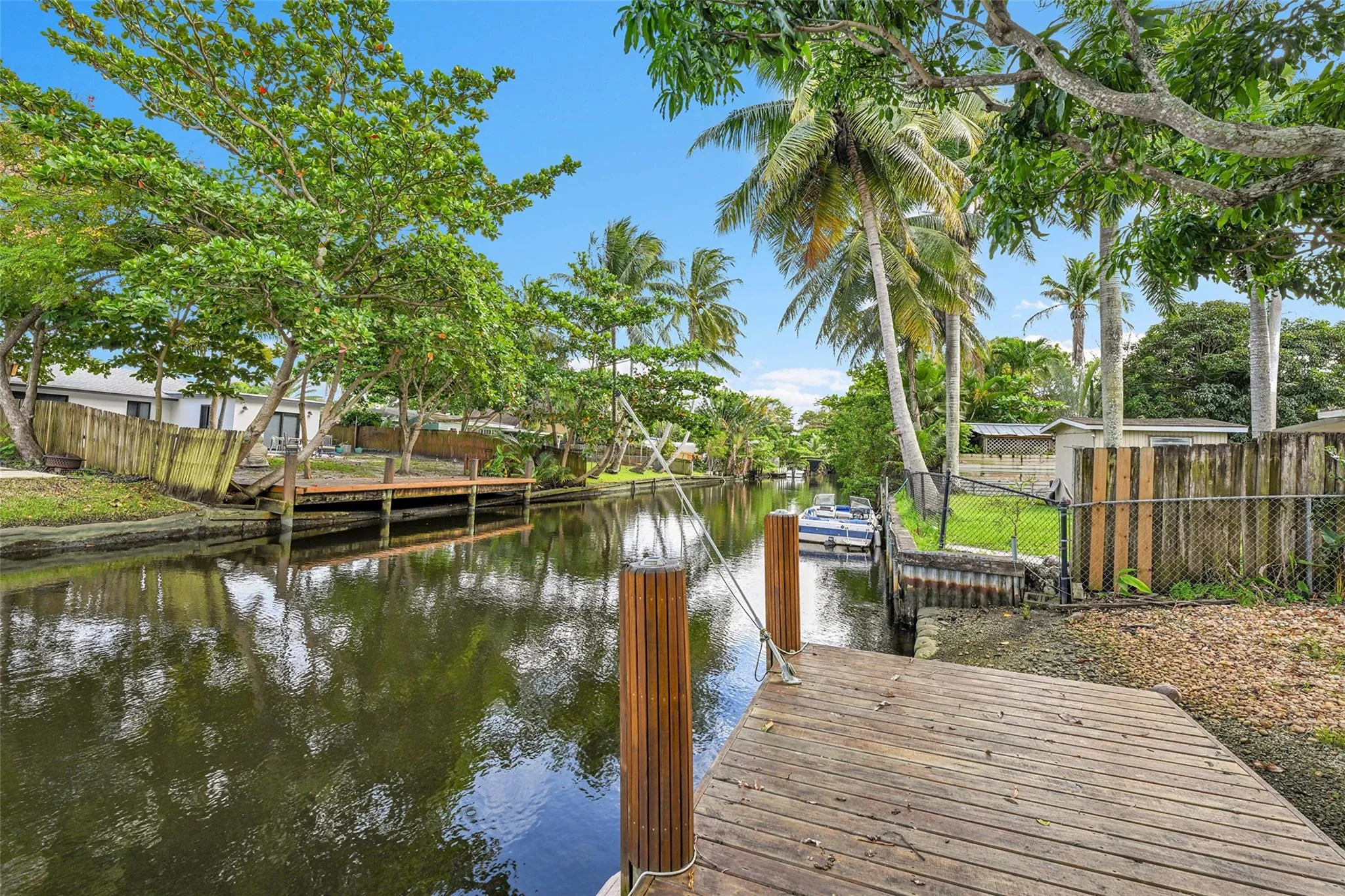 Charming 3-bedroom, 2-bath home tucked away in a quaint section of Fort Lauderdale. The tropical backyard retreat features a newer dock on a waterway with one fixed bridge and direct access to the ocean—perfect for boating or fishing enthusiasts. Inside, find an inviting layout with a bright living room featuring a skylight, a versatile Florida room, and a dining area that flows seamlessly into the gourmet kitchen. The kitchen boasts quartz countertops & an elegant design ideal for cooking & entertaining. Plantation shutters throughout add warmth & style. Additional highlights include: impact windows (except 1 door), washer & dryer, and a 2 car garage. This home combines tropical tranquility with modern upgrades—a true waterfront lifestyle just minutes from all Fort Lauderdale has to offer