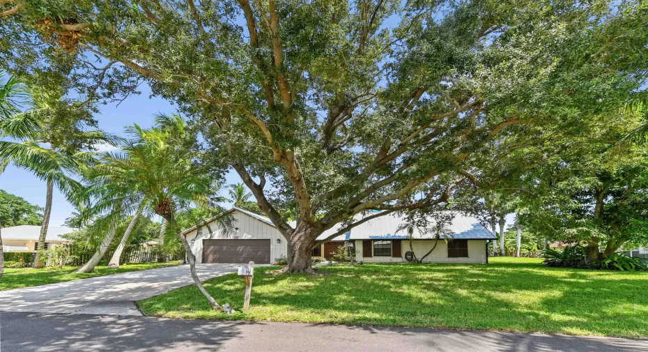 Welcome to this charming and beautiful 3 bedrooms and 2 bathrooms home, perfectly situated on a quiet desirable Hobe Sound community. The home offers immediate curb appeal, featuring a durable, modern NEW metal ROOF and a lush, tropical setting with mature shade trees and palms. Step through the handsome double entry doors into a welcoming interior defined by an open floor plan and bright tile flooring. The living room is a true centerpiece, boasting a dramatic, high vaulted ceiling with exposed wood beams and a cozy built-in area, creating a warm and expansive space for both relaxation and entertaining.