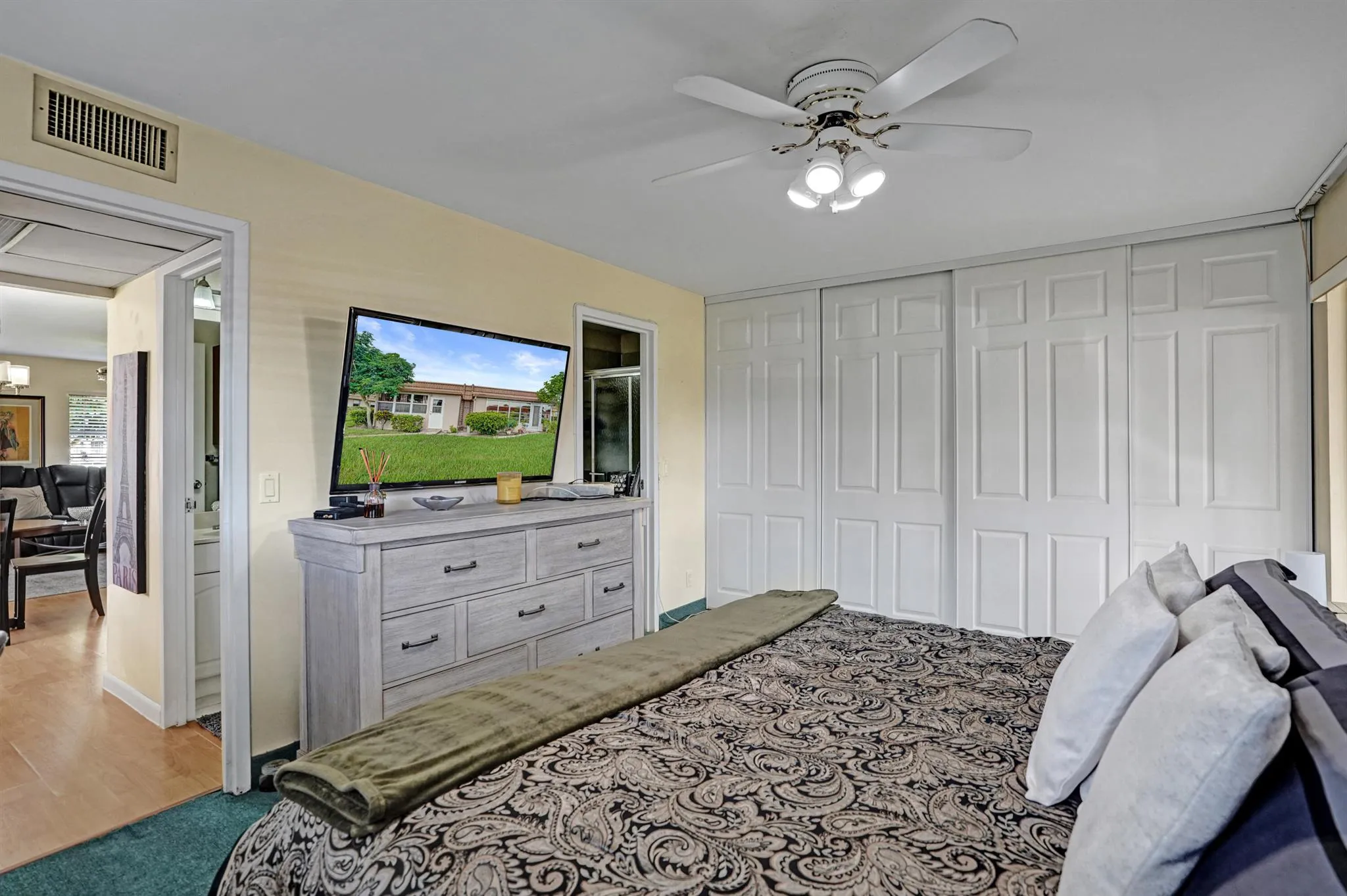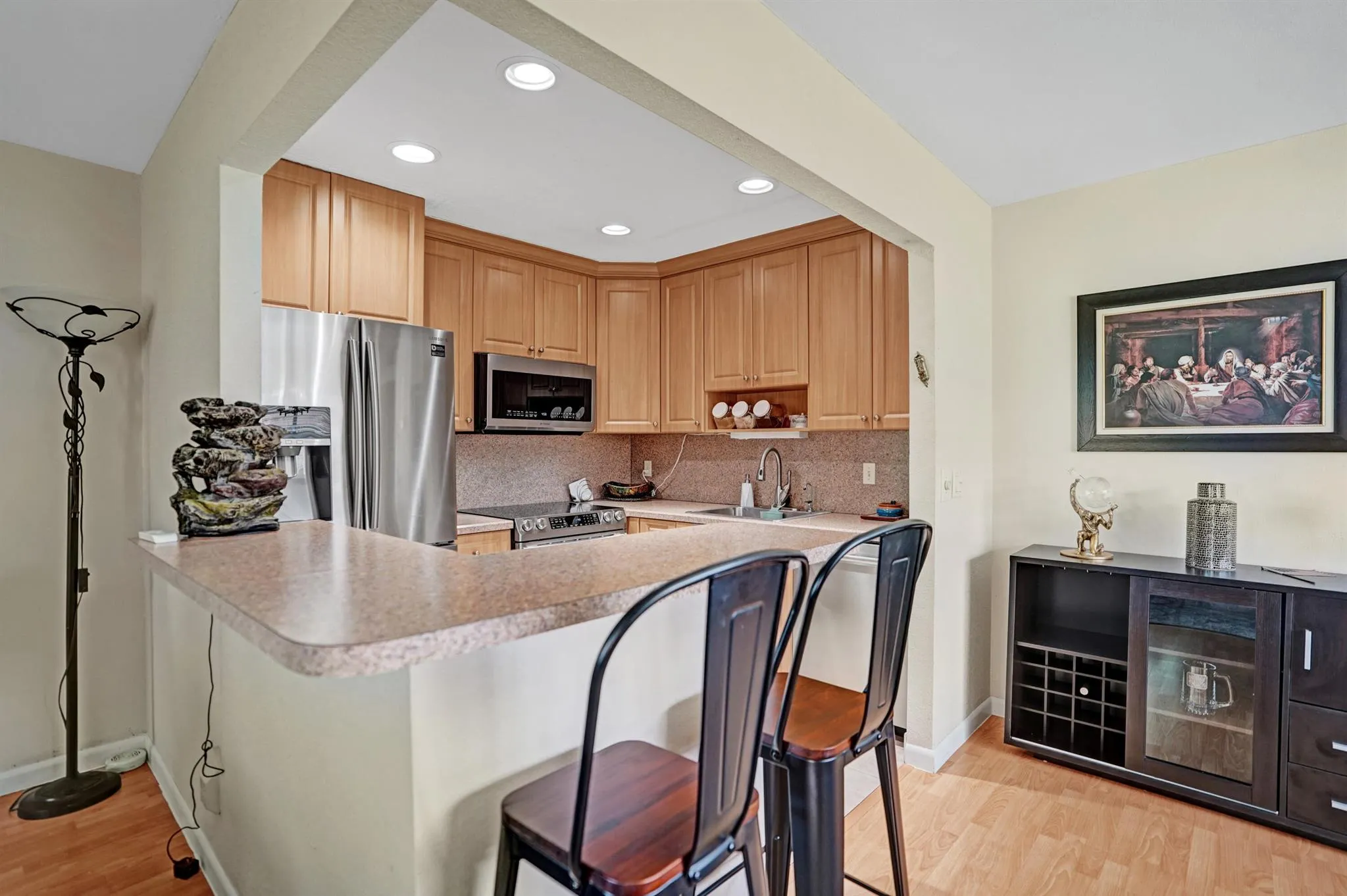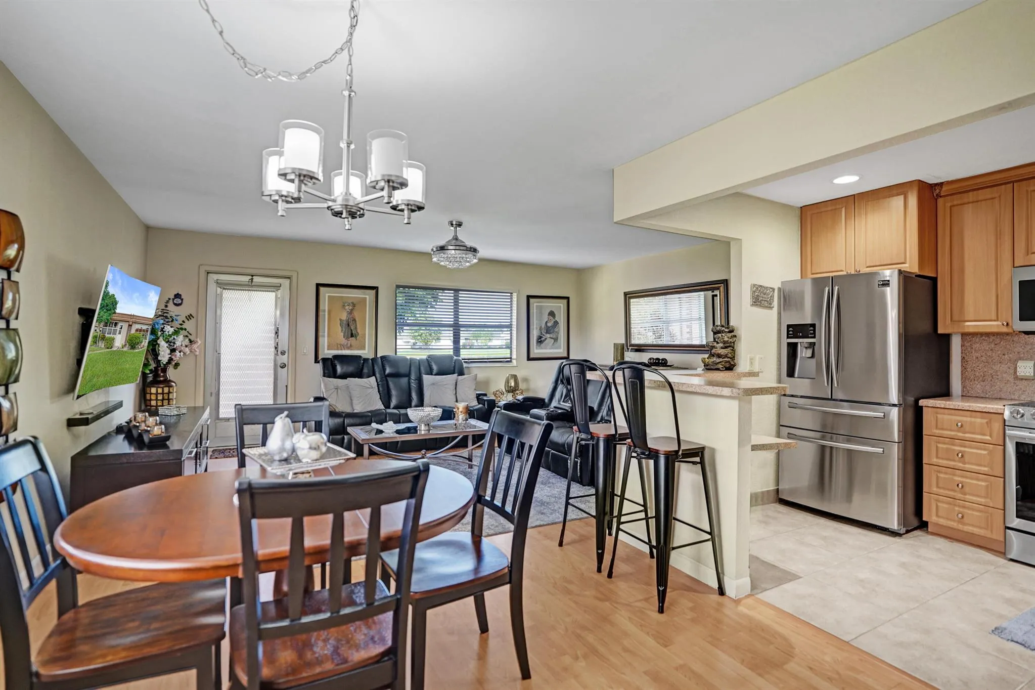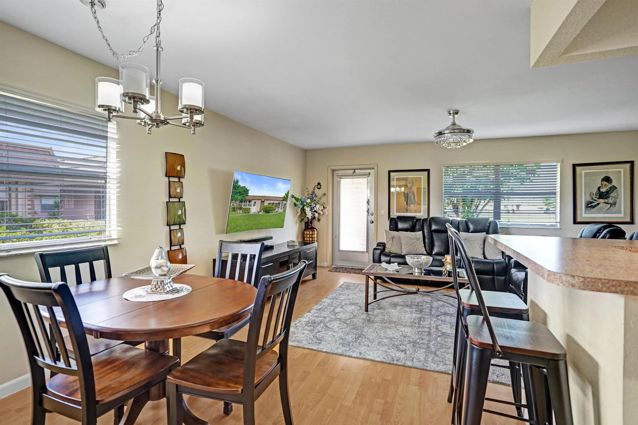 Beautiful and sparkling fully furnished unit with a wonderful lake view from the living room. Florida room has impact windows and wall a/c for comfort. Great open wood cabinet kitchen with bar seating stainless steel appliances and