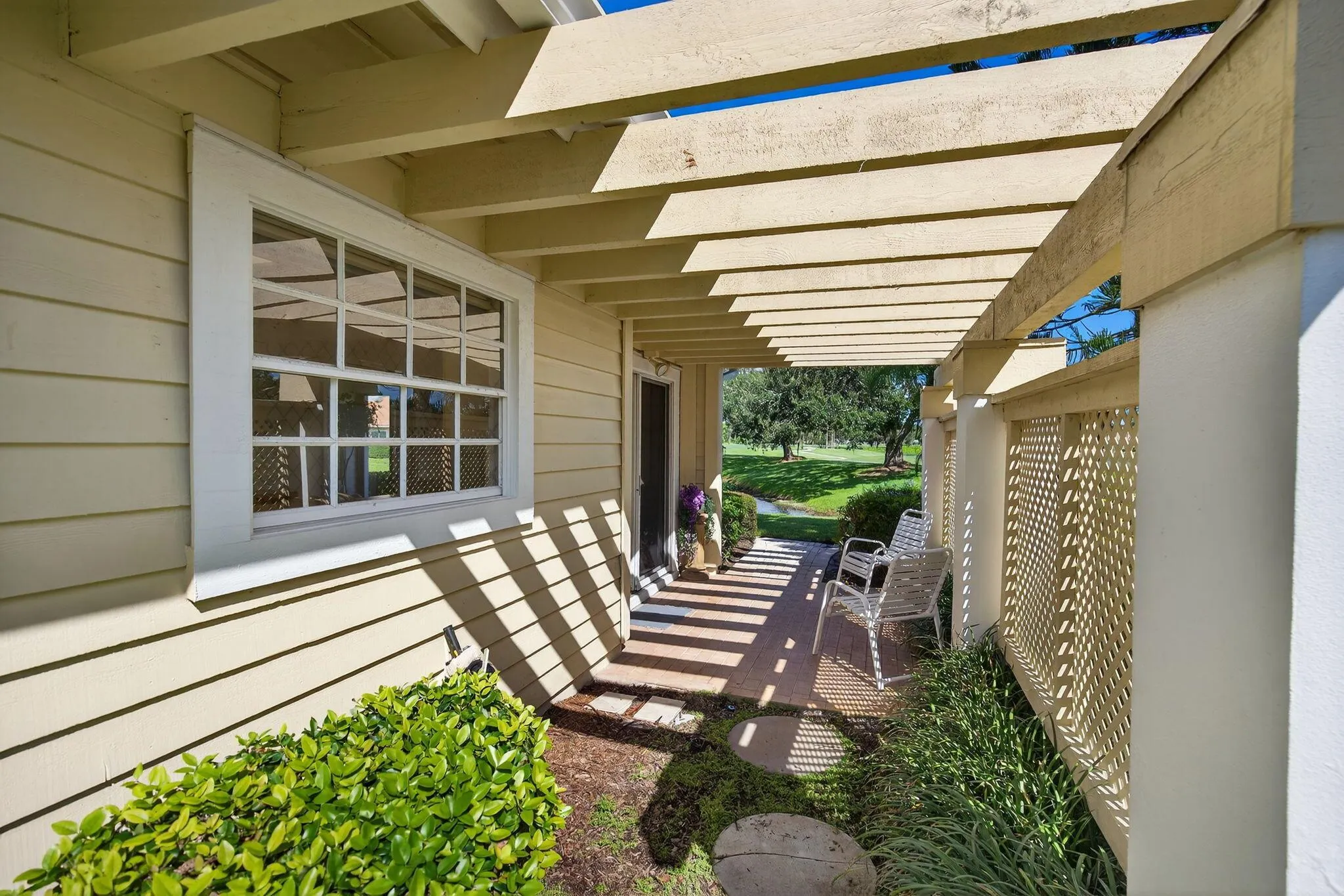 Desirable Winged Foot Cottage with Water & Golf Views! Welcome to this charming Winged Foot Cottage, offering a split-bedroom layout. The third bedroom, with two closets, is currently used as a den but can easily serve as a guest room or home office. Enjoy serene water and golf course views from the light-filled sunroom, the perfect spot to relax with a morning coffee or evening glass of wine. The kitchen opens to a casual breakfast area & patio, ideal for grilling or dining outdoors. A separate dining area provides plenty of room for entertaining. The spacious primary suite features a large walk-in closet, double sinks, soaking tub, and separate shower. Additional highlights include a spacious laundry room and a garage with a dedicated golf cart space. Lush new carpet just installed
