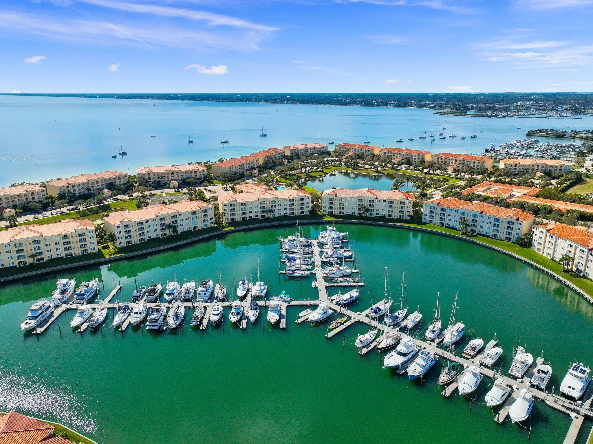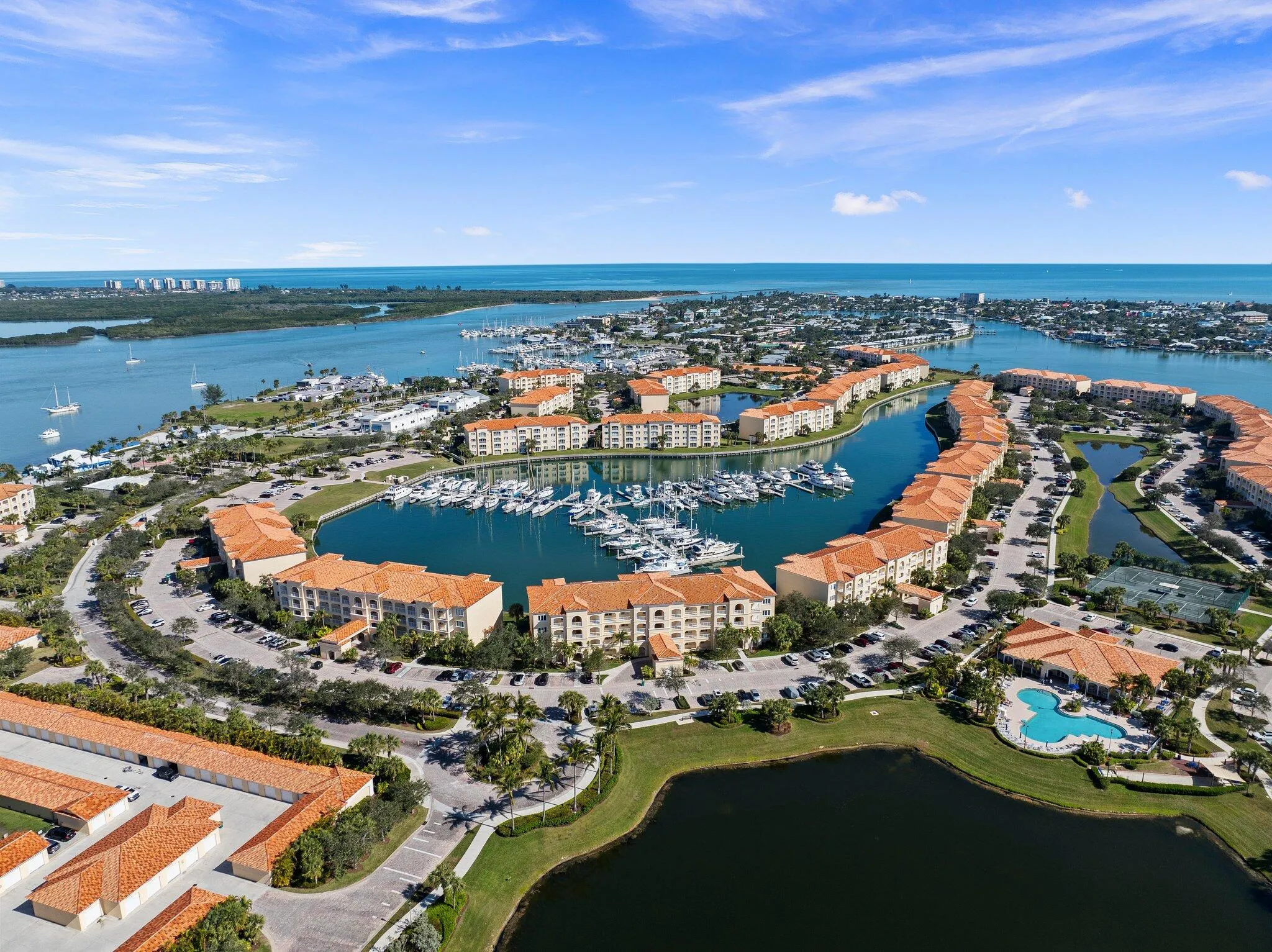 New stainless kitchen very soon! 2005-built. An hour north of Palm Beach! Fabulous penthouse marina-view at Hutchinson Island’s renowned Harbour Isle on much-faved Hutchinson Island. 1989 sq ft superbly designed by DiVosta for spaciousness with 10′ ceilings almost throughout. Bldgs 11-19 sunrooms enjoy great indirect light with almost no direct sunlight glaring in! NO WEIGHT LIMIT FOR DOGS! Free internet & cable, luxurious tropic-feel pool, hot tub, tennis courts, bocce ball,,Social committee with lots of fun activities, clubhouse, renovated gym, sidewalks around lovely large ponds which feature gorgeous birds, 24-hr manned security. The renowned Fort Pierce Inlet beach is walking distance. Seaway Dr is home to favorite bars & restaurants, with lots of music! 1.5 mi to beach.