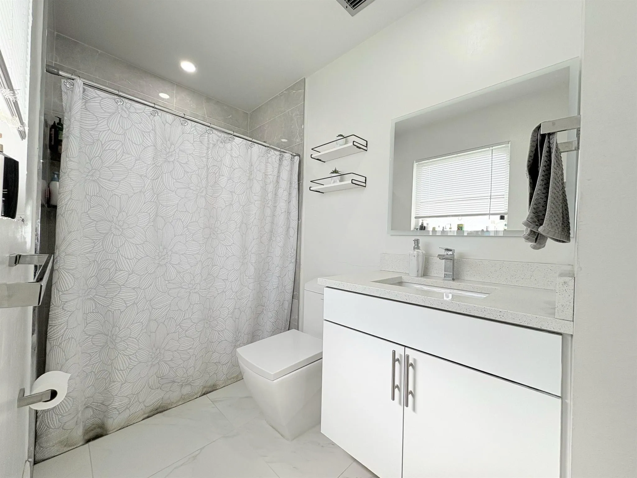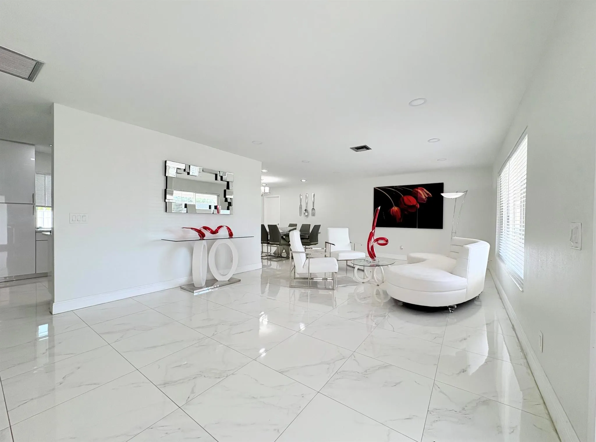 Step into modern elegance in the heart of Lake Clarke Shores with this fully updated 3-bedroom, 2-bathroom pool home offering the perfect blend of designer style and South Florida relaxation. From the moment you arrive, the clean lines of the circular driveway, crisp white facade, and sleek metal roof deliver serious curb appeal, setting the stage for what’s to come inside.The interior showcases a luminous open-concept layout, where high-gloss marble-look porcelain tile flows throughout the main living areas. Crisp white walls and contemporary recessed lighting create a bright, airy atmosphere complemented by expansive windows that flood the home with natural light. The living space features bold modern furnishings and sculptural accents,