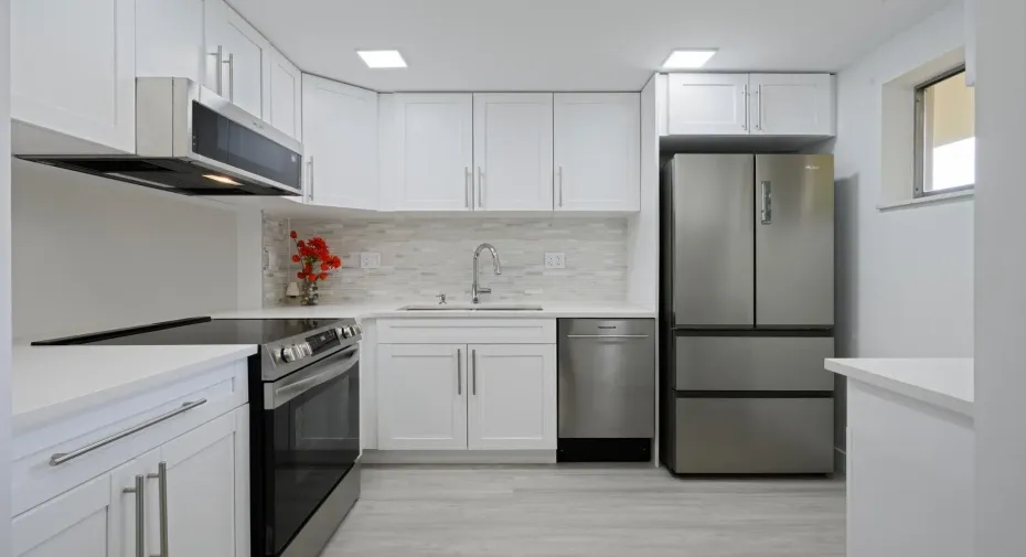 Be the first to live in this fully renovated 2-bed, 2-bath first-floor condo, redesigned with modern luxury in mind. Both bathrooms feature brand-new, high-end finishes, including a spa-like walk-in shower in the primary suite. The stunning new kitchen offers white shaker cabinets, quartz countertops, and new stainless-steel appliances. Neutral luxury vinyl plank flooring flows throughout the open living/dining space, leading to an enclosed patio–ideal for relaxing or entertaining. Updates include a new electrical panel, new fixtures, and accordion/roll-down shutters. Stylish, turnkey, and never lived in since renovation! Located in the highly sought after Lake Clarke Gardens, an age 55+ community with amenities that include 2 heated pools, sauna, exercise room, billiards room, & BBQ area