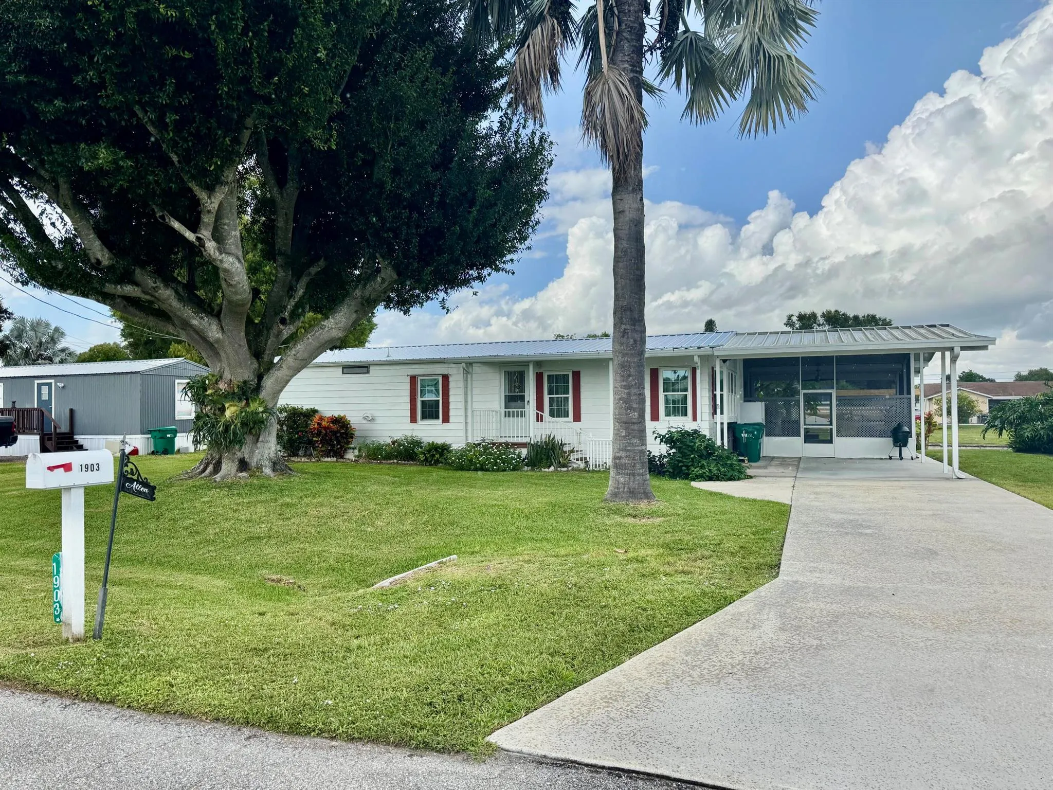 TAYLOR CREEK ISLES~Lake ”O” access! Pristine 2Bd/ 2Ba DWMH w/ 2Carport. Beautiful open concept. Renovated Chef’s dream kitchen, 9′ island, cooktop, double oven, coffee bar, pullout shelves and lots of extras. 15×24 grand room, skylight, panoramic view of water. Master suite has double barn door walk in closet. Remodeled Baths. NEW LVP flooring. Lovely 17×14 screened Lanai.16×20 open patio with retractable awning. Back ramp access. Shed, Fenced. Papaya, banana, avocado and orange trees. Seawall, covered floating dock. PERFECTION at its FINEST! Dimensions are approximate, must measure for exact