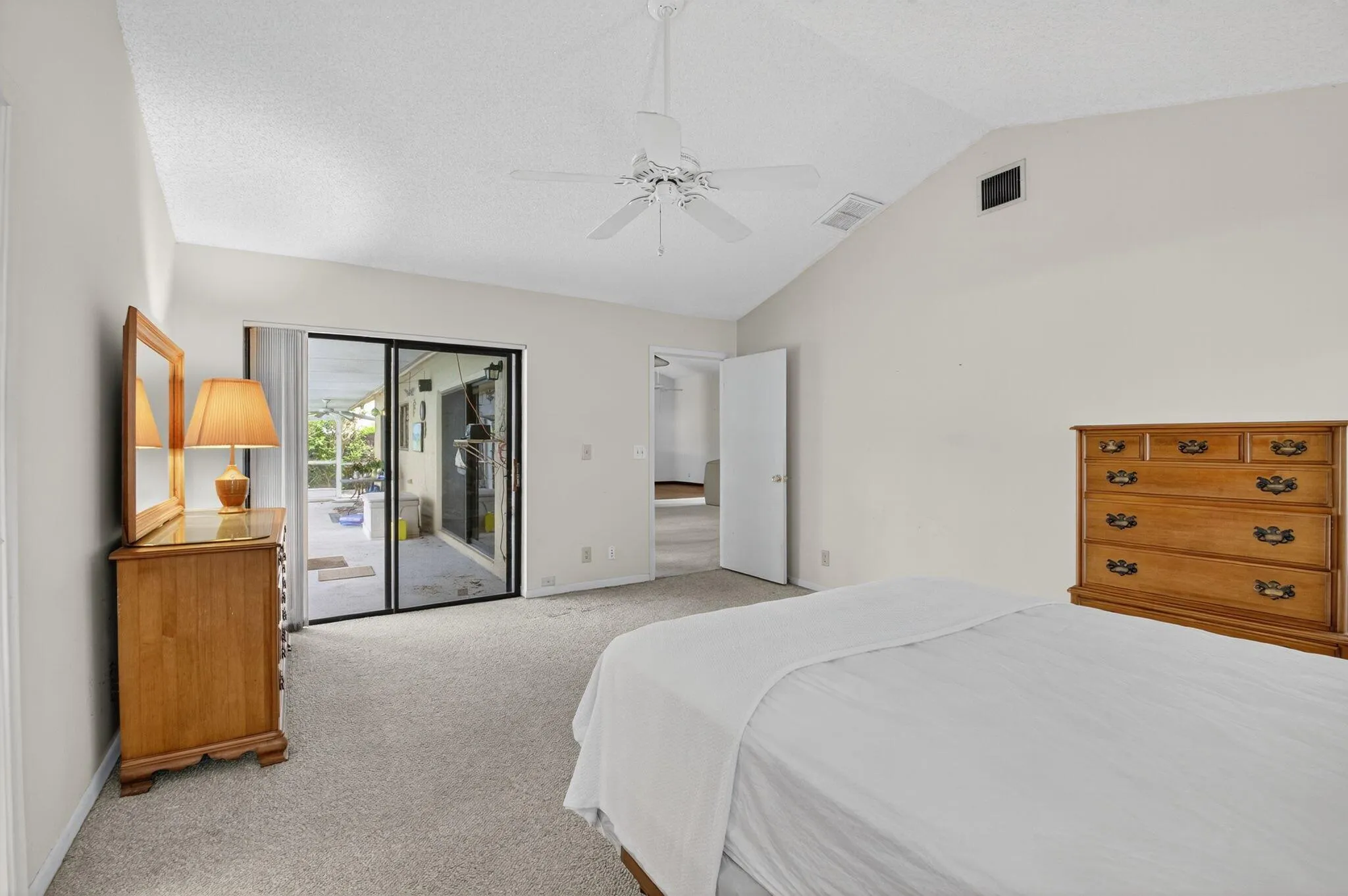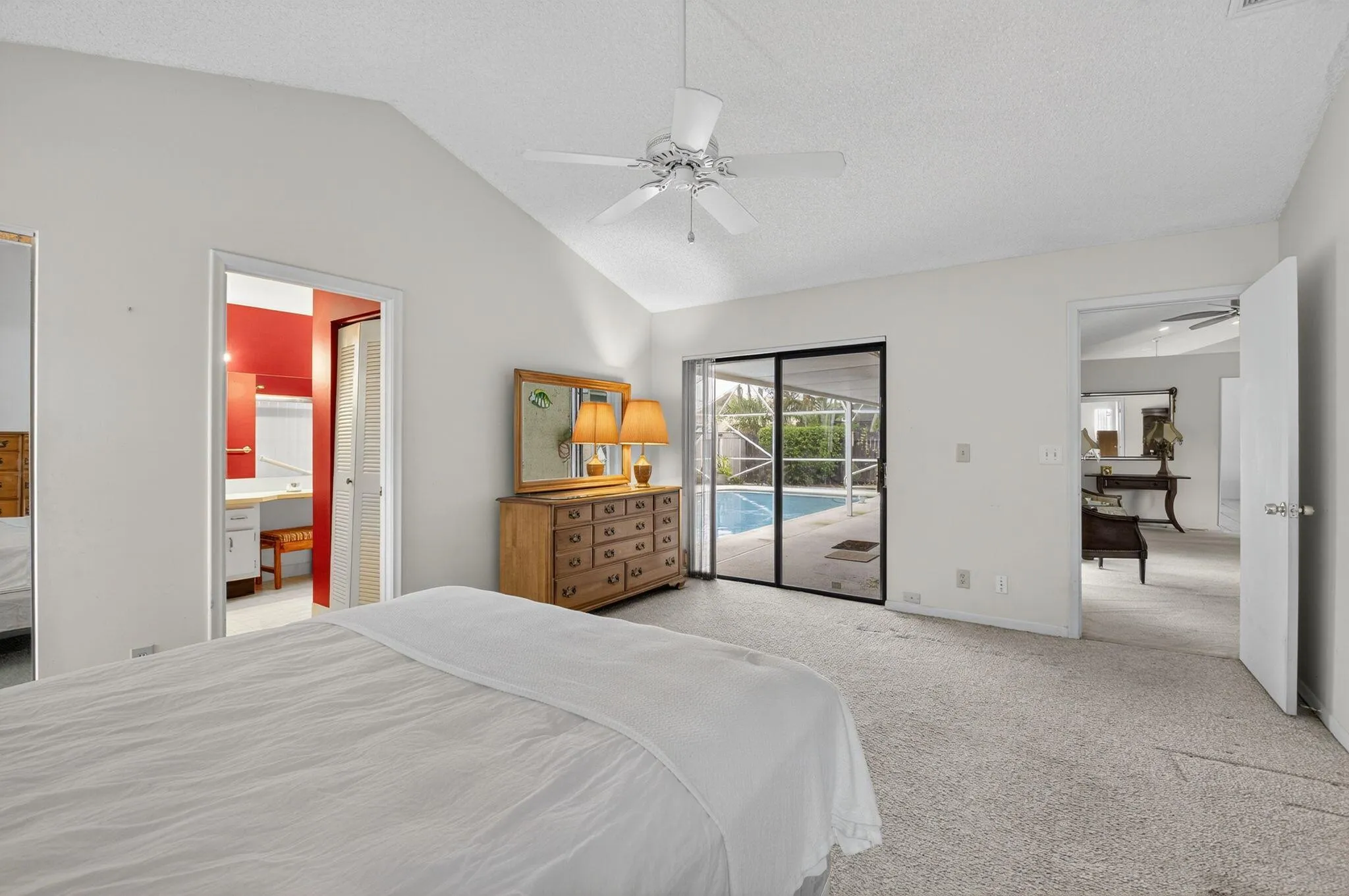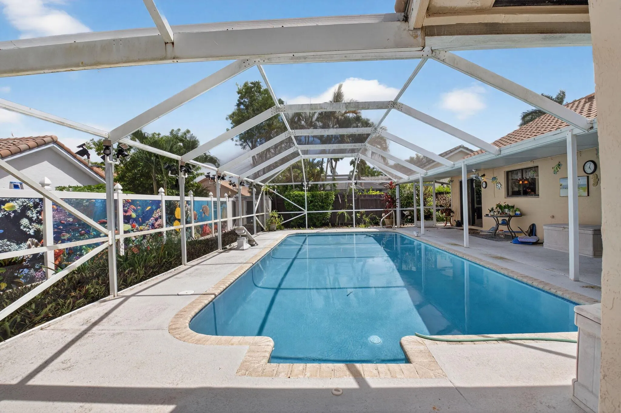 Welcome Home to this open layout 3 bedroom, 2 bathroom, 2 car garage pool home. As you enter the home, see the high ceilings and open layout. Great open space ready for your personal touch. Primary bedroom has it’s own entrance to the pool and a walk in closet. Light and bright. Large covered patio with an inviting pool. Great quiet neighborhood with a community pool, playground, tennis and pickle ball courts and sidewalks. Enjoy!