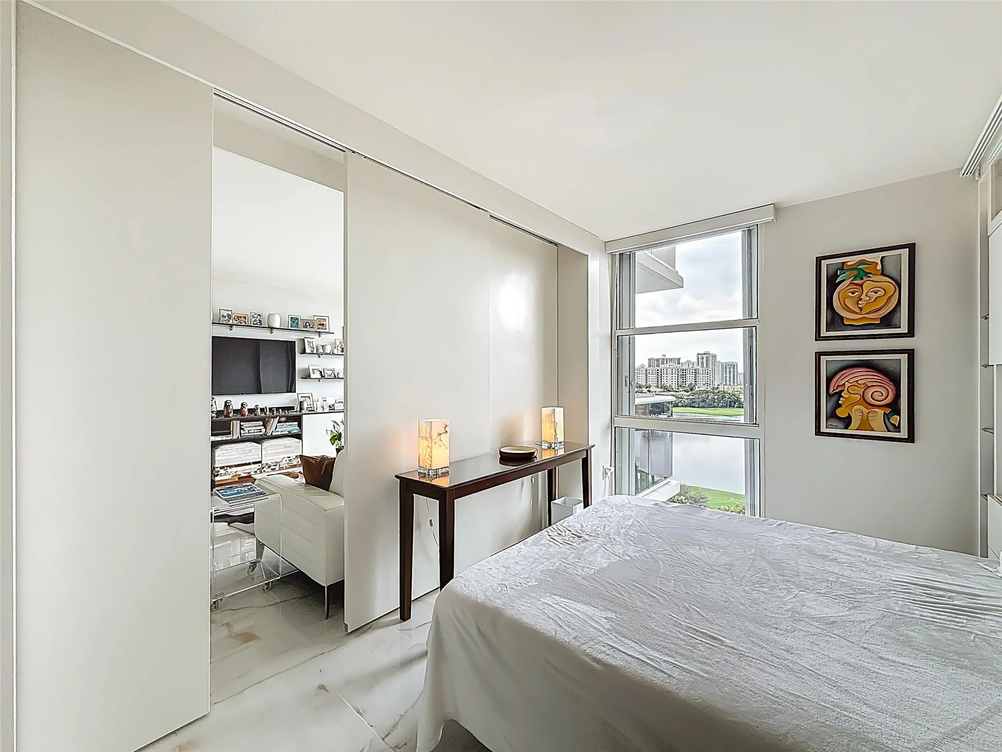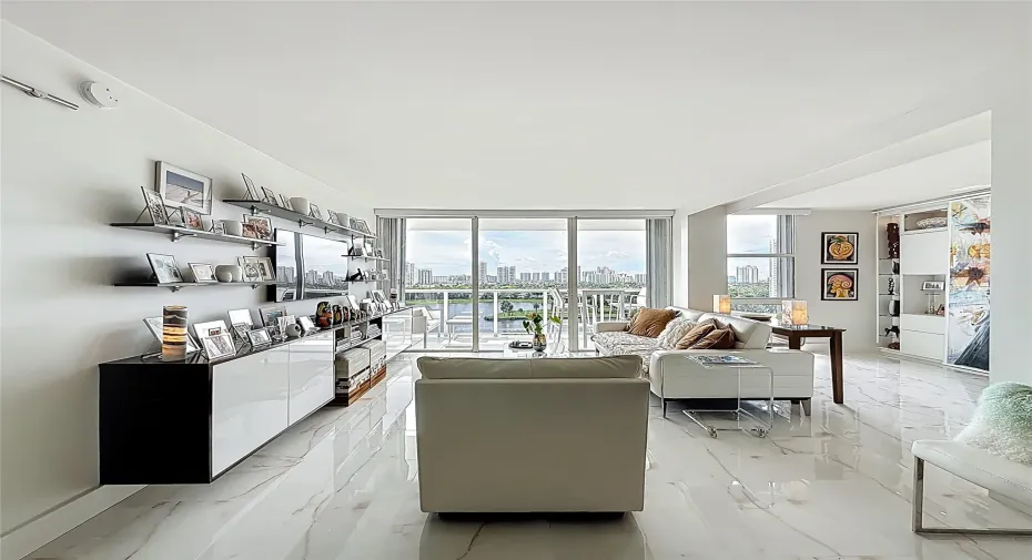 Architect’s residence with turnkey fully furnished option. 180-degree views of sunrises over the ocean, majestic sunsets, shimmering moonrises & serene lake reflections. Innovative living area seamlessly integrates the LR, DR & 2nd BR for open concept, but can be portioned into an office/bedroom w/ a panel pocket wall system. Artfully concealed Murphy bed creates a BR w/ closet & en-suite bathroom. Interior features: 3D accent walls, exquisite mother of pearl tile, custom kitchen, bar w/ built-in cabinets, entertainment center w/ floating shelves, motorized blackout shades, WIC, lots of storage, hurricane shutters & deeded parking (2nd available). Location is on the Soffer nature trail & Turnberry lakes…Walk to Aventura mall, restaurants, houses of worship, dog park, horse track