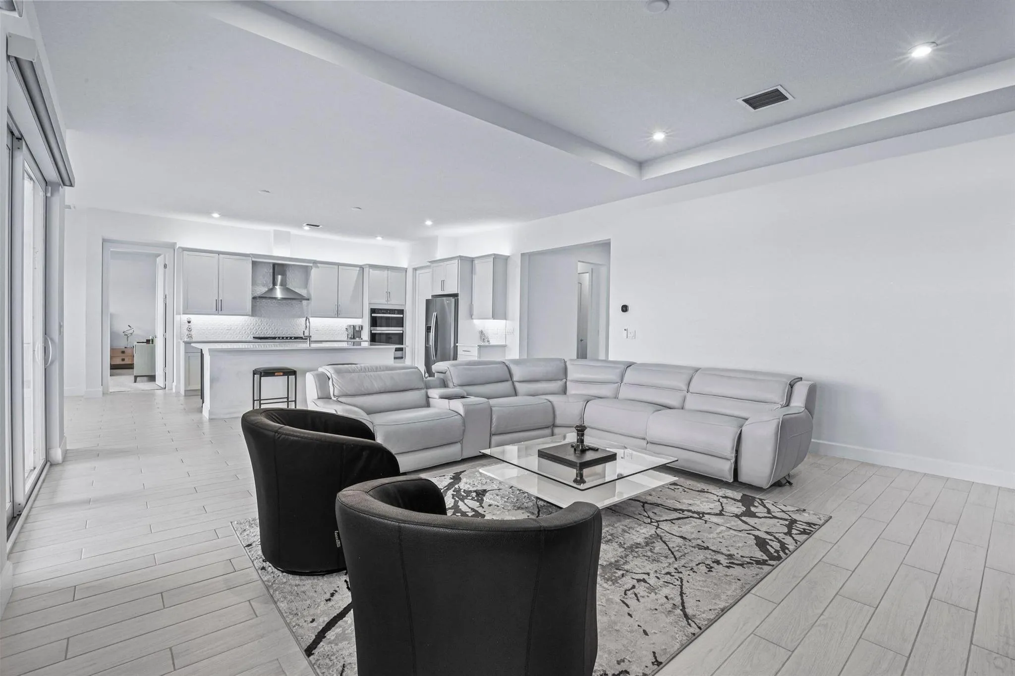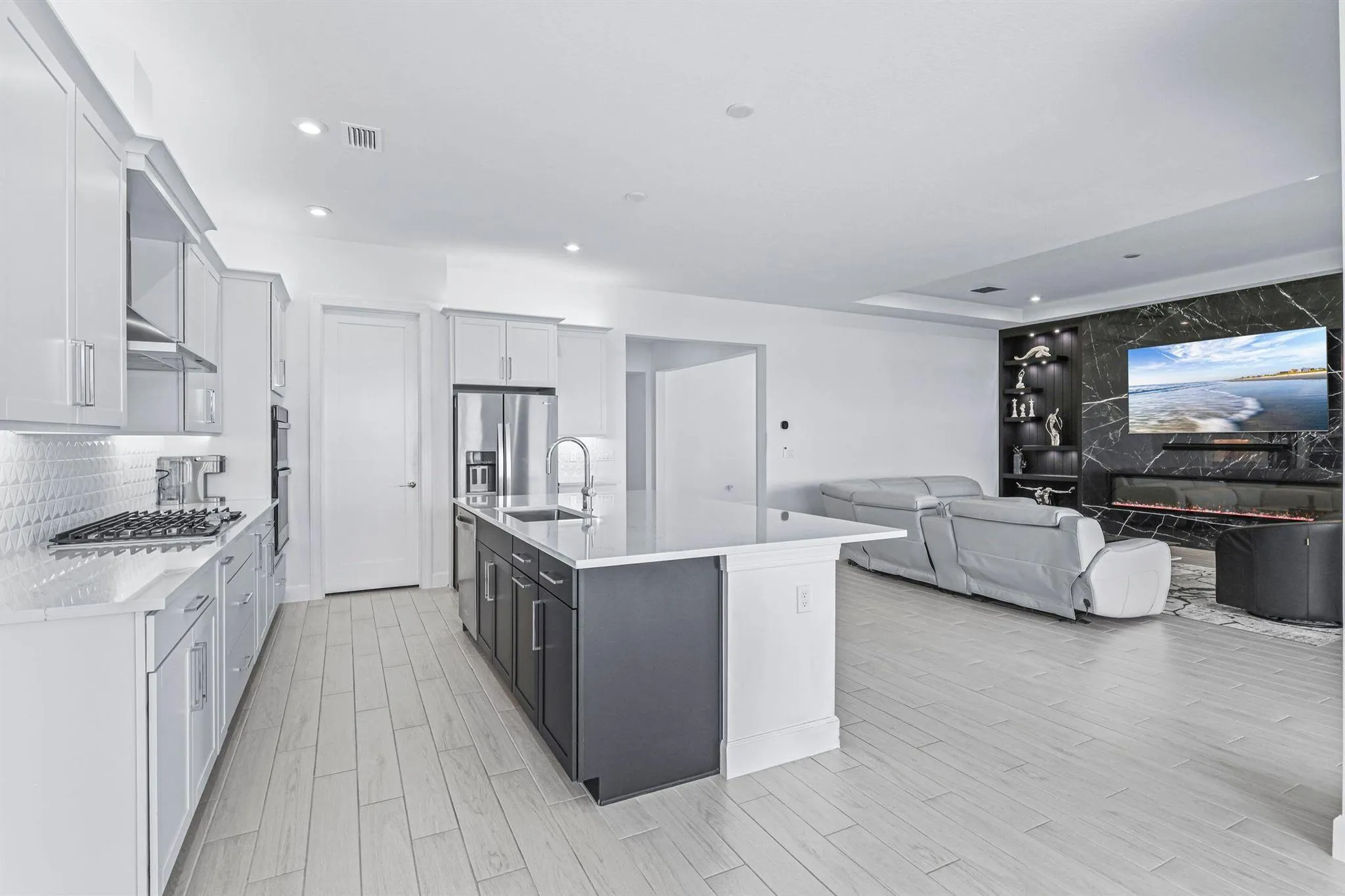 Luxury Living in Seville – A Rare Corner Homesite with Long Lake ViewsImpeccably crafted in 2024, this elegant residence showcases refined finishes, timeless design, and one of Seville’s most desirable corner lots. With expansive long lake views as the backdrop, the home offers a perfect blend of sophistication, comfort, and serenity.Inside, soaring ceilings and oversized wood-look tile floors create a bright, airy atmosphere. The open-concept great room is anchored by a striking custom porcelain fireplace and triple sliding glass doors, seamlessly connecting indoor and outdoor living.The gourmet kitchen is both stylish and functional, featuring quartz countertops, sleek cabinetry, double wall ovens, and a gas cooktop–perfect for everyday living or entertaining. The owner’s suite