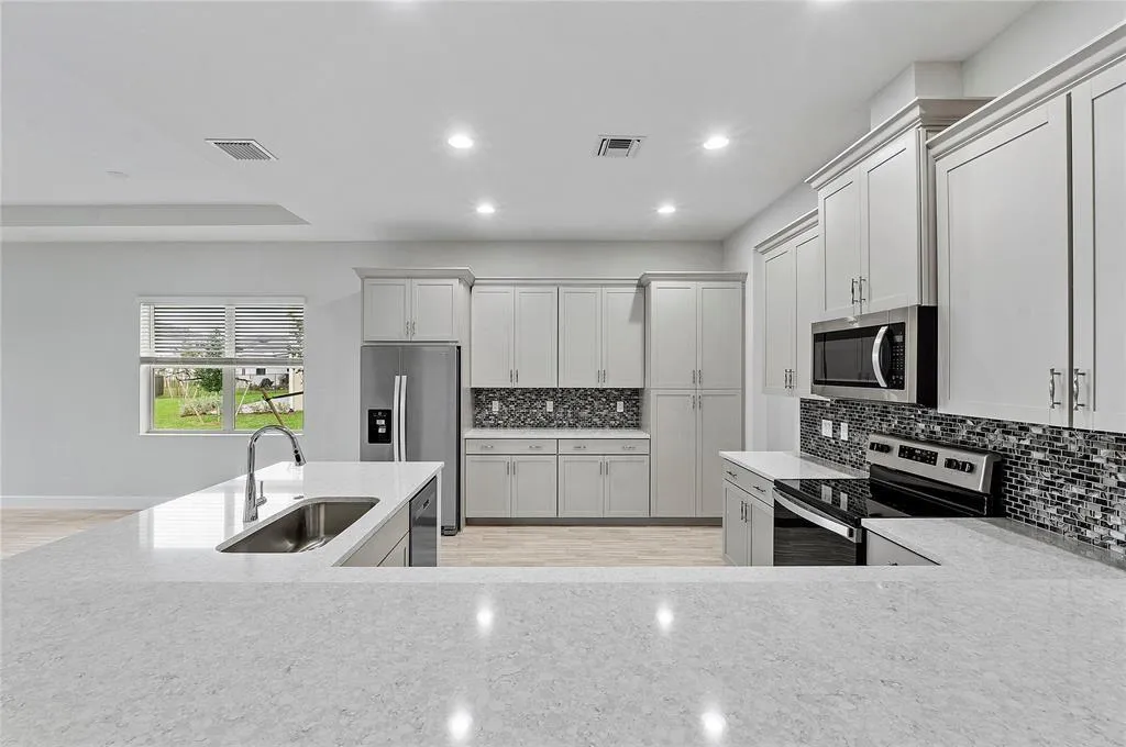 Move into this Lakefront Beauty with 5 bedrooms 5 bathrooms, and 2 car garage. Beautiful Model home with volume ceilings, a gourmet kitchen, and Quartz countertops, complete with an extended breakfast bar to bring it all together. Impact windows throughout, a huge backyard, and a lovely covered screened patio area. This secure community has an amazing Clubhouse with an outdoor patio and vacation-style amenities such as a resort-style pool, Kids play zone, Bocce Ball, Picnic Areas, and a top-of-the-line fitness center.